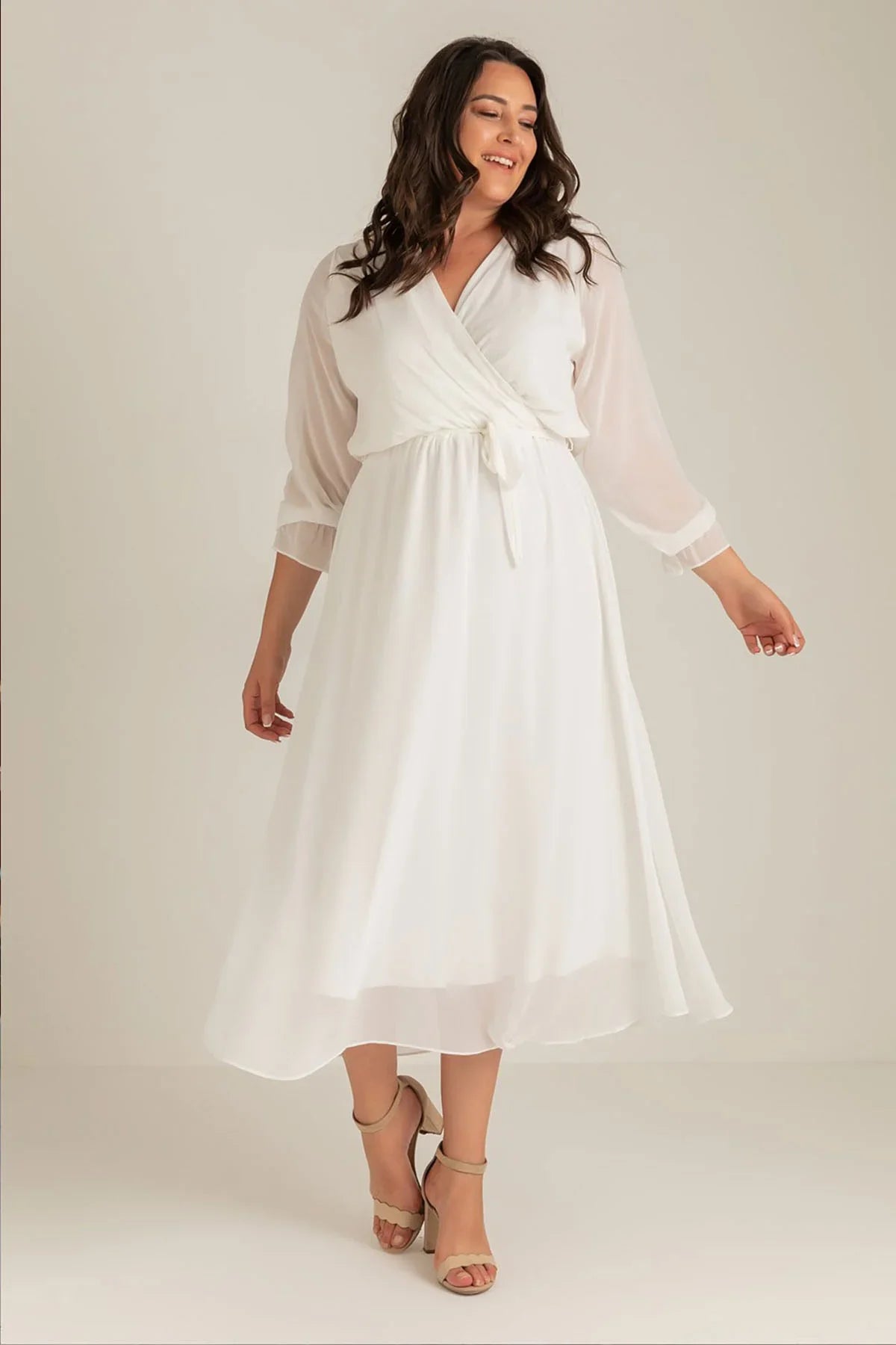 Beyaz Kruvaze Yaka Şifon Büyük Beden Elbise