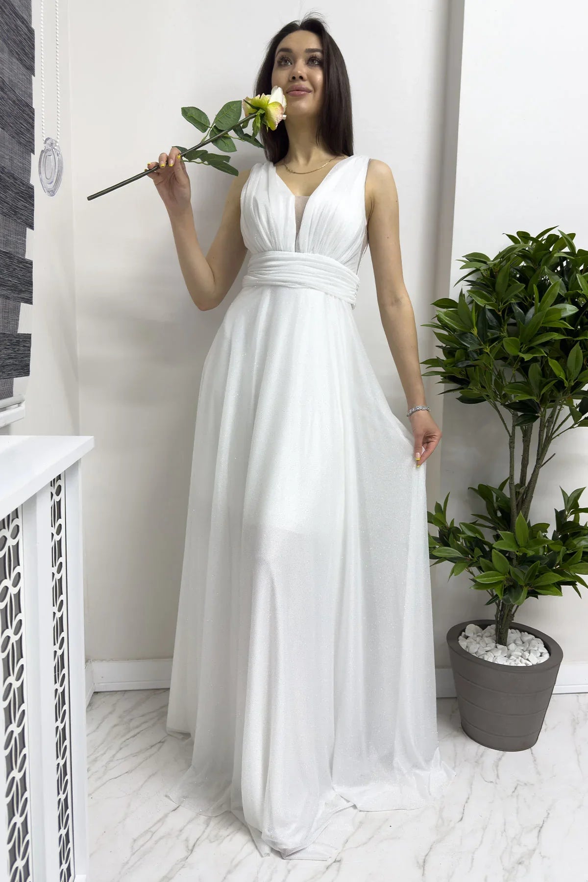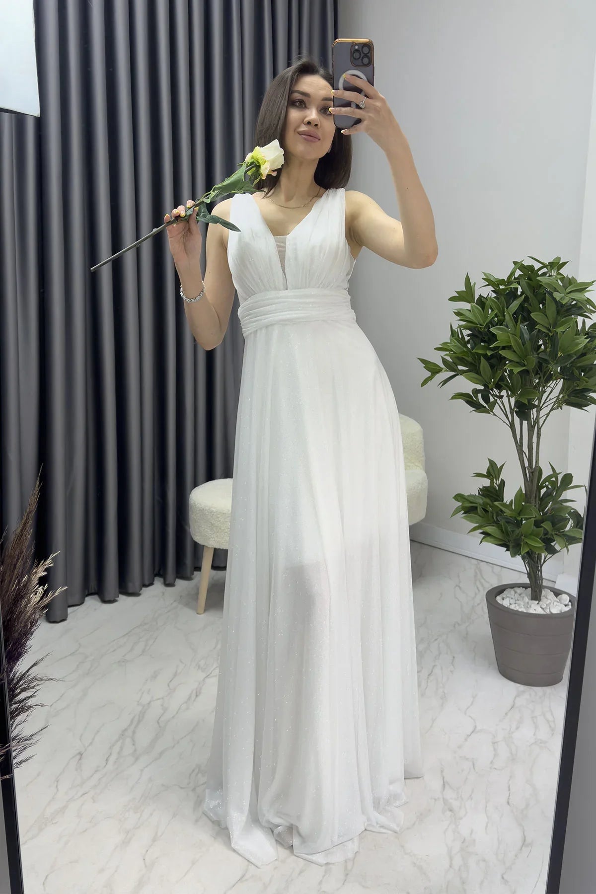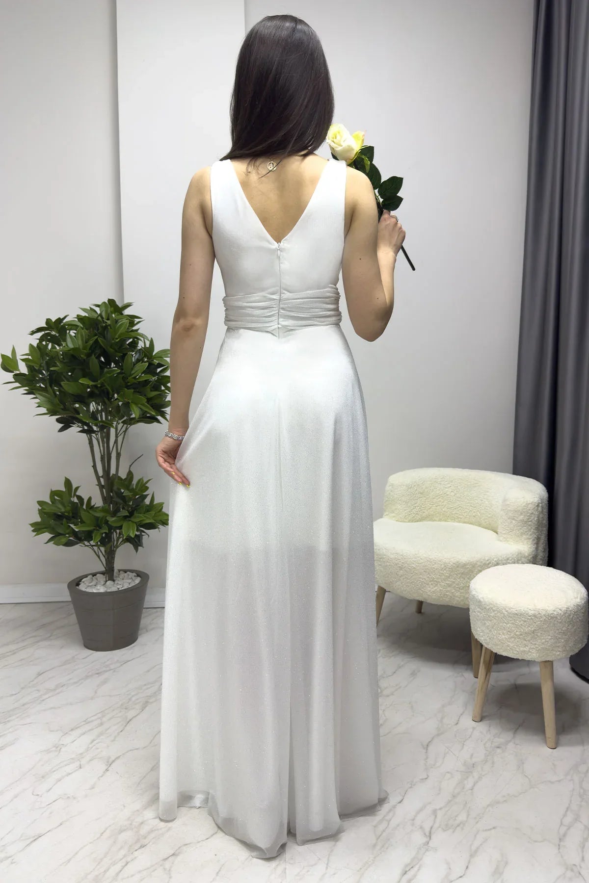Beyaz Sıfır Kol Transparan Detay Abiye Elbise