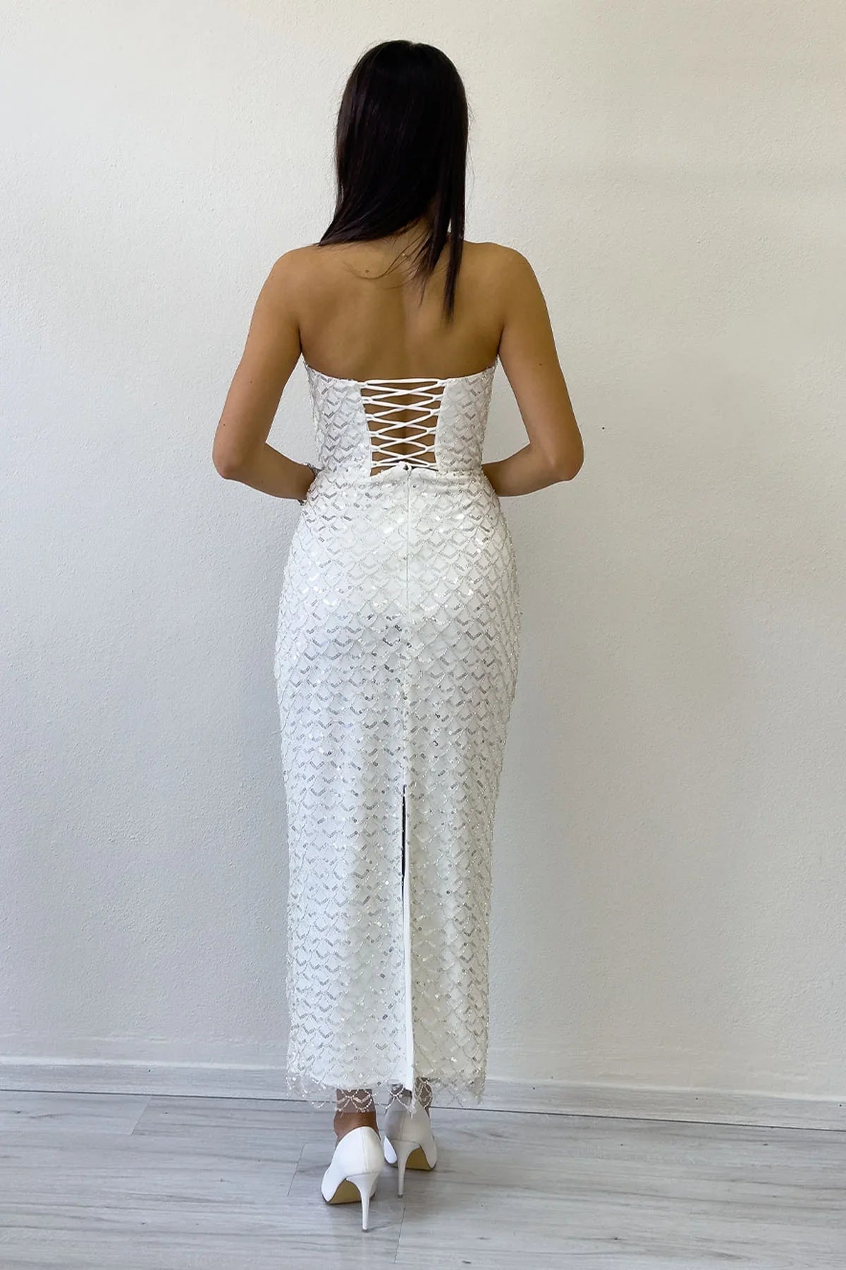 Beyaz Straplez Boncuk İşlemeli Midi Boy Abiye Elbise