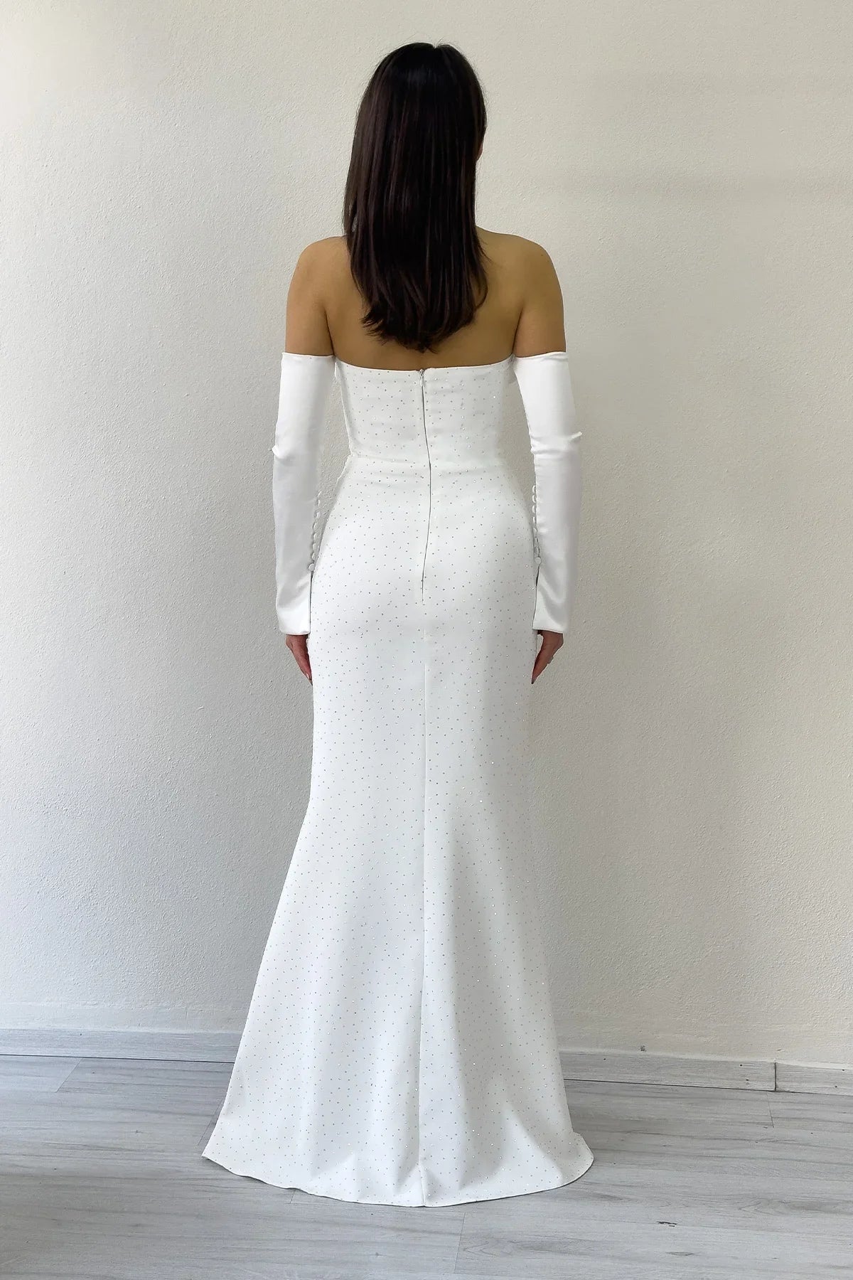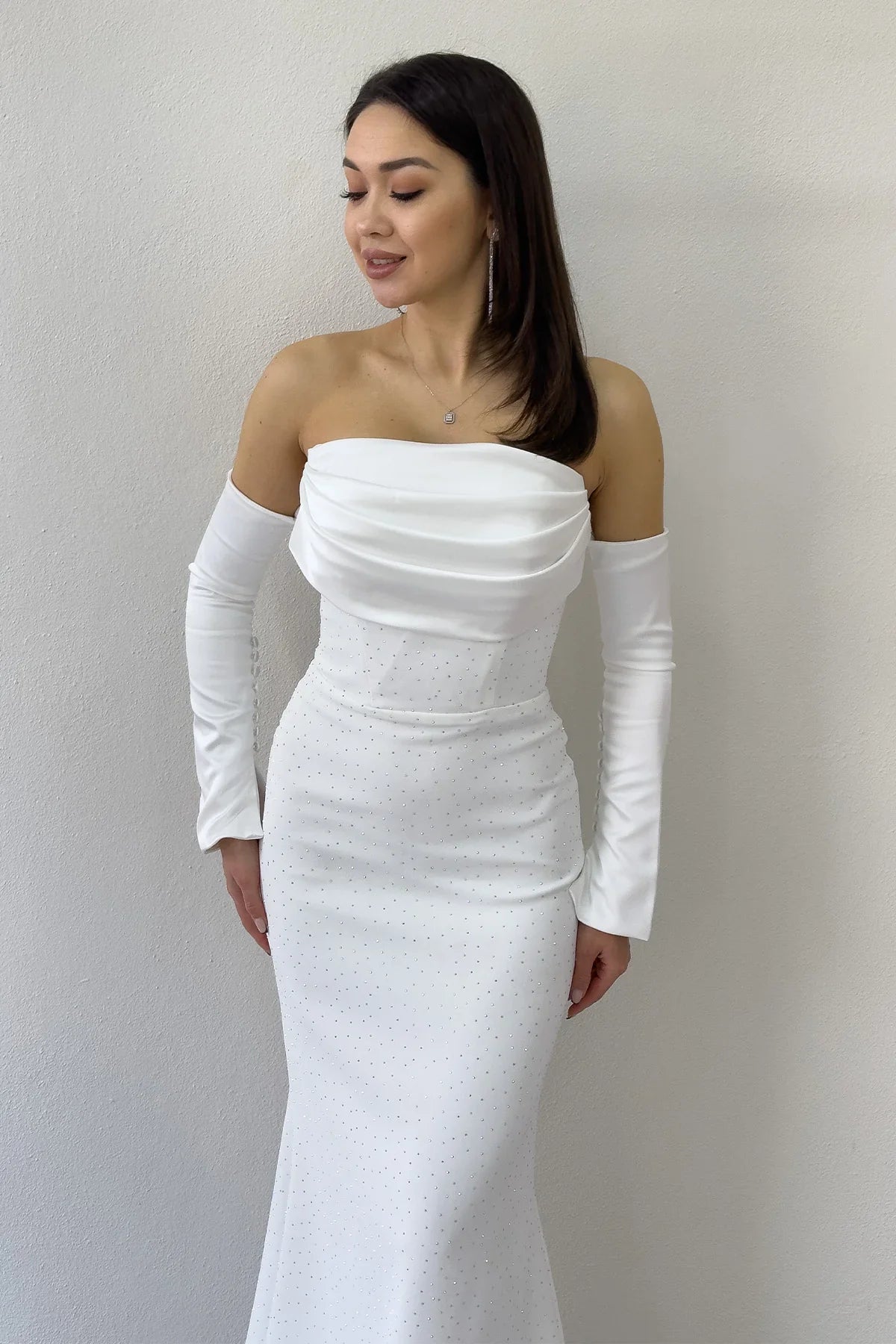 Kadın Taş Detaylı Beyaz Straplez Kol Aksesuarlı Balık Saten Alya Nikah Elbise