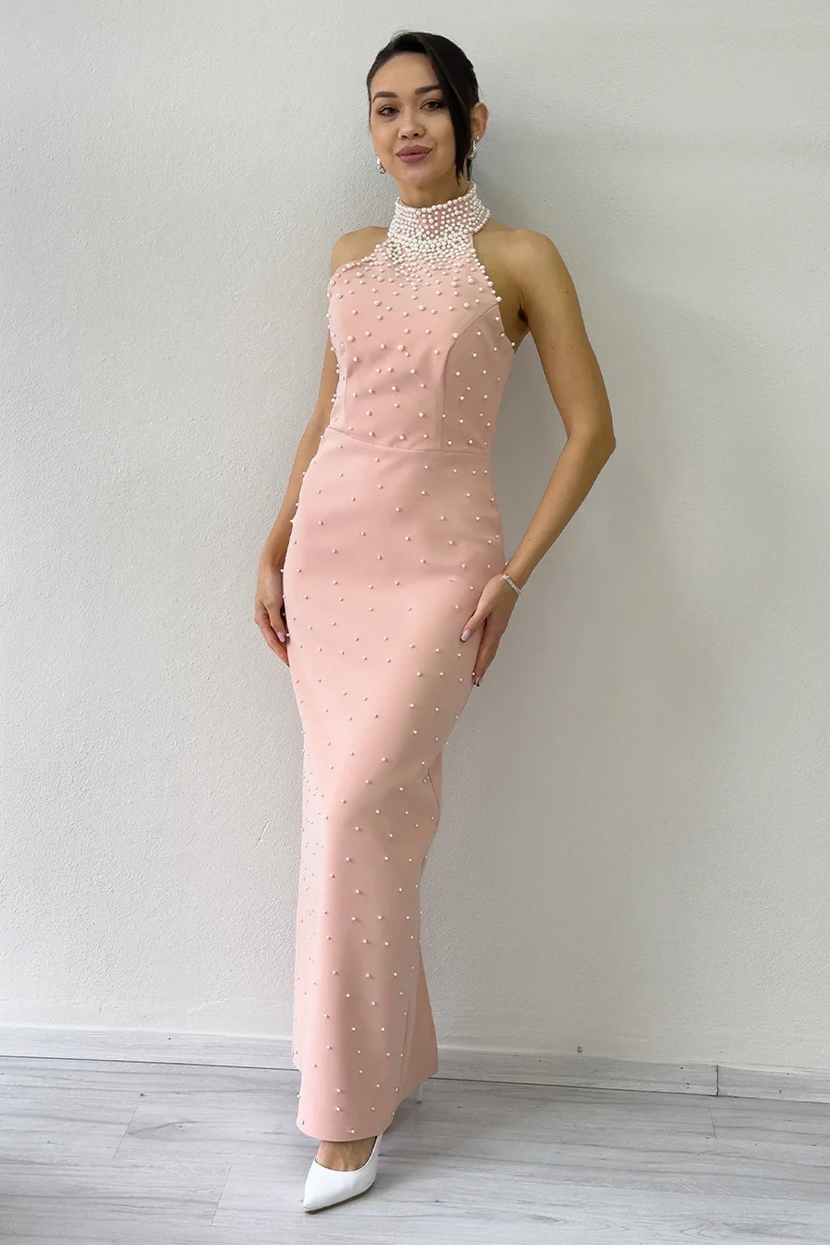 Kadın Pudra İncili Halter Yaka Abiye Elbise