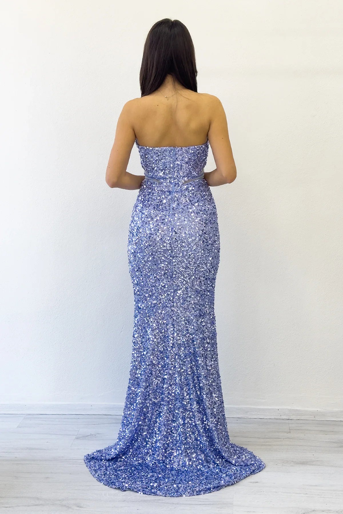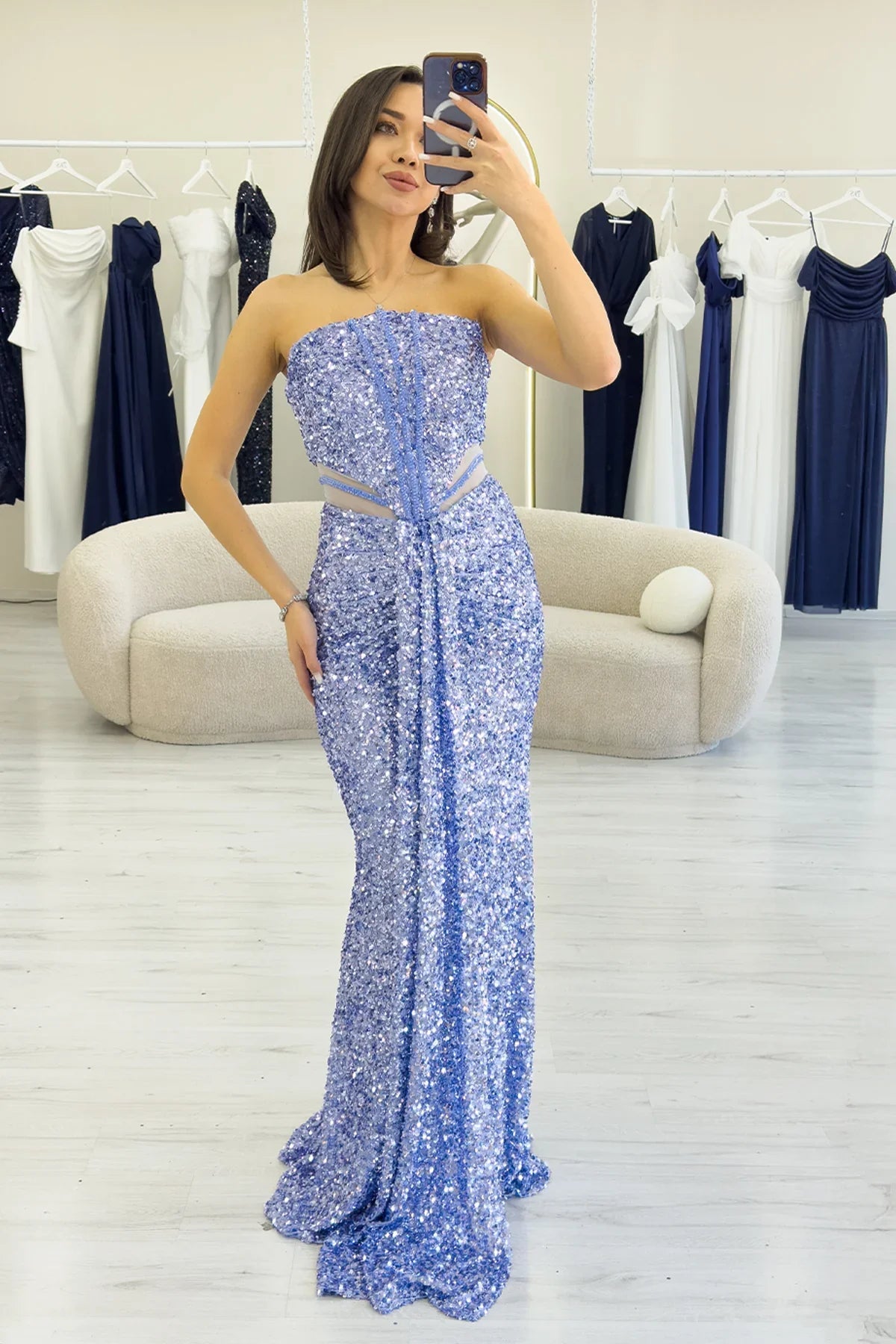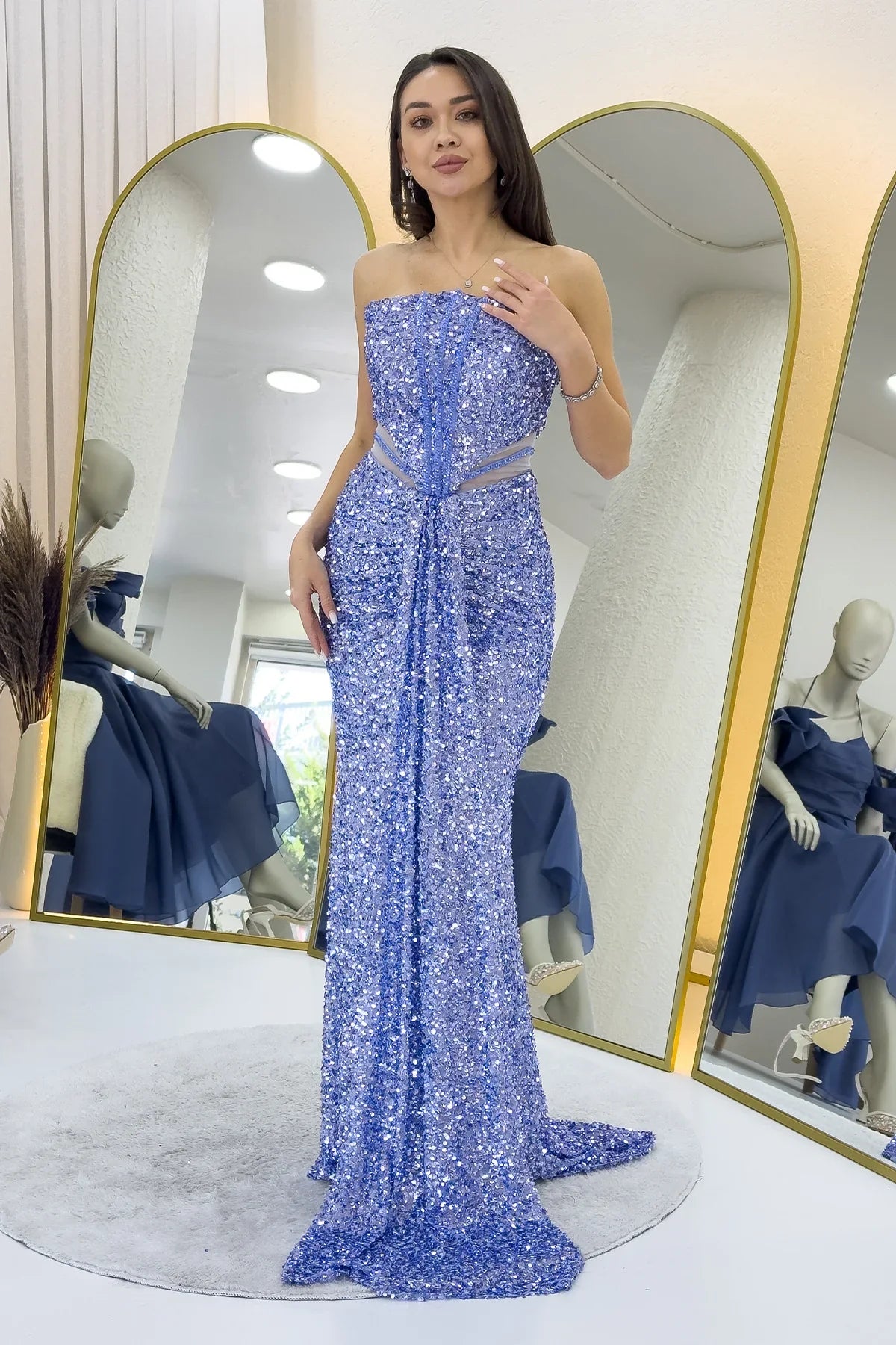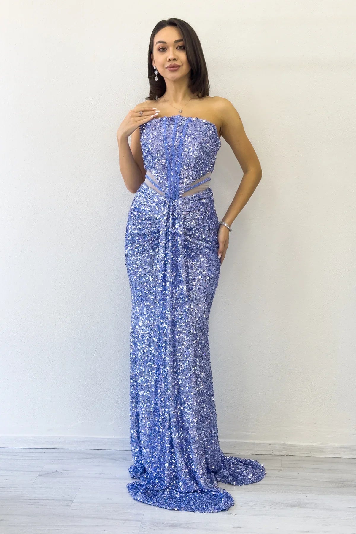 Bebe Mavi Straplez Bel Dekolteli Pul Payet Abiye Elbise