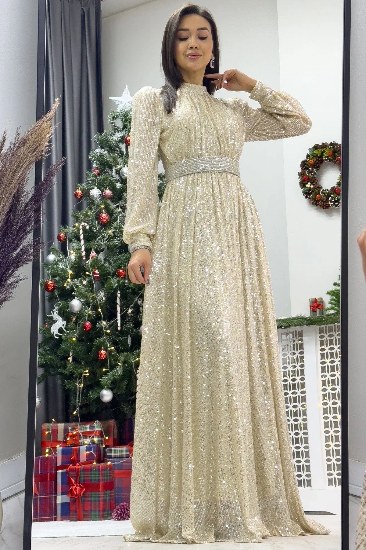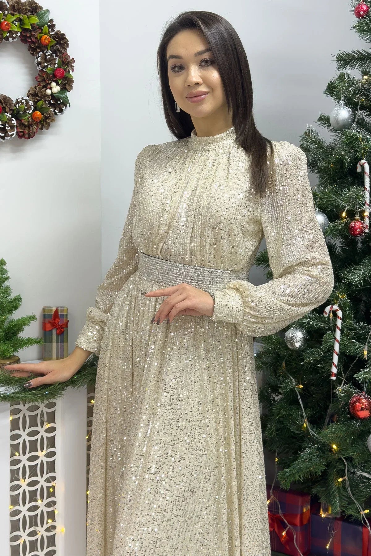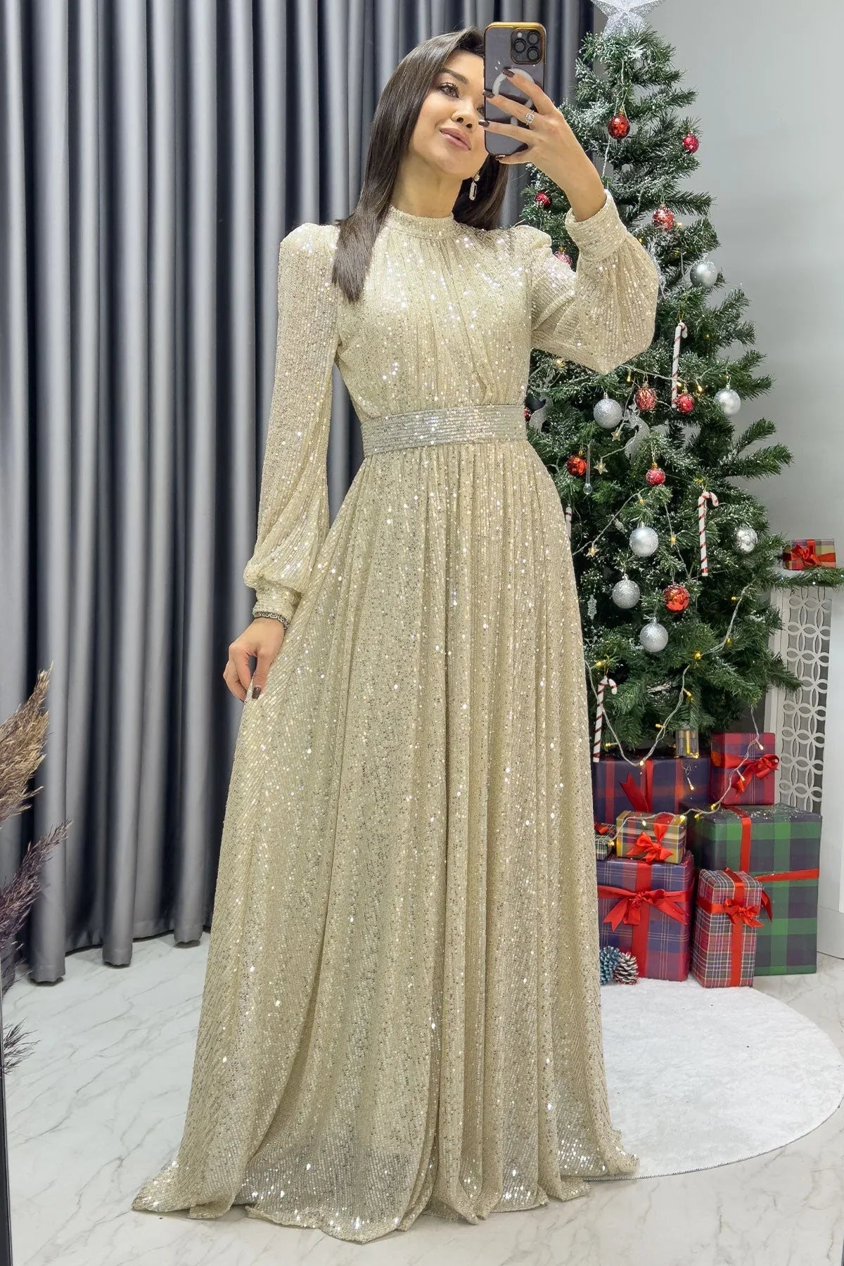 Bej Pul Payet Büzgü Detay Maxi Abiye Elbise