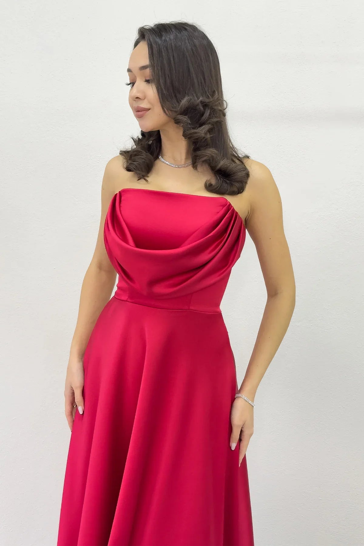 Kırmızı Straplez Saten Uzun Abiye Elbise
