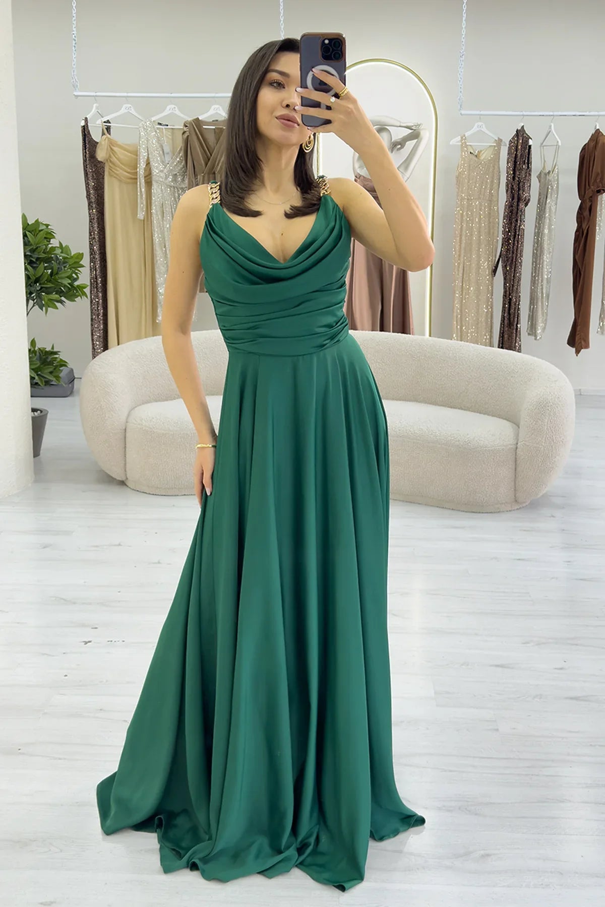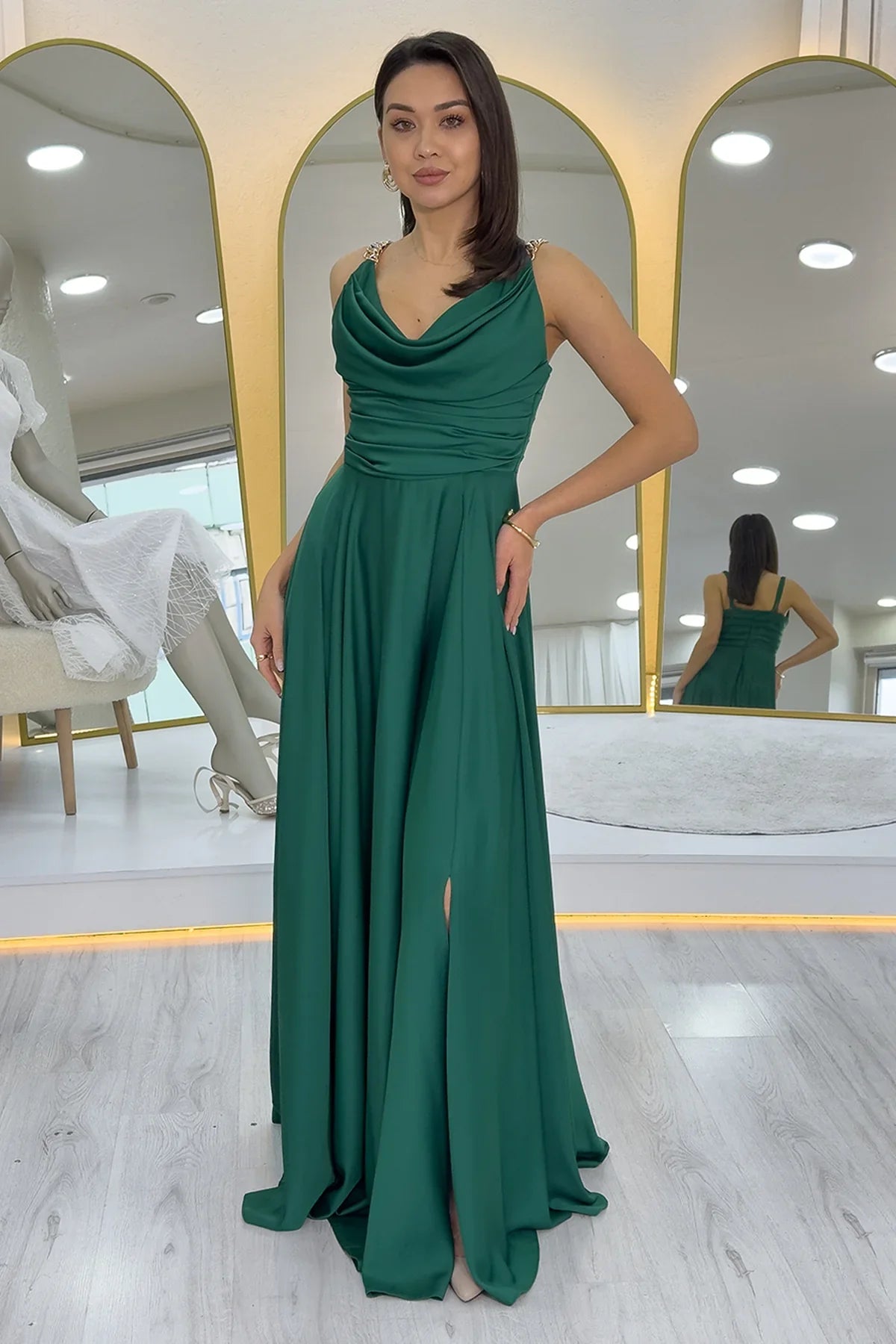 Yeşil Gold Askılı Ön Drapeli Saten Yırtmaçlı Abiye Elbise