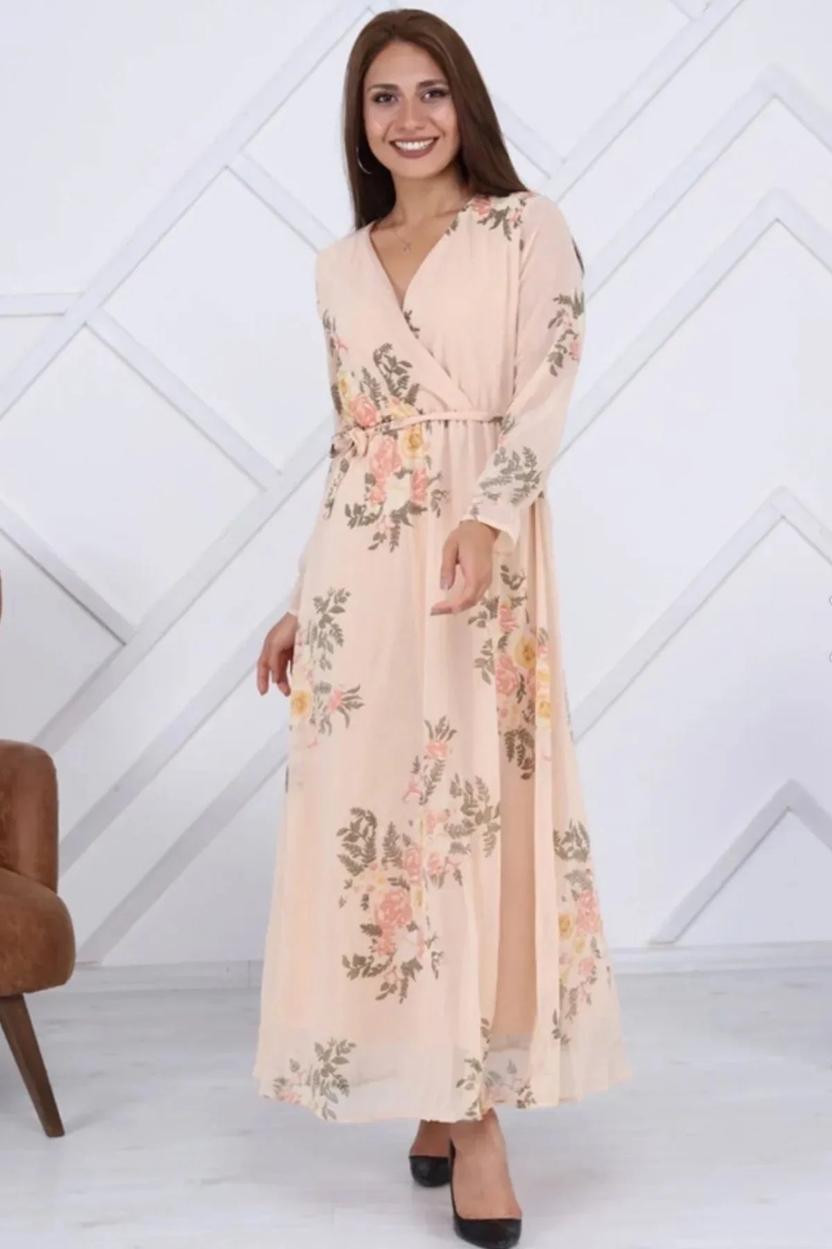 Ekru Çiçekli Kruvaze Yaka Şifon Büyük Beden Elbise