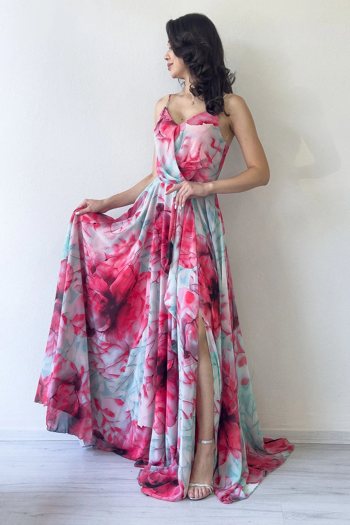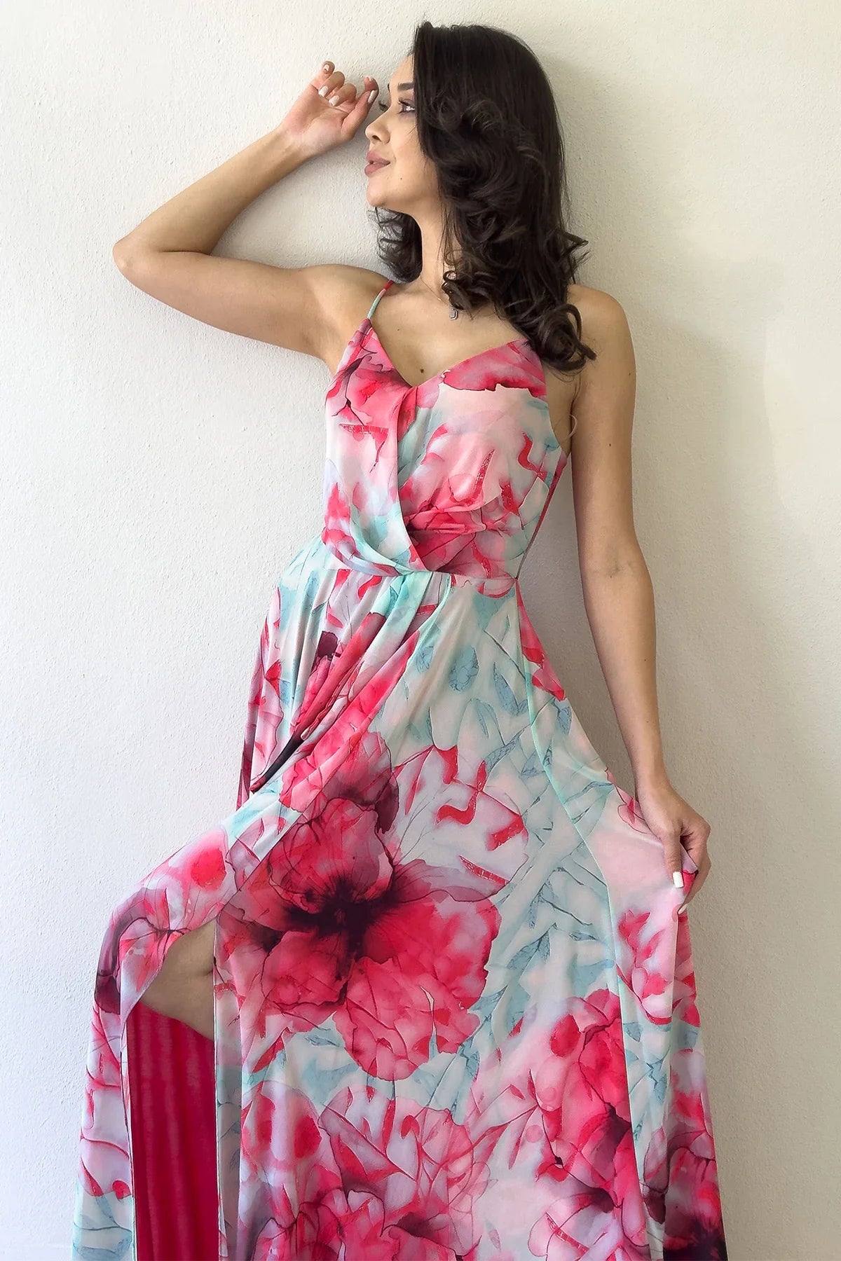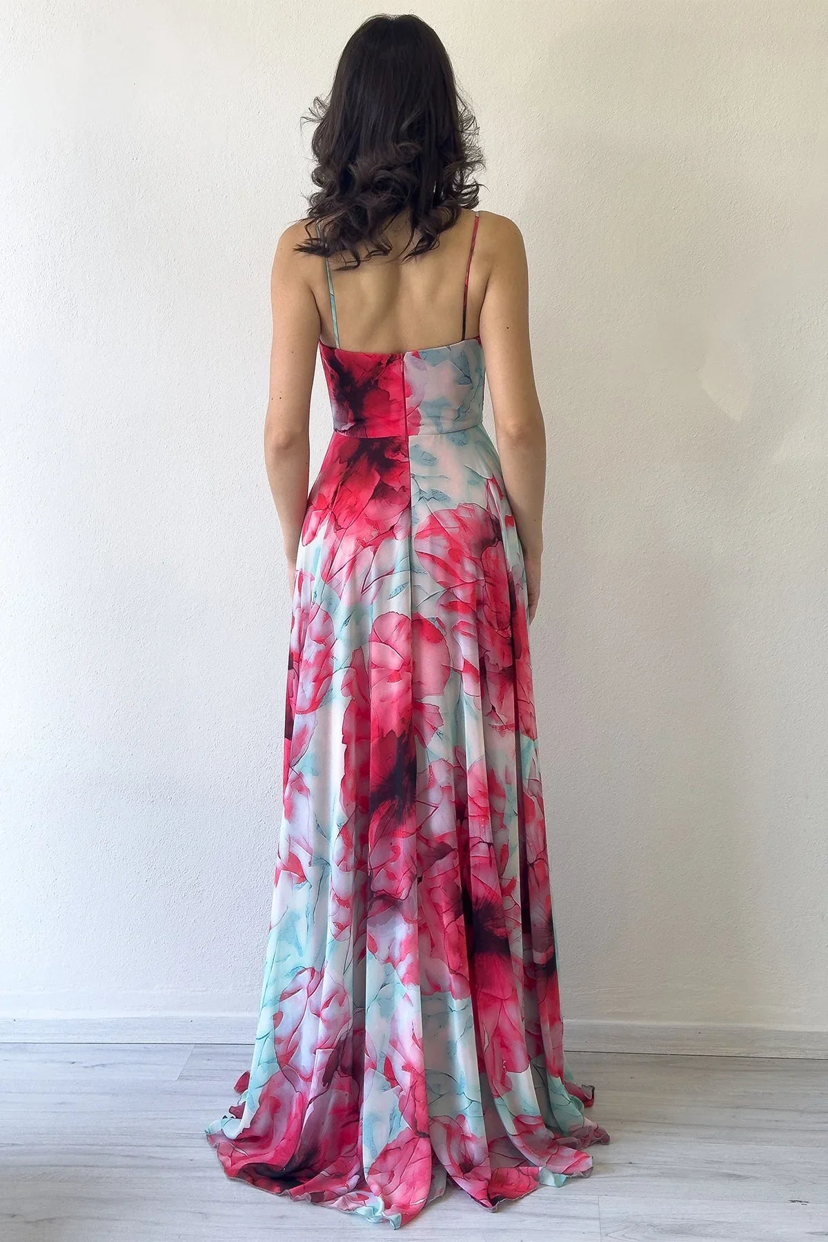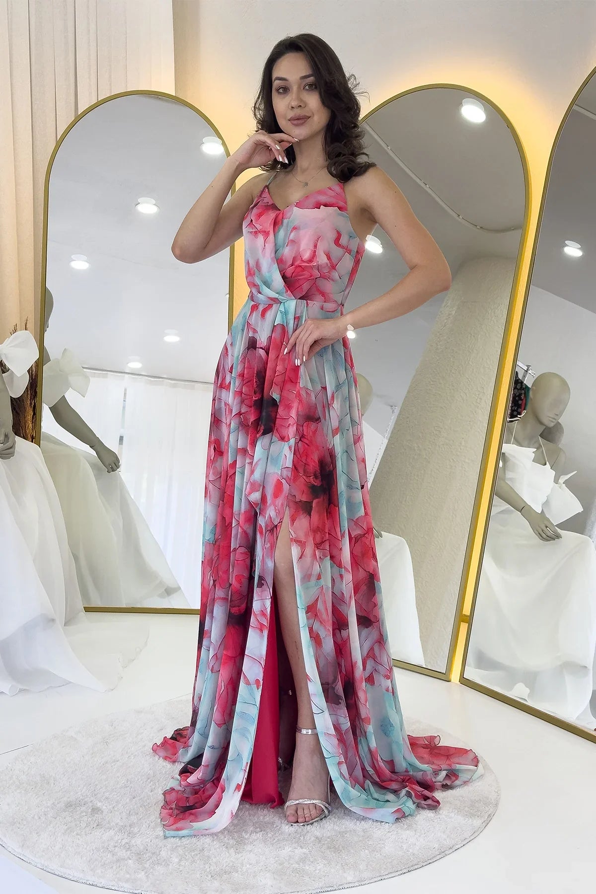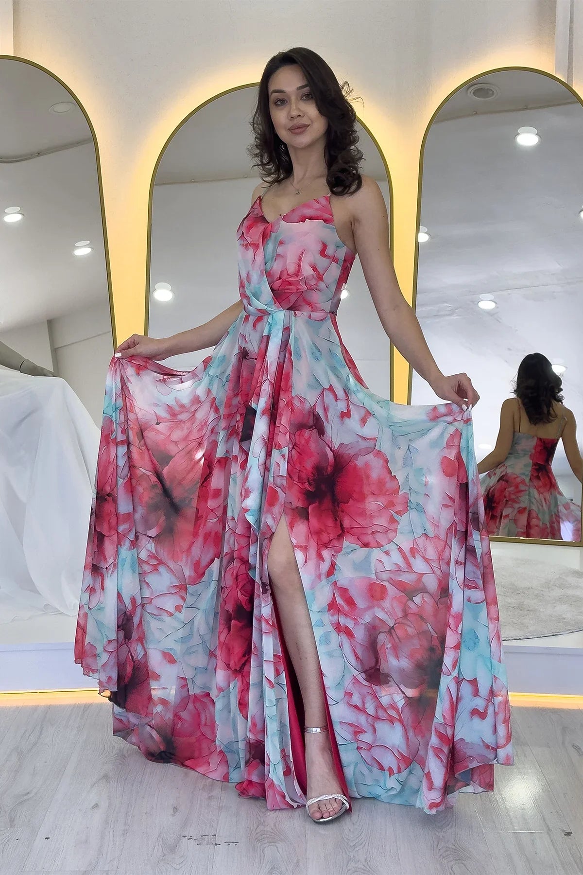 Kadın Askılı Pembe Çiçek Desenli Uzun Yırtmaçlı Şifon Abiye Elbise