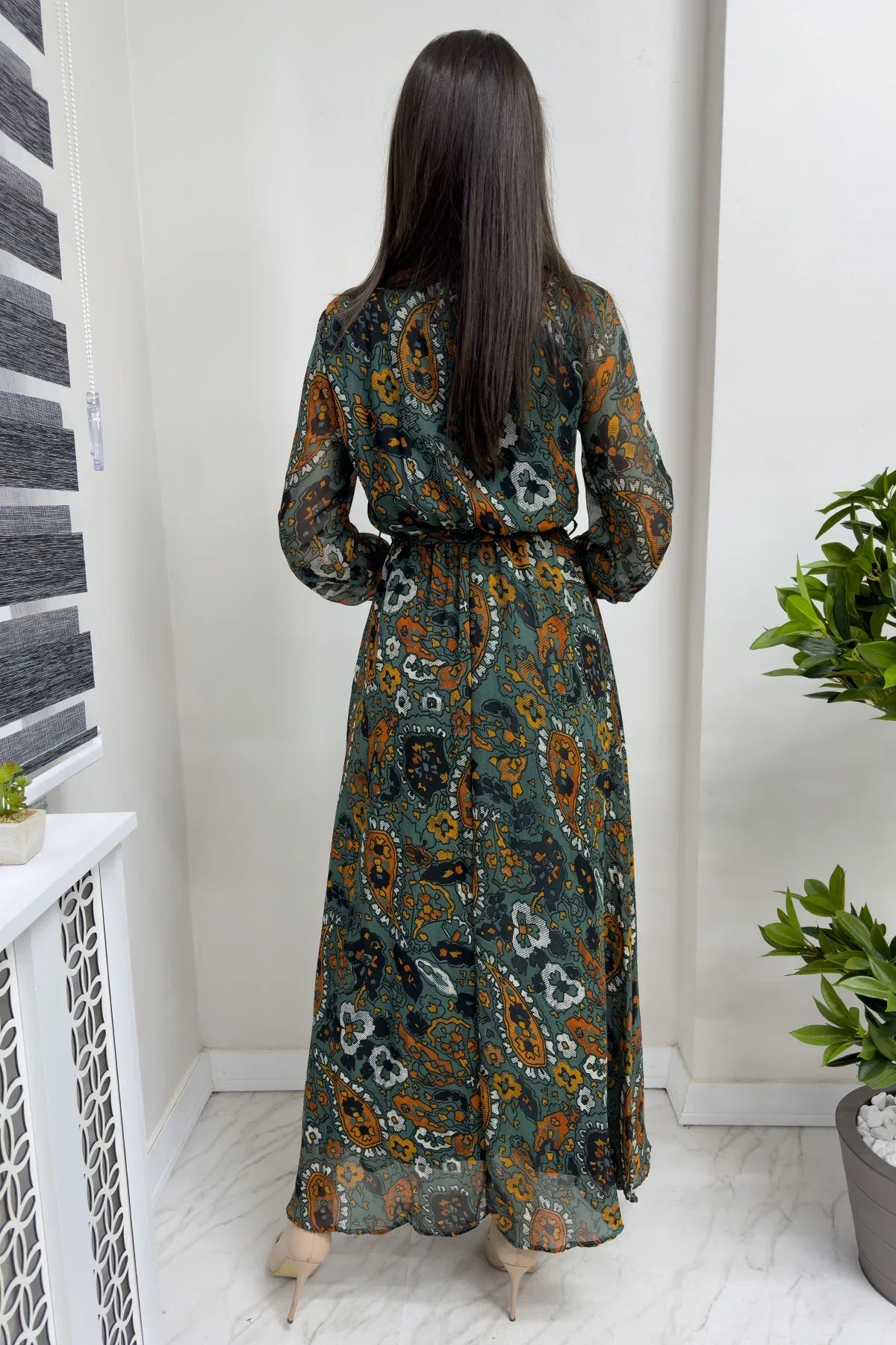 Kadın Yeşil Şal Desen Kruvaze Yaka Şifon Elbise