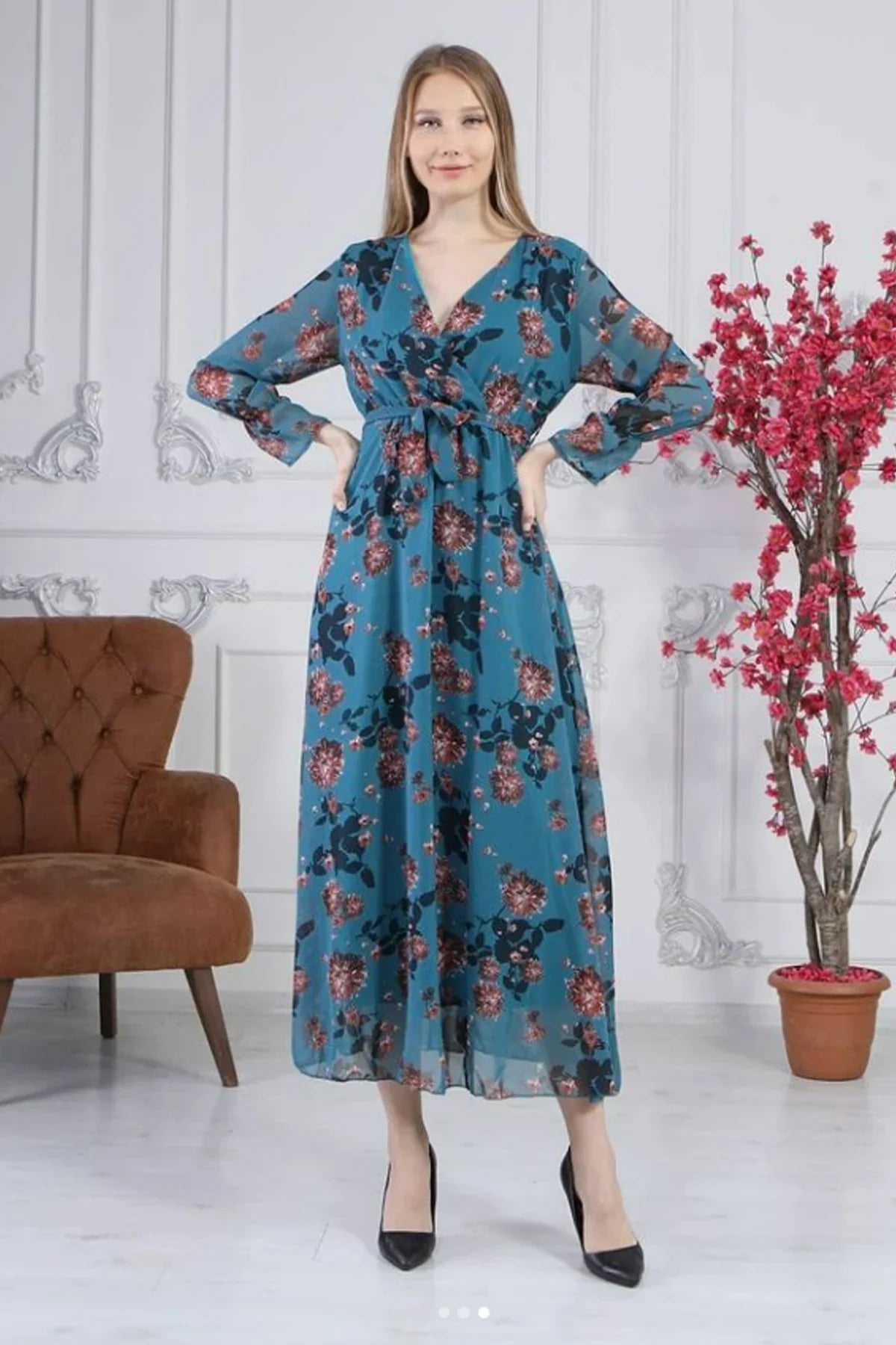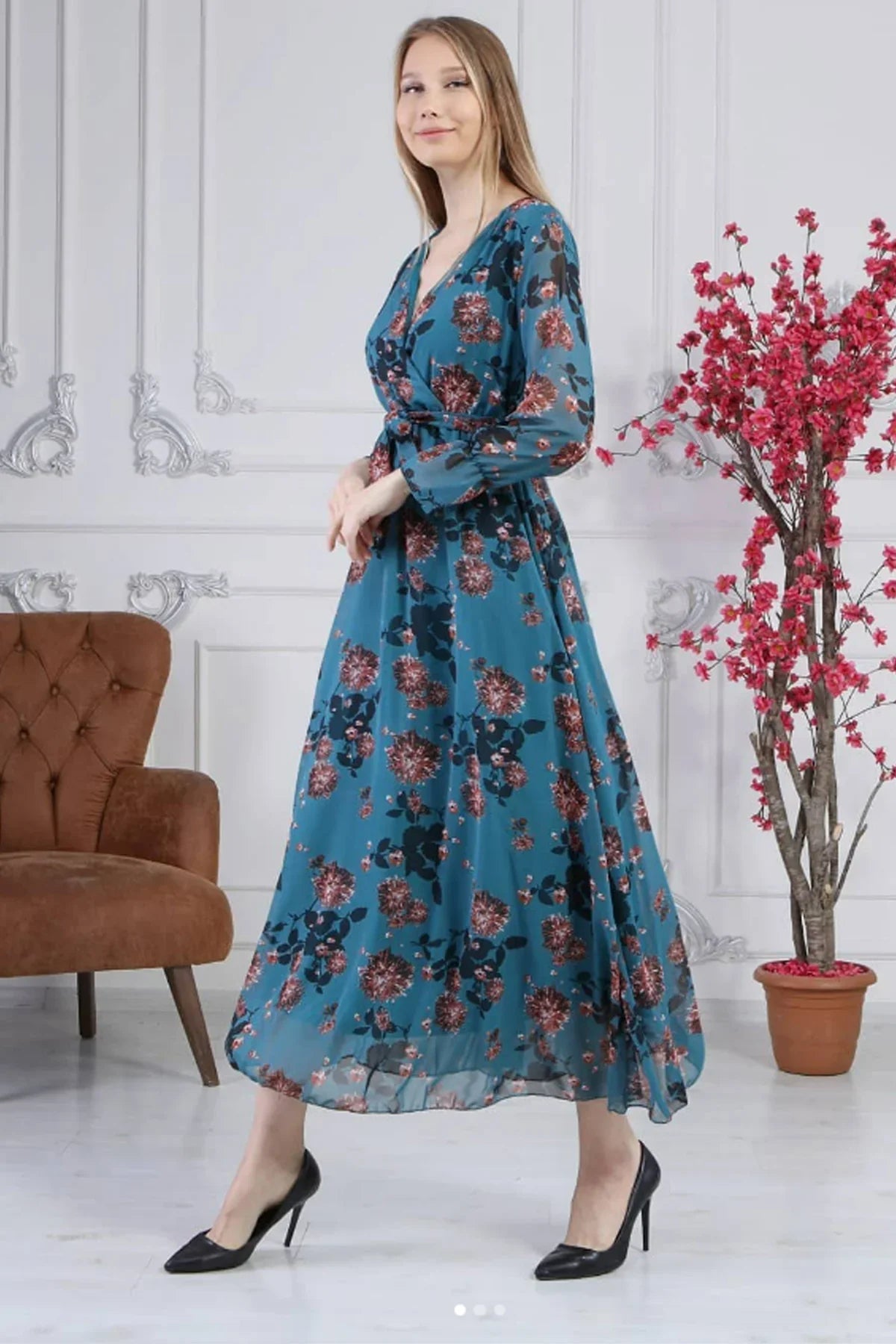 Petrol Mavisi Kruvaze Yaka Şifon Elbise