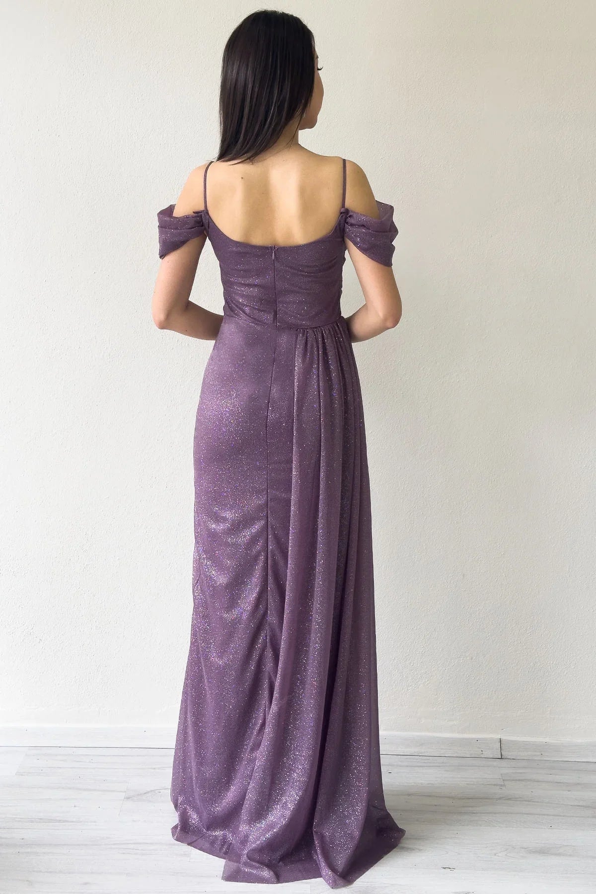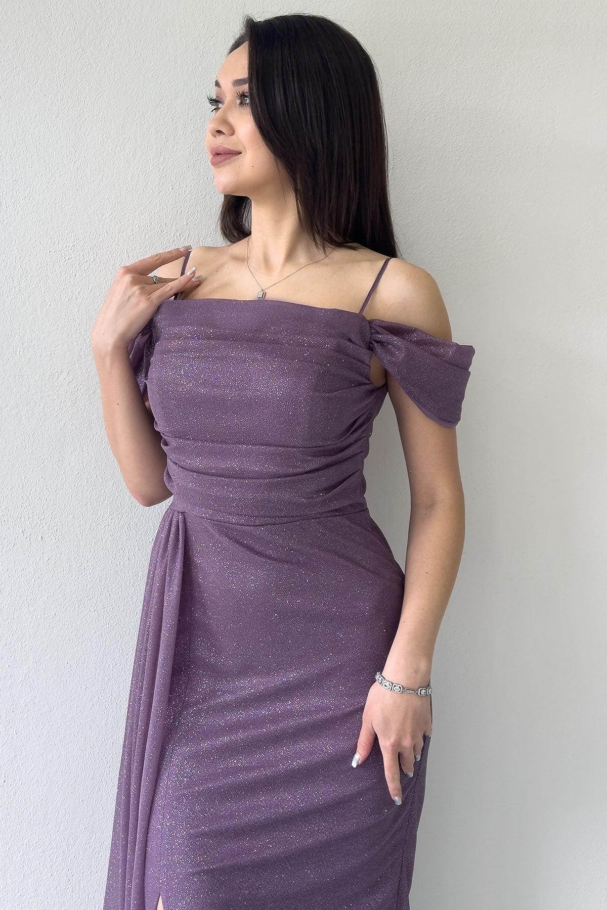 Koyu Lila Askılı Düşük Omuz Yırtmaç Detay Abiye Elbise
