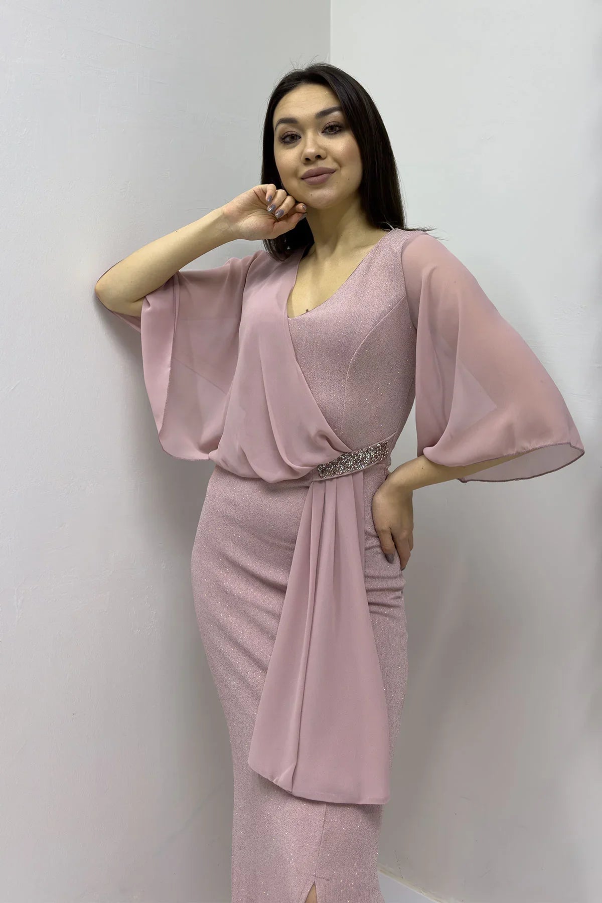 Pudra Taş Detaylı Volan Kol Simli Abiye Elbise