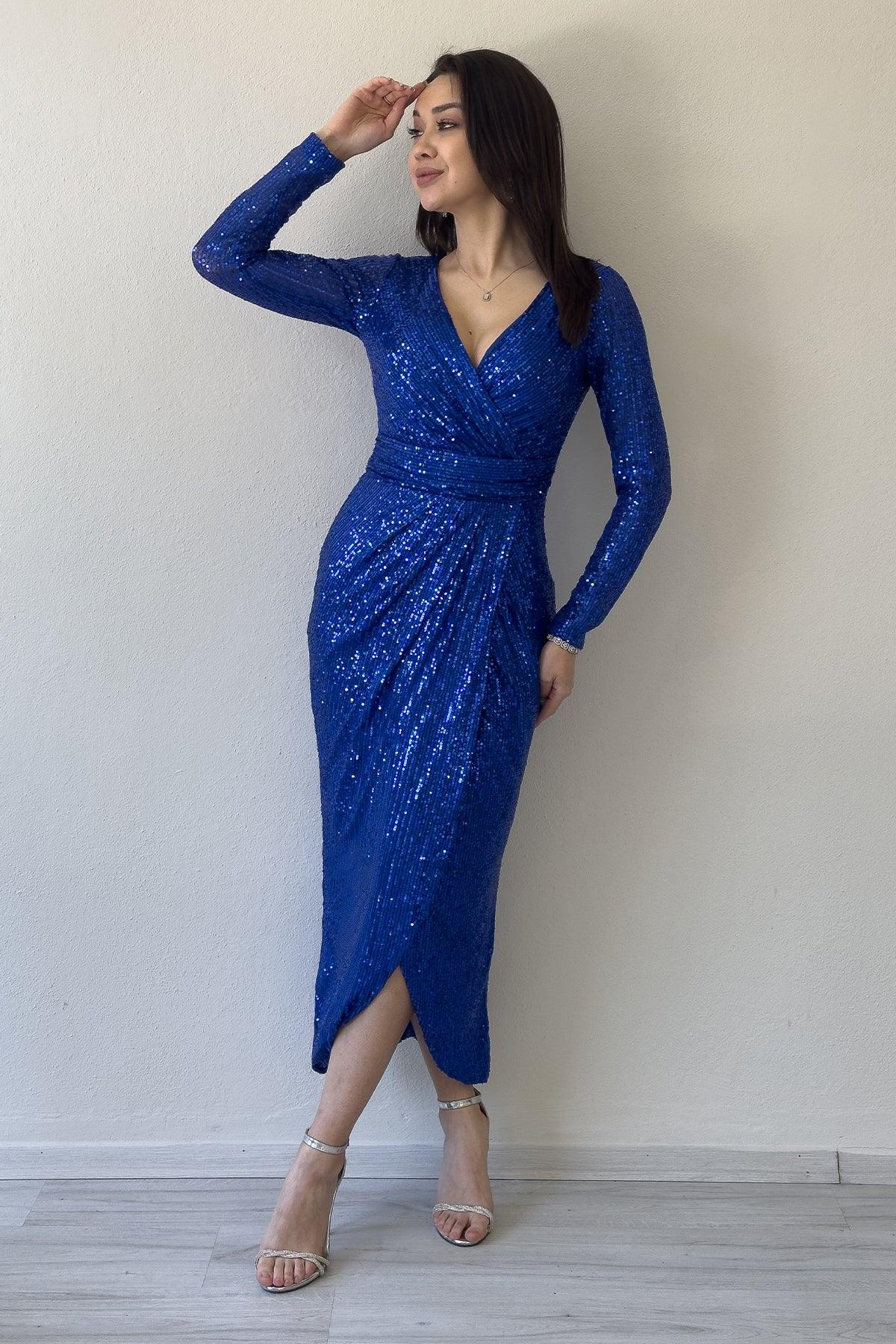 Saks Kruvaze Yaka Payet Tasarım Uzun Kollu Abiye Elbise