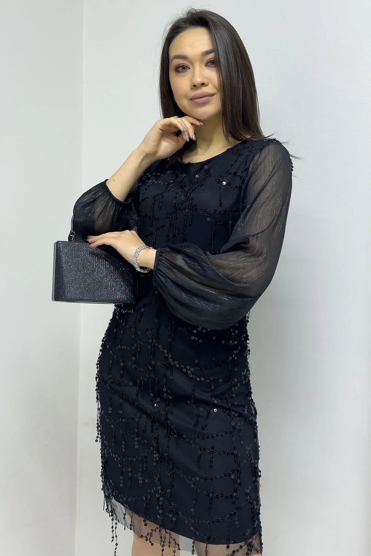 Siyah Kadın Büyük Beden Şifon Pulpayet Abiye Elbise