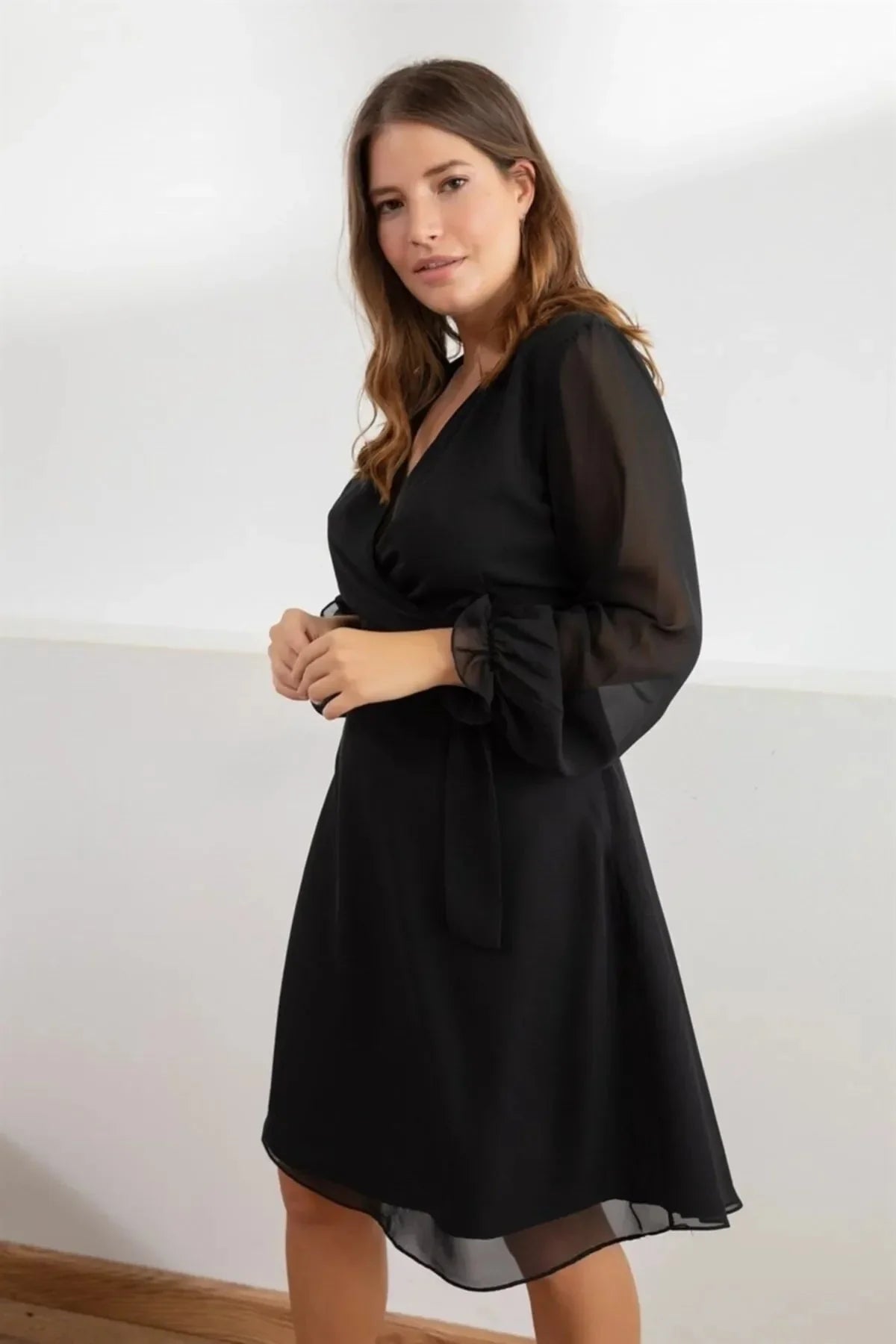 Siyah Kruvaze Yaka Astarlı Şifon Elbise