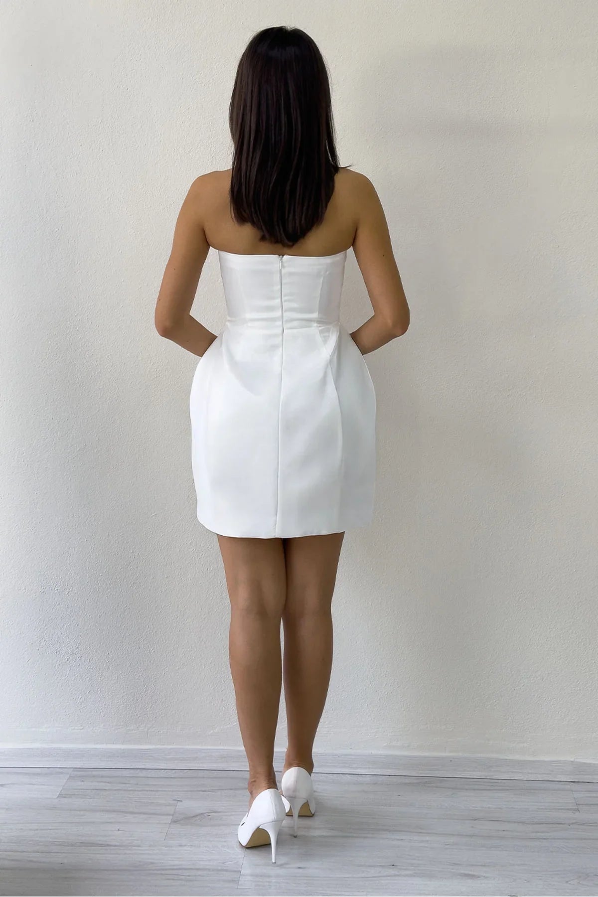 Beyaz Straplez Fiyonk Detay Mini Abiye Elbise
