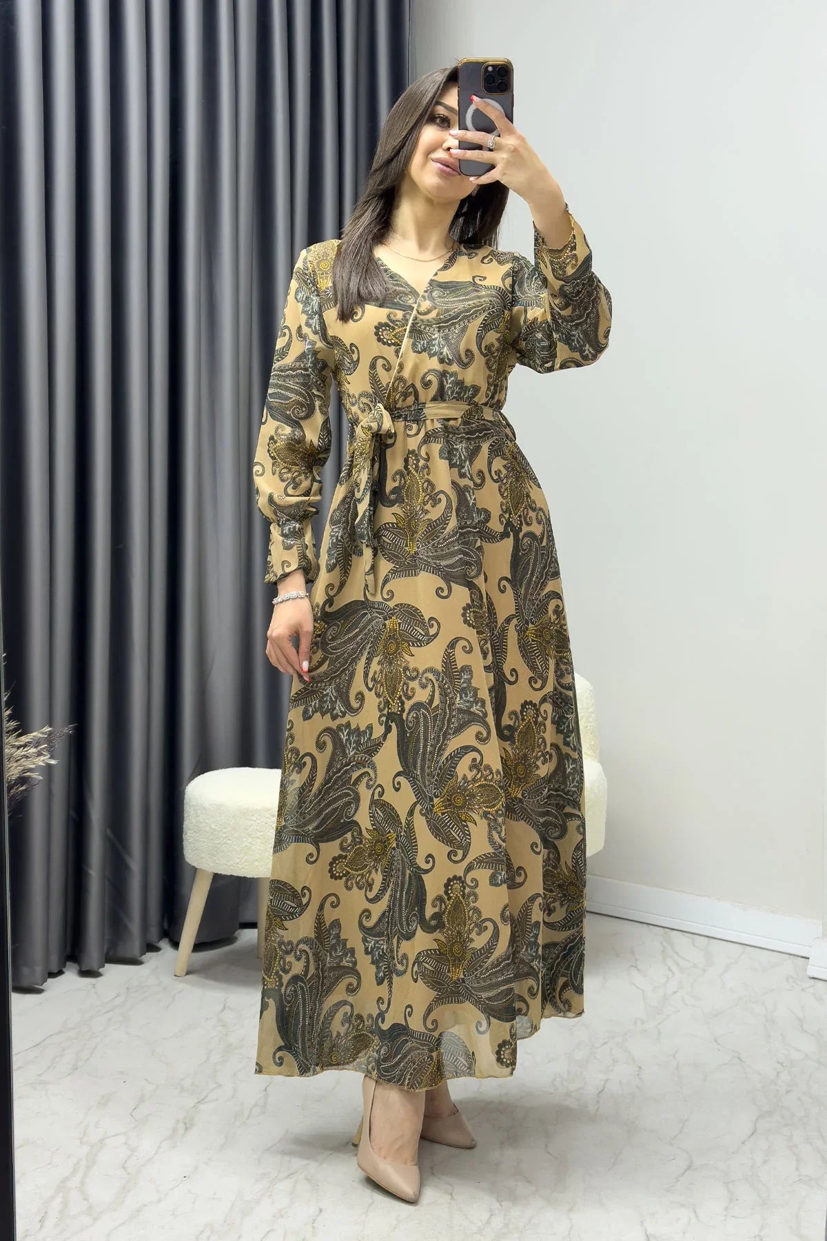 Kadın Gold Şal Desen Kruvaze Yaka Şifon Elbise Kadın Gold Şal Desen Kruvaze Yaka Şifon Elbise, zarifliği ve ışıltıyı bir arada sunan sofistike bir tasarımdır. Altın tonlarındaki şal deseni, elbiseye parlaklık ve şıklık katarken, kruvaze yaka detayı modern ve feminen bir görünüm sağlar. Akışkan şifon kumaşı, zarif bir hareket yaratırken rahat bir kullanım imkanı sunar, her ortamda dikkatleri üzerinize çeker. Renk ve Kumaş Gold (Altın) Renk: Parlak ve zarif altın tonu, her ortamda şıklığı vurgular ve sofistike bir görünüm sağlar. Şal Deseni: Elbise üzerine işlenen şal desenleri, tasarıma zariflik katarken ışıltılı bir etki yaratır. Şifon Kumaş: Hafif ve akışkan yapısı, elbiseye zarif bir hareketlilik kazandırır, rahat ve şık bir kullanım sunar. Tasarım Detayları Kruvaze Yaka: Şık bir dekolte sunarak zarif bir görünüm sağlar. Kruvaze yaka, elbiseye modern bir hava katarken sofistike bir dokunuş yaratır. Şal Deseni: Altın rengi şal desenleri, elbiseye ışıltı katarken zarif ve şık bir hava oluşturur. Vücuda Oturan Kesim: Elbise, vücuda nazikçe oturarak şık bir siluet oluşturur. Akışkan Kumaş: Şifon kumaşın akışkan yapısı, her adımda zarif bir hareket sağlar ve rahat bir kullanım sunar. Kumaş ve Konfor Şifon kumaş, hafifliği ve akışkan yapısıyla uzun süreli kullanımda bile rahatlık sağlar. Altın şal desenlerinin zarifliği, elbiseyi her ortamda dikkat çekici kılar. Akışkan yapısı, vücuda uyum sağlar ve konforlu bir his yaratır. Kullanım Alanları Özel Davetler ve Akşam Yemeği: Şık takılar ve topuklu ayakkabılarla kombinleyerek zarif bir tarz elde edebilirsiniz. Kokteyller ve Sosyal Etkinlikler: Minimal takılarla şıklığınızı pekiştirerek zarif bir görünüm oluşturabilirsiniz. Günlük Kombinler: Rahat ayakkabılarla şıklığınızı rahatça tamamlayabilirsiniz. Yaz Etkinlikleri: Hafif şifon kumaşı ile yaz aylarında rahatça giyilebilecek ideal bir seçenek sunar. Faydaları Altın renginin zarif ve ışıltılı duruşu, her ortamda şıklığınızı yansıtır. Kruvaze yaka, şık ve feminen bir dekolte sunar. Akışkan şifon kumaş, rahatlık ve şıklığı bir arada sunar. Elbisenin vücuda oturan kesimi, şık bir siluet oluşturur. Bu zarif tasarım, "gold şal desenli şifon elbise," "kruvaze yaka şifon elbise," veya "altın şal desenli elbise" gibi aramalarda öne çıkar. Şimdi The ZKS’i ziyaret edin ve bu şık tasarımla stilinizi tamamlayın! ✨👗
