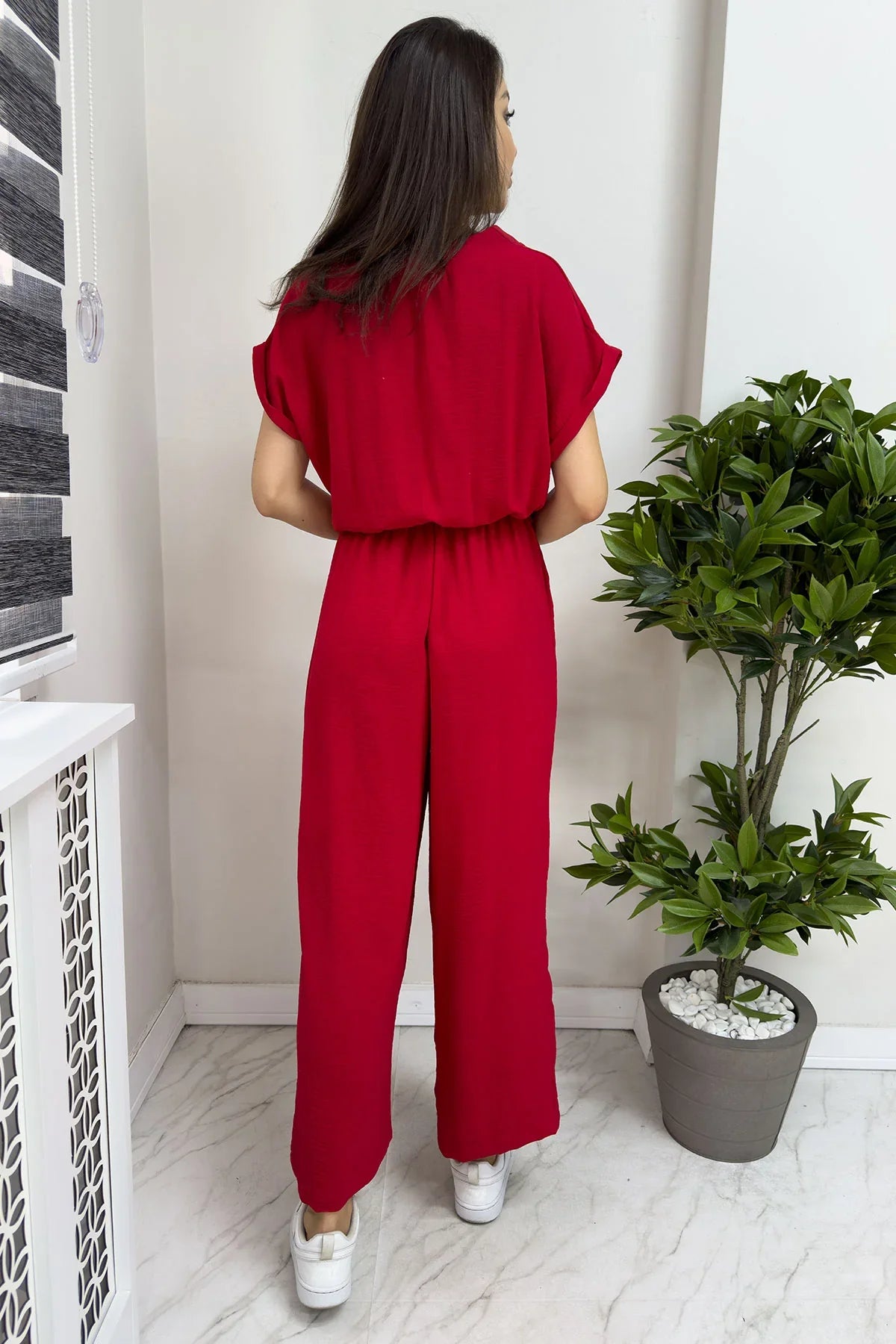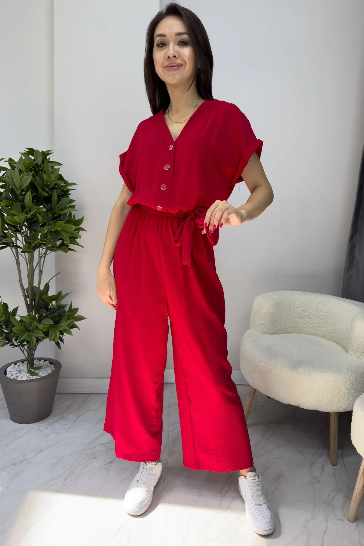Kadın Kırmızı Bol Paça Kuşaklı Tulum