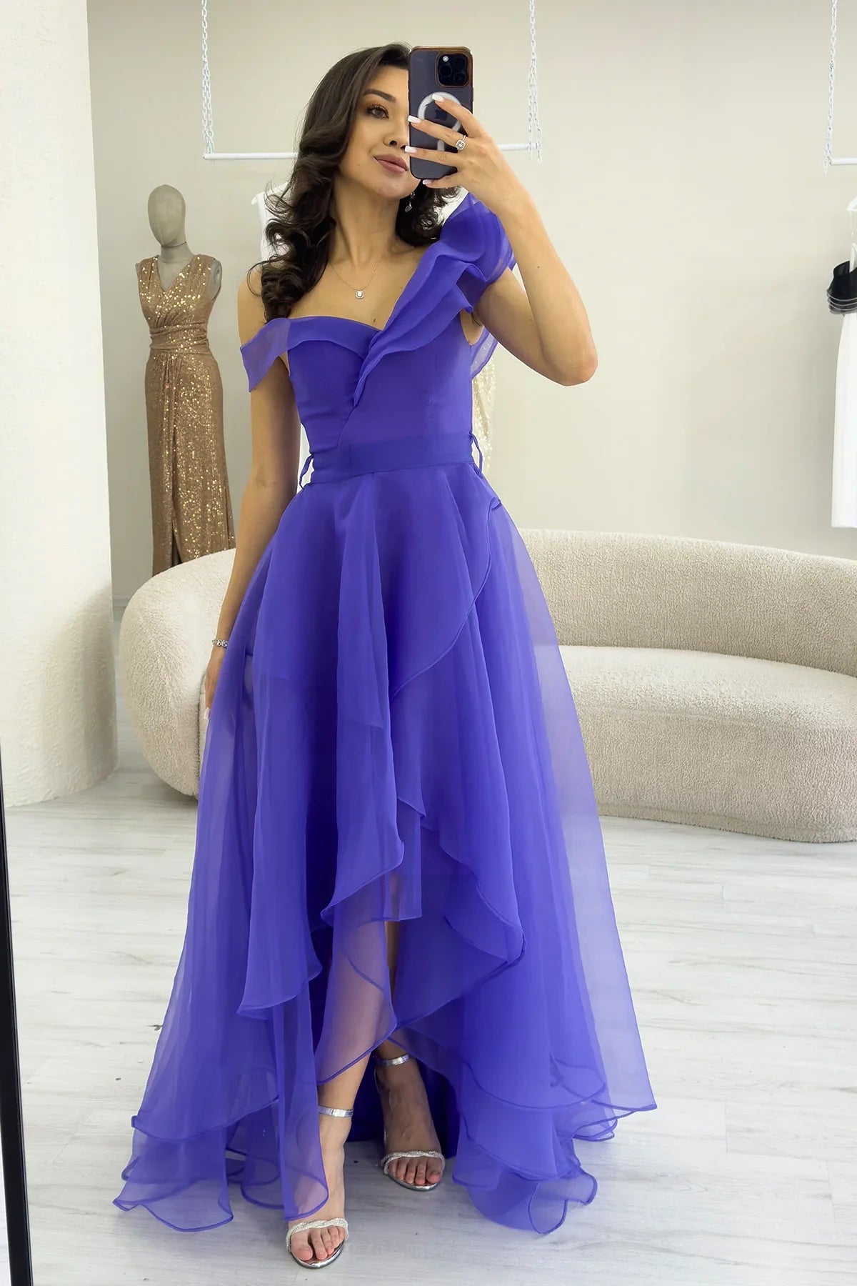 Kadın Mor Düşük Omuz Asimetrik Etek Tül Abiye Elbise