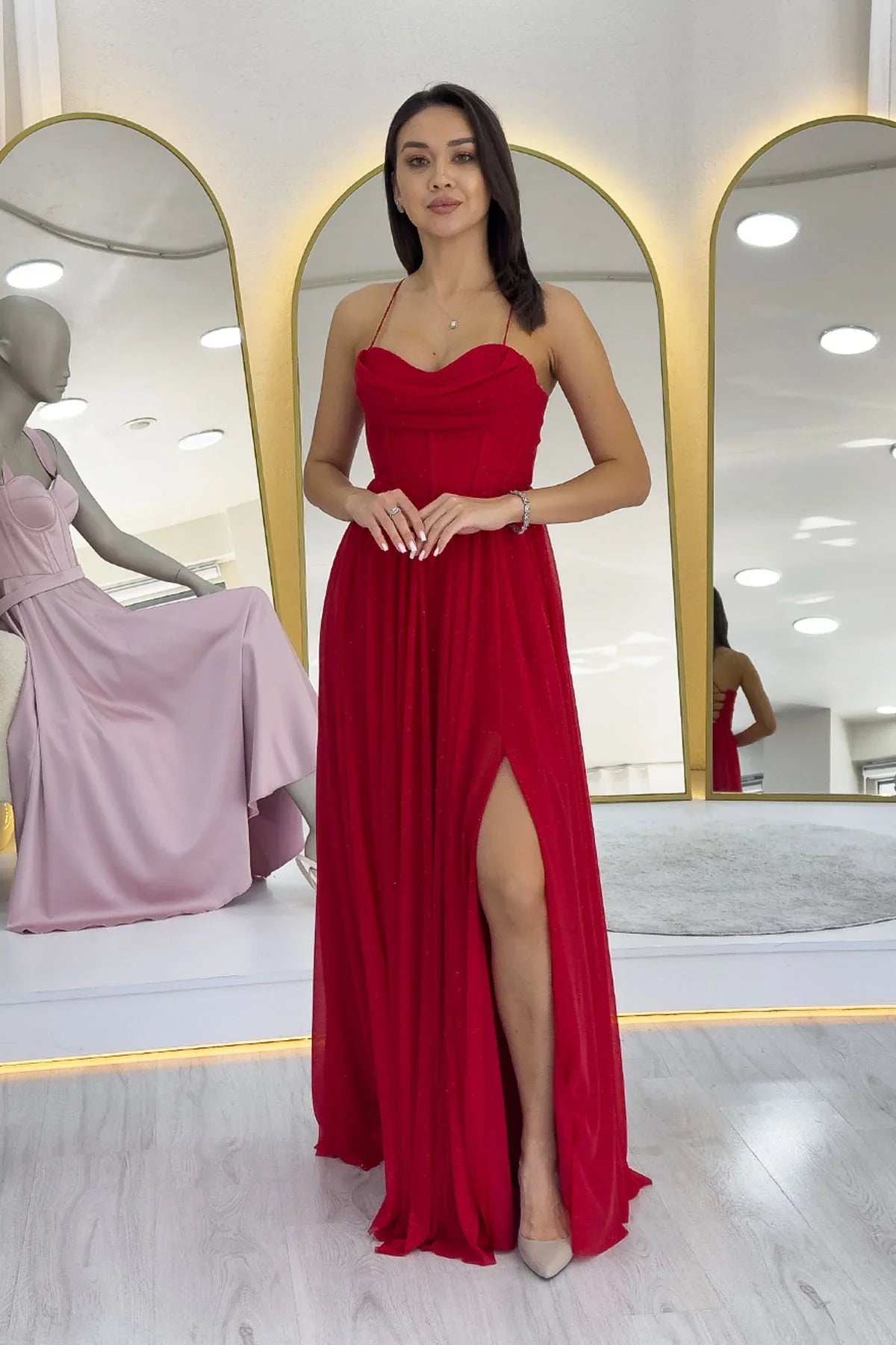 Kırmızı Simli Sırt Dekolteli Korse Detay Yırtmaçlı Abiye Elbise