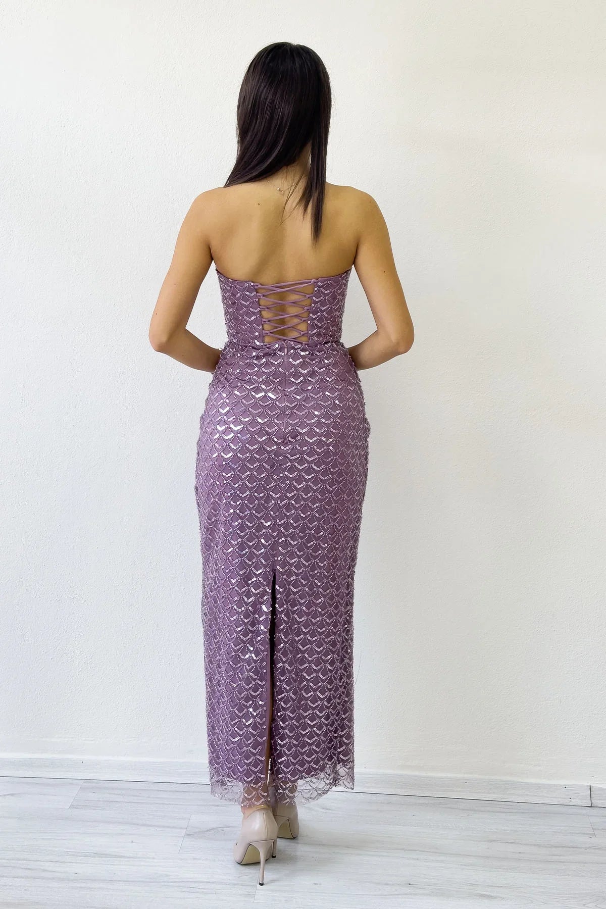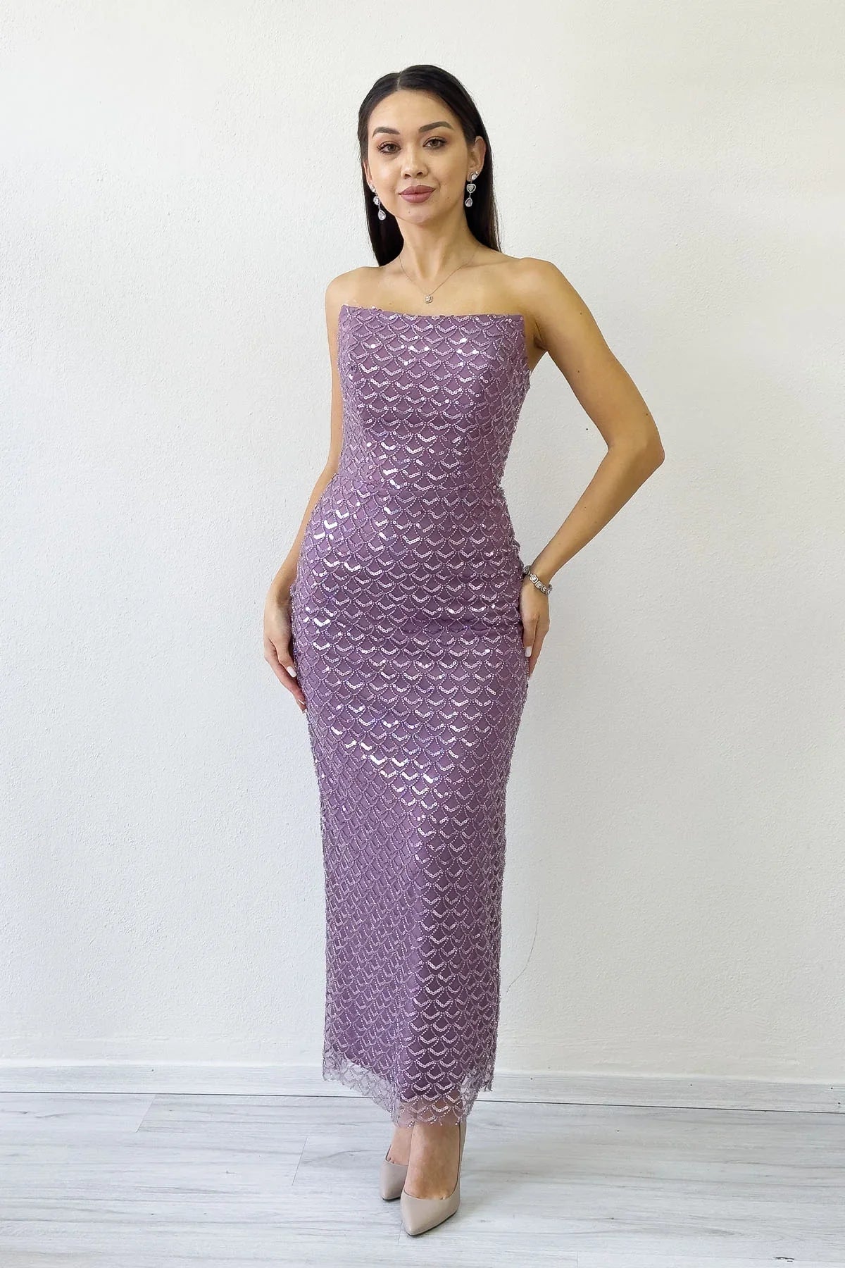 Lila Straplez Boncuk İşlemeli Midi Boy Abiye Elbise