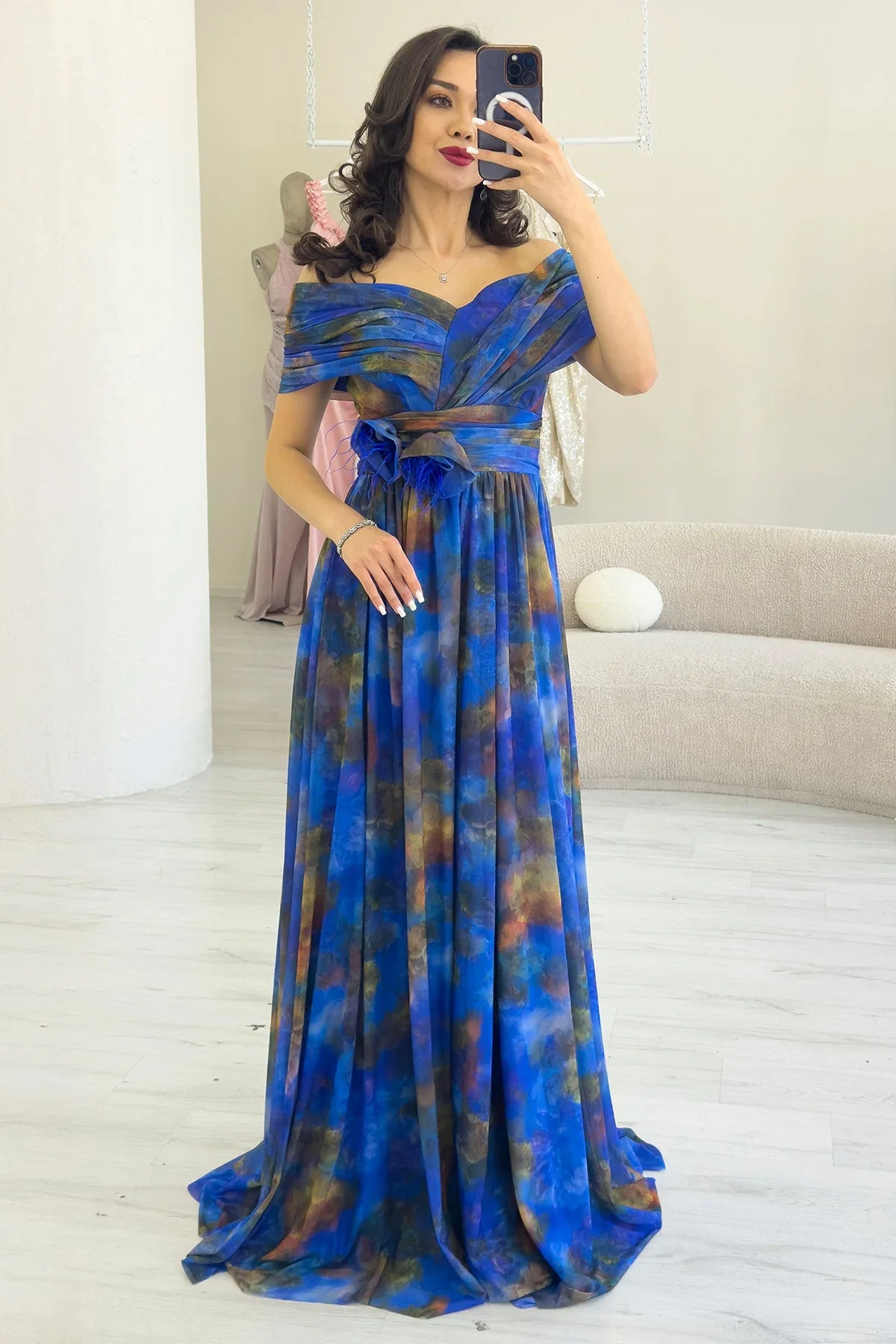 Saks Batik Desenli Madonna Yaka Desenli Tül Abiye Elbise
