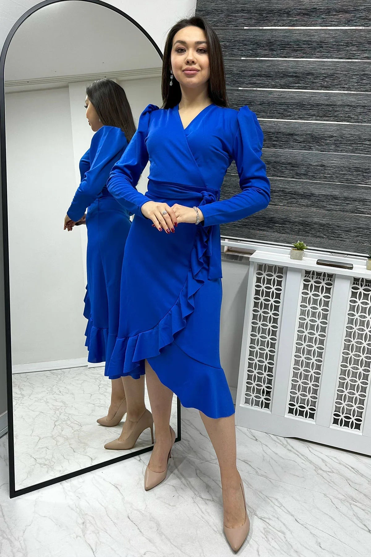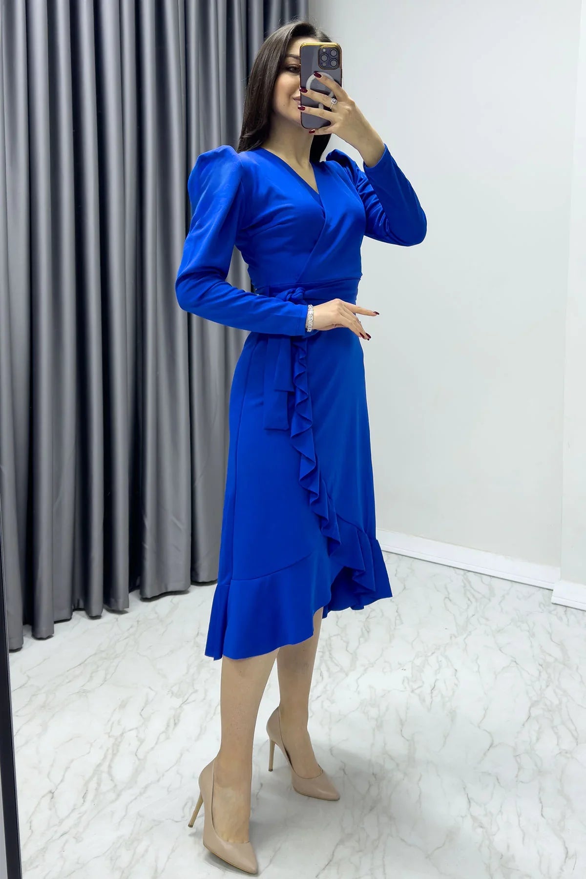 Saks Krep Volanlı Kruvaze Büyük Beden Elbise