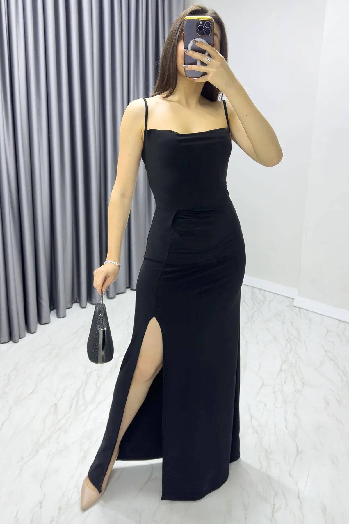 Siyah Scuba Yırtmaçlı Askılı Elbise