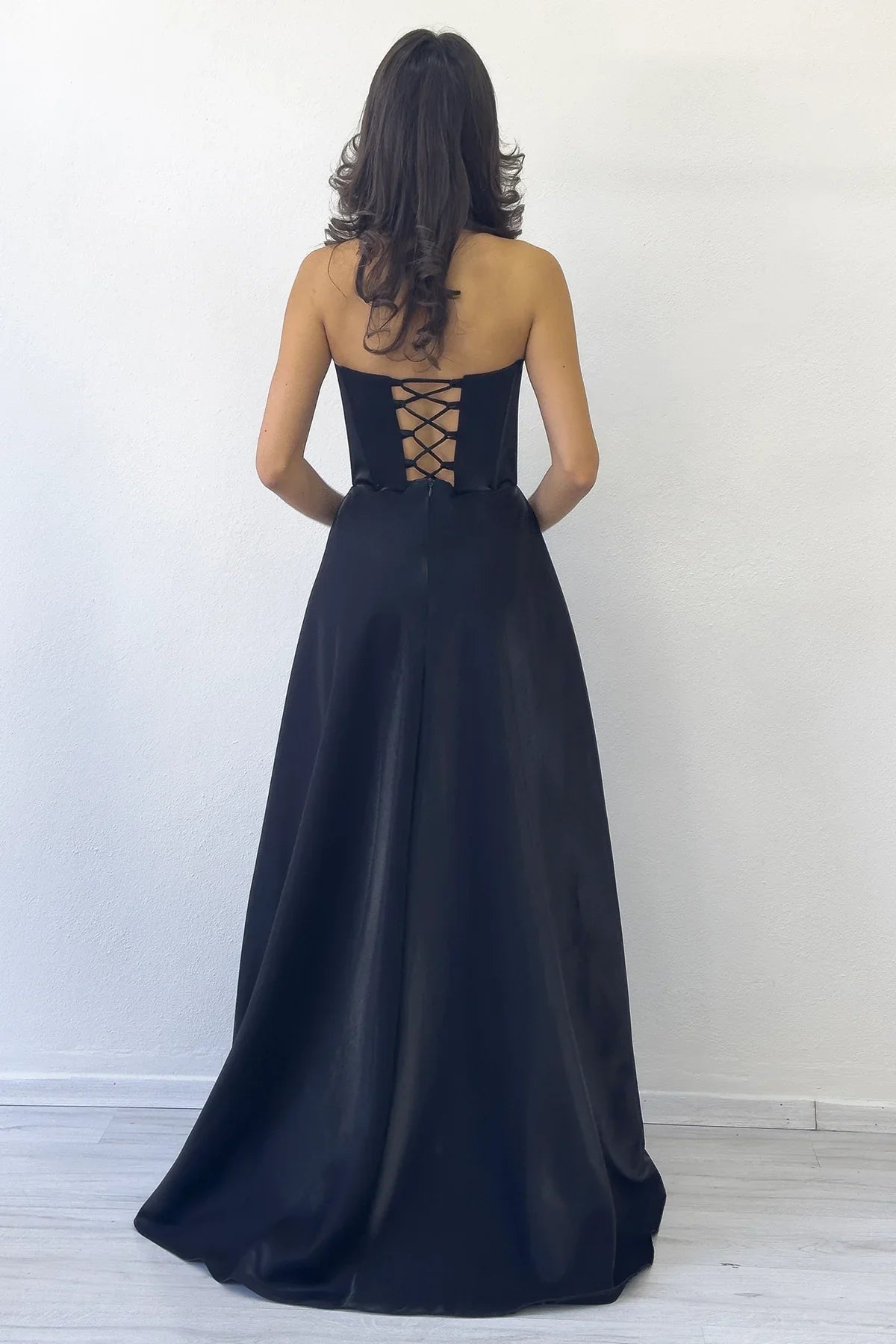 Siyah Straplez Korse Detaylı Boncuklu Sırt Dekolteli Abiye Elbise
