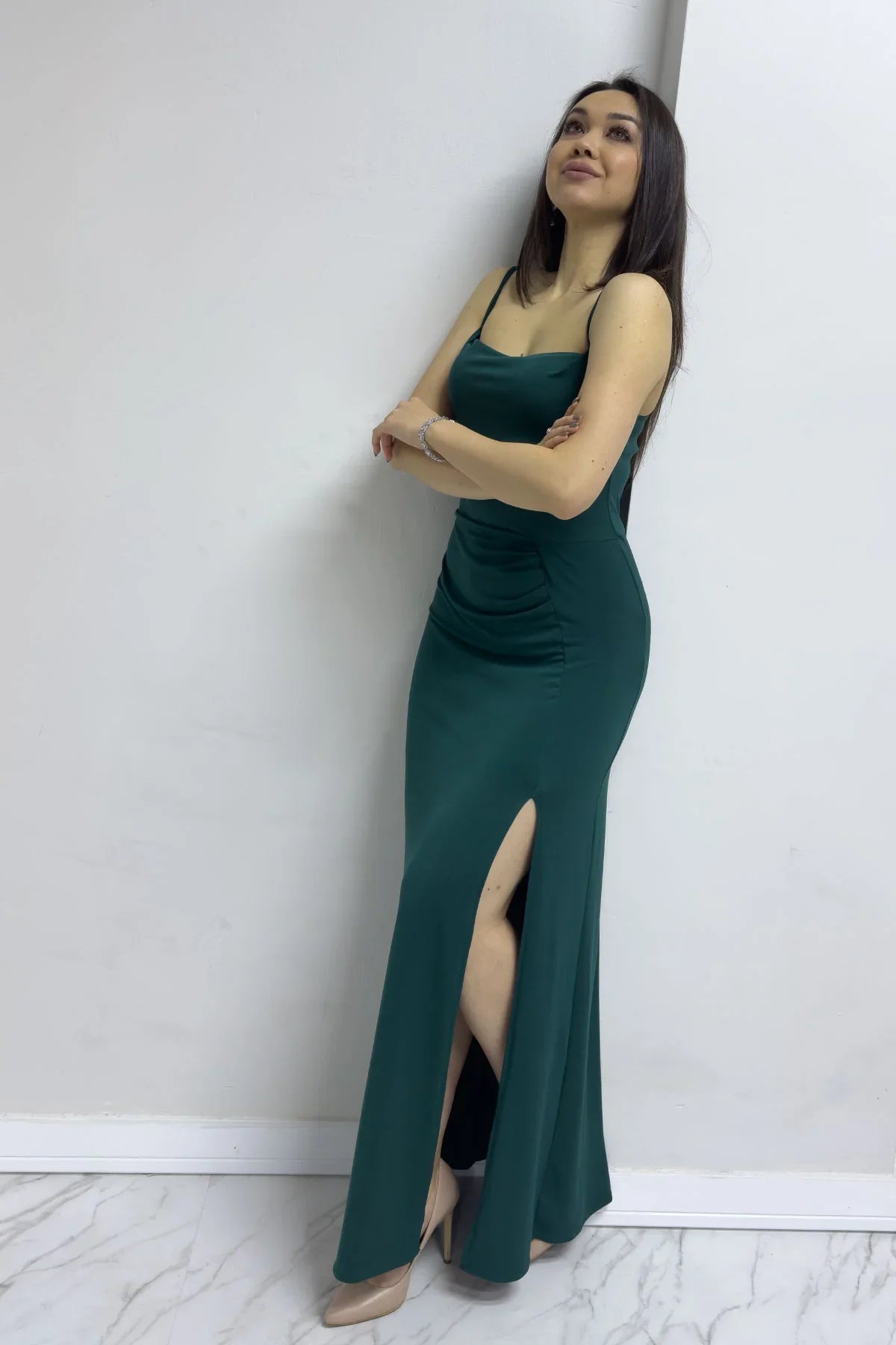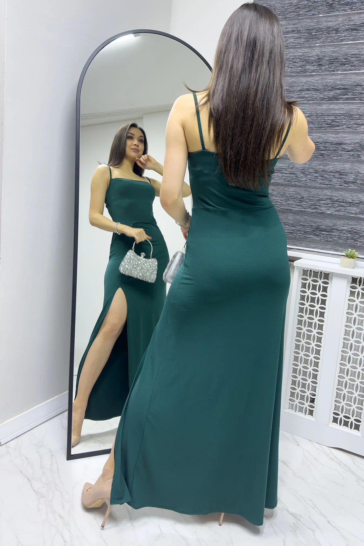 Yeşil Scuba Yırtmaçlı Askılı Elbise