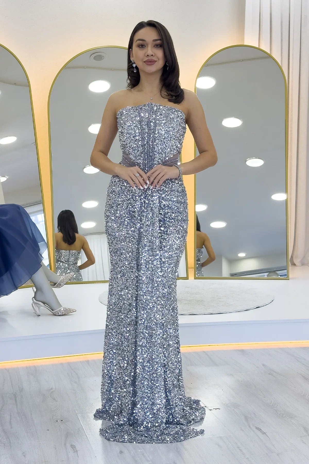 Gümüş Straplez Bel Dekolteli Pul Payet Abiye Elbise
