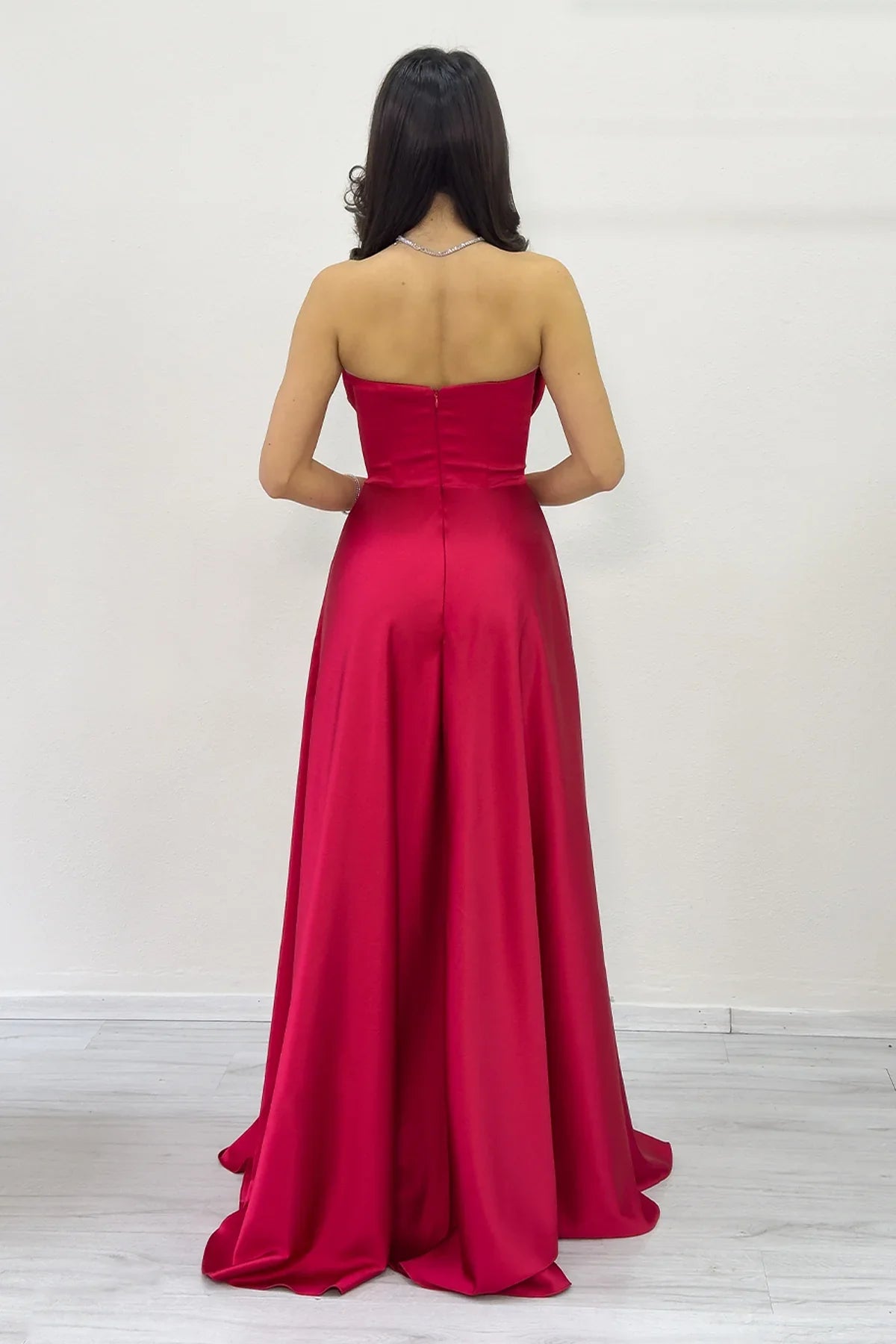 Kırmızı Straplez Saten Uzun Abiye Elbise