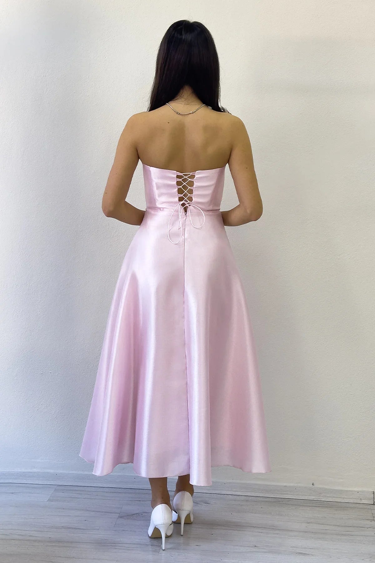 Pembe Boncuk İşlemeli Straplez Korse Görünümlü Midi Boy Prenses Abiye Elbise