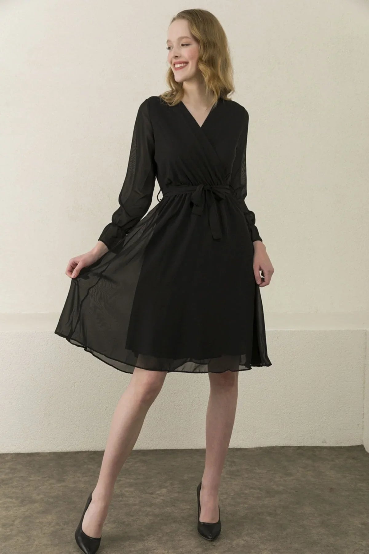Siyah Kruvaze Yaka Şifon Büyük Beden Kısa Elbise