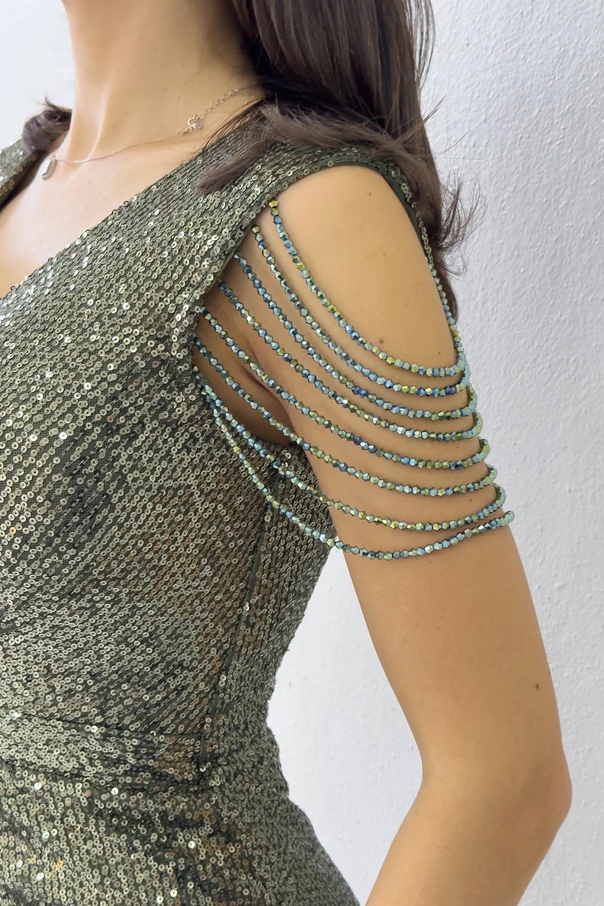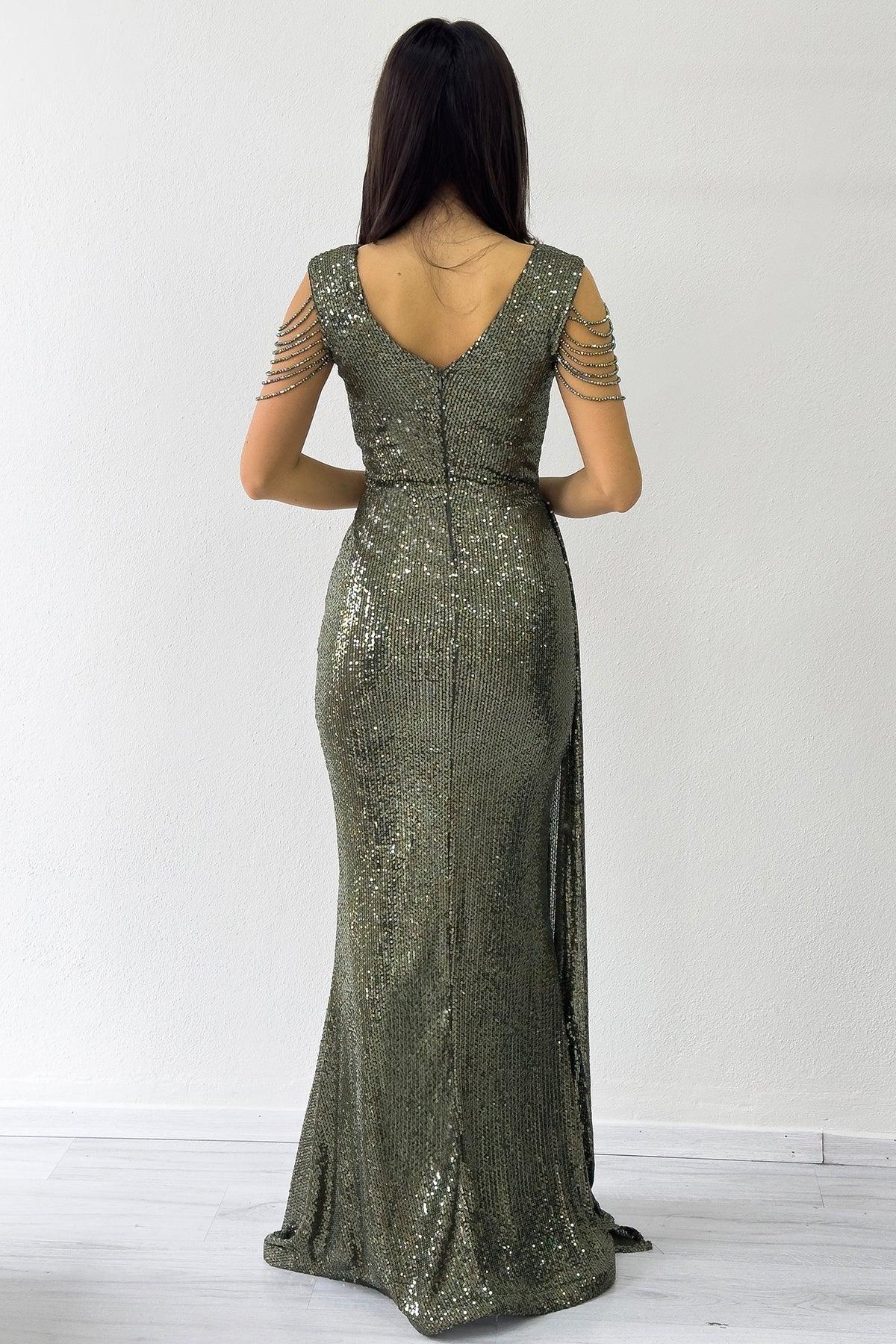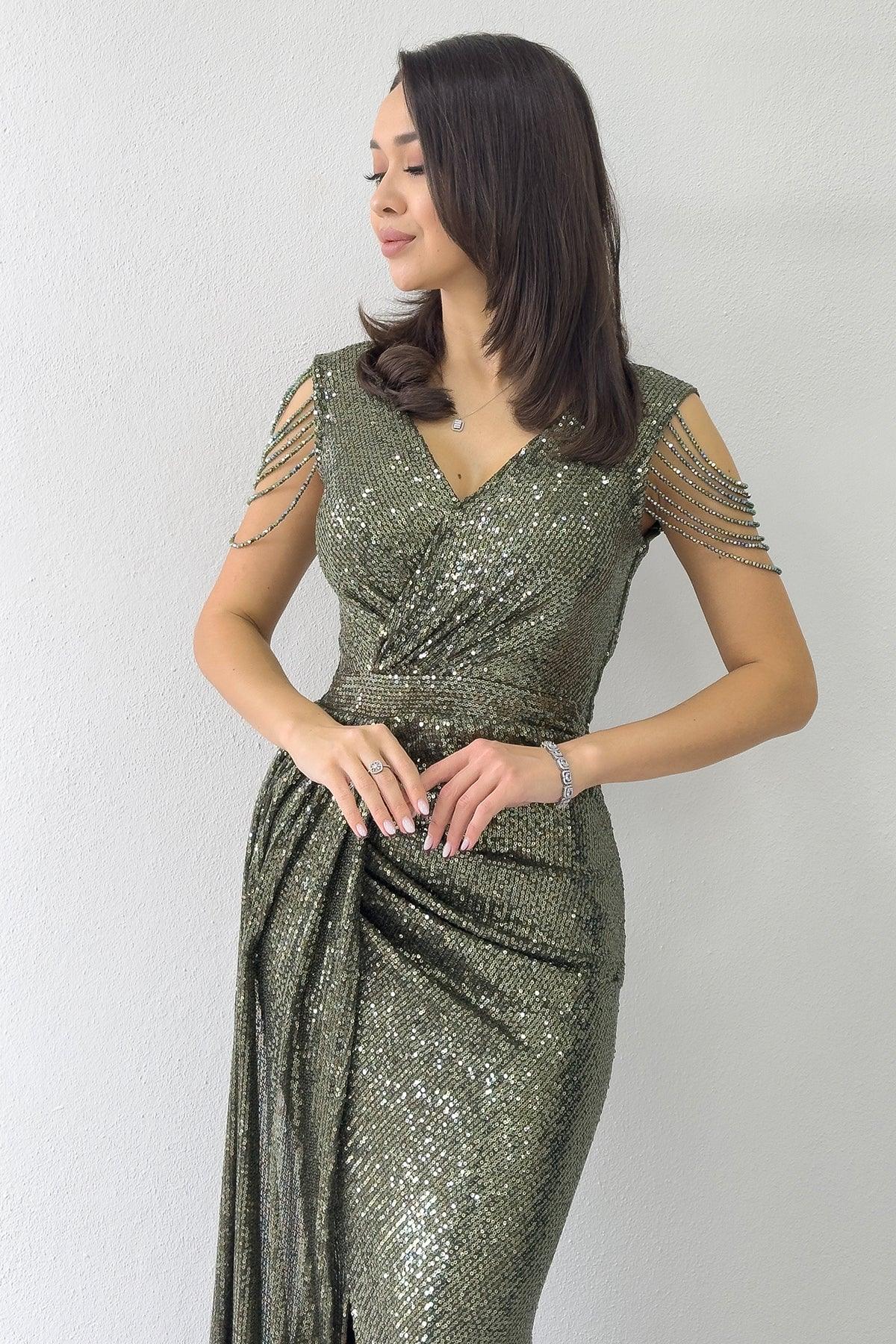 Haki Kruvaze Yaka Omuz Detay Pul Payet Büyük Beden Abiye Elbise