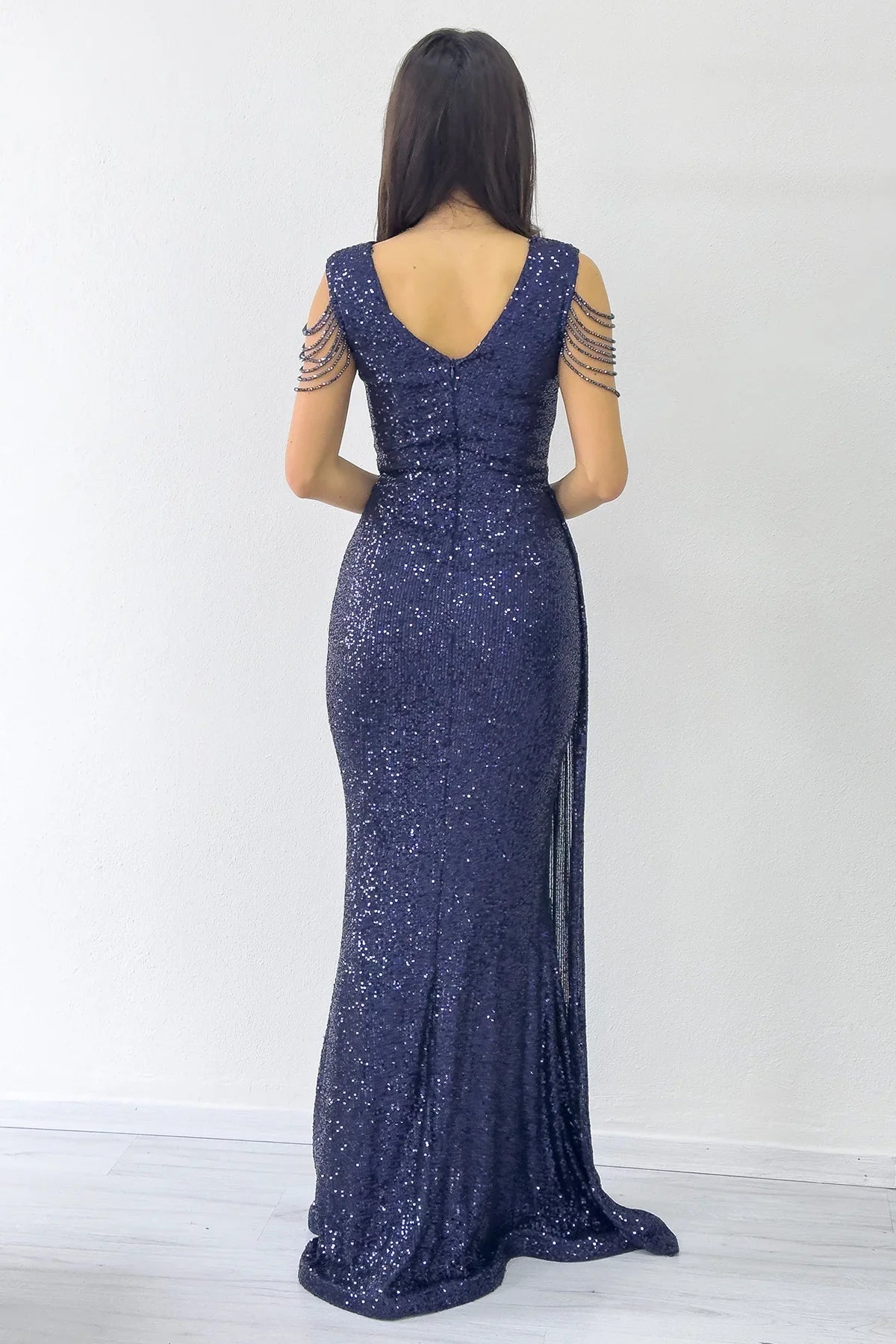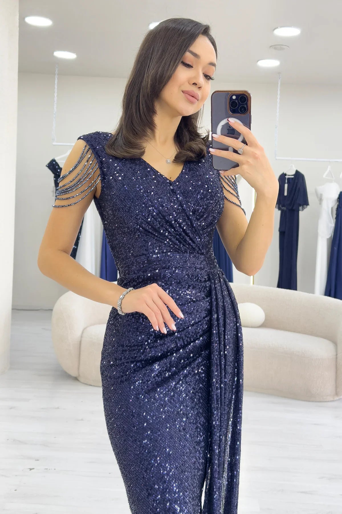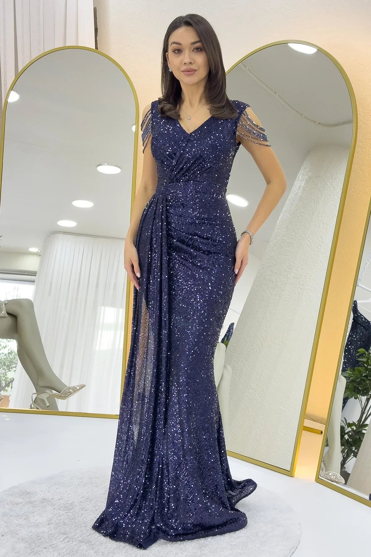 Lacivert Kruvaze Yaka Omuz Detay Pul Payet Büyük Beden Abiye Elbise