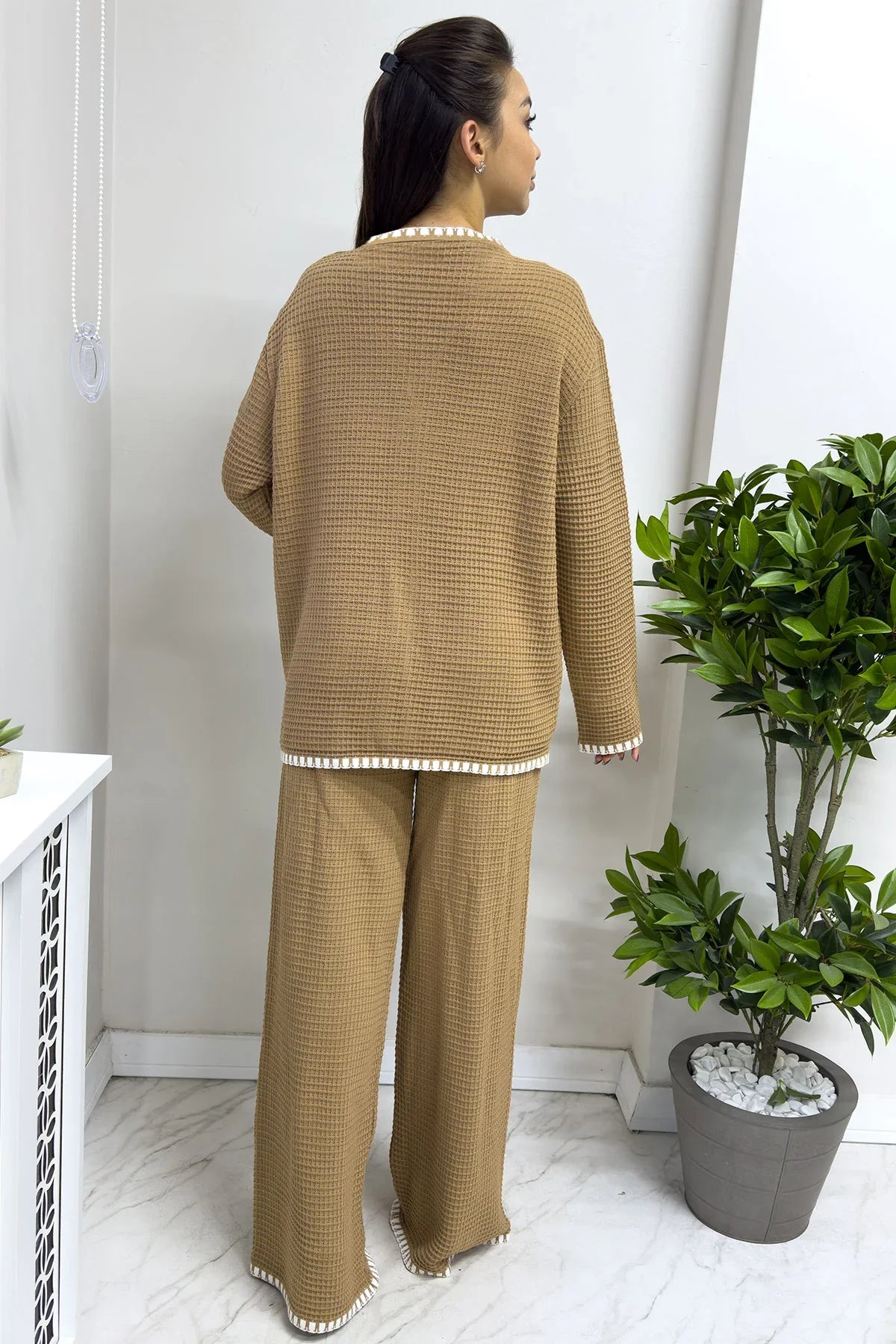 Kadın Kroşetalı Tabi Triko Pantolon Hırka Takım Doğal renklerin sıcaklığını ve modern tasarımı bir araya getiren Kadın Kroşetalı Tabi Triko Pantolon Hırka Takım, hem rahat hem de şık bir görünüm sunuyor. Kroşeta detayları ve yumuşak triko dokusu, günlük kombinlerinize zarif bir dokunuş katıyor. Renk ve Doku: Tabi rengin doğal ve huzurlu tonu, triko kumaşın yumuşak dokusuyla birleşerek sıcak bir görünüm yaratır. Kroşeta detayları, tasarıma el işçiliği hissi katarak benzersiz bir stil sunar. Tasarım Detayları: Hırka: Düğmeli ve kroşeta detaylarıyla zenginleştirilmiş, rahat kesimiyle gün boyu şıklık sunar. Pantolon: Esnek beli ve hafif dökümlü kesimiyle konforu ön planda tutar. Triko Dokusu: Yumuşak ve esnek yapısı, rahatlık ve sıcaklık sağlar. Kullanım Alanları: Günlük geziler, kahve buluşmaları veya iş sonrası aktiviteler için mükemmel bir seçenek. Şık bir spor ayakkabı veya loafer ile kombinlendiğinde hem sade hem de modern bir görünüm sağlar. Faydaları: Takım olarak kombin kolaylığı sunar ve parçalar ayrı ayrı kullanılabilir. Büyük beden seçenekleriyle her vücut tipine uygun bir deneyim sunar. Bu zarif takım, "kroşetalı triko takım," "tabi renk pantolon hırka kombin," veya "büyük beden doğal tonlarda günlük triko takımlar" gibi aramalarda öne çıkar. Şimdi The ZKS’i ziyaret edin ve gardırobunuza doğal bir zarafet katın!