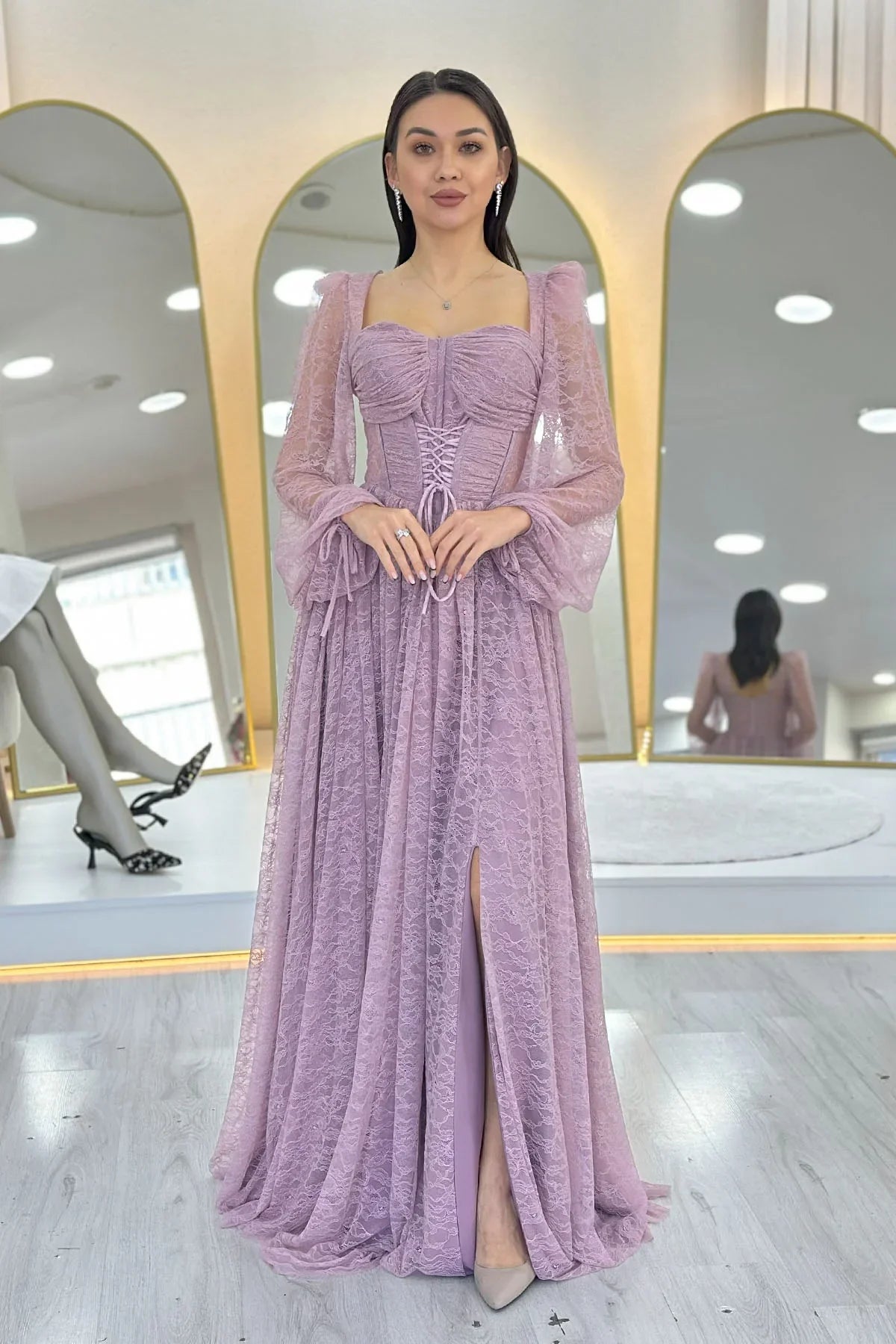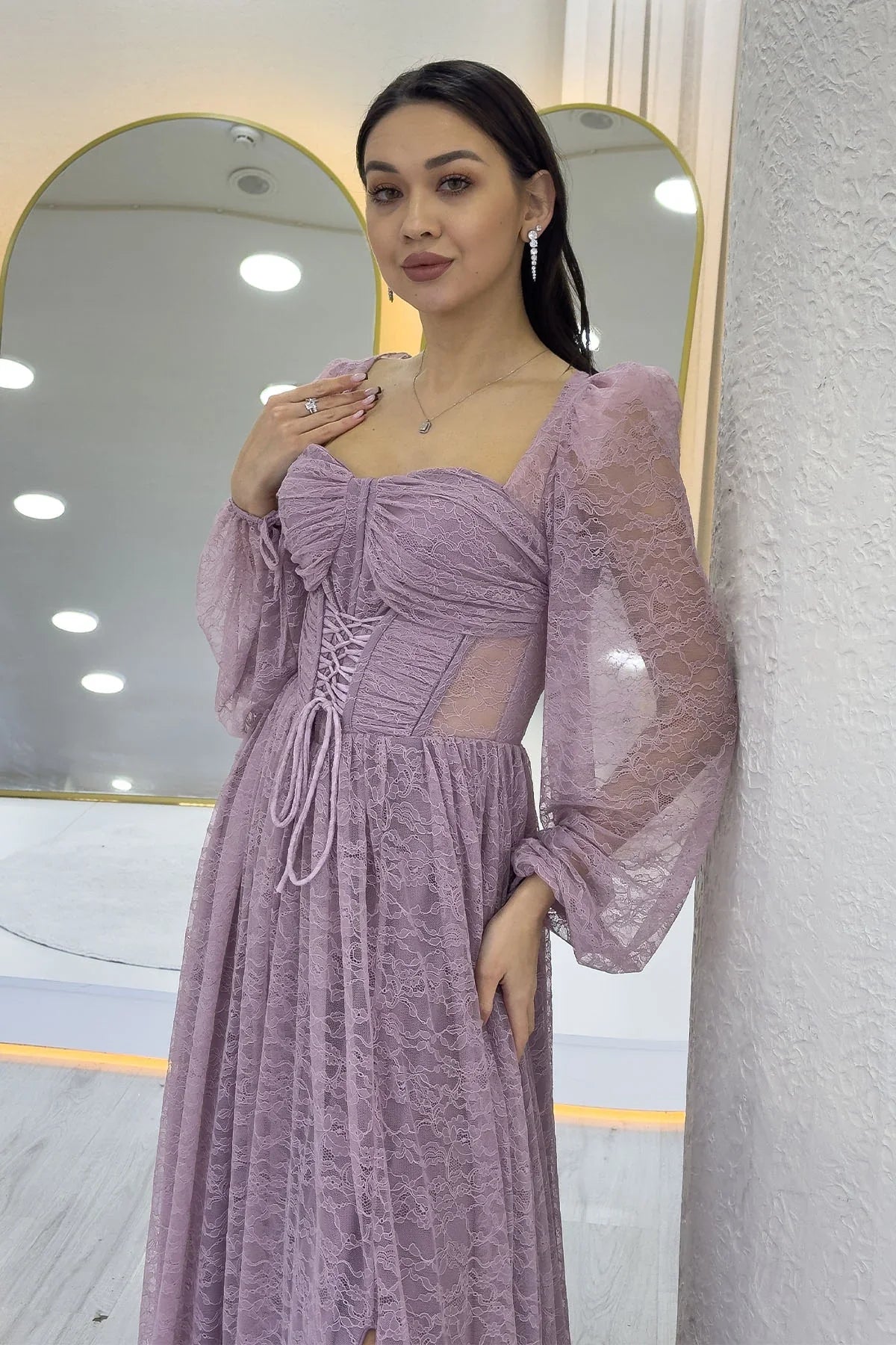 Pudra Dantel Kumaş Korse Detaylı Uzun Yırtmaçlı Abiye Elbise