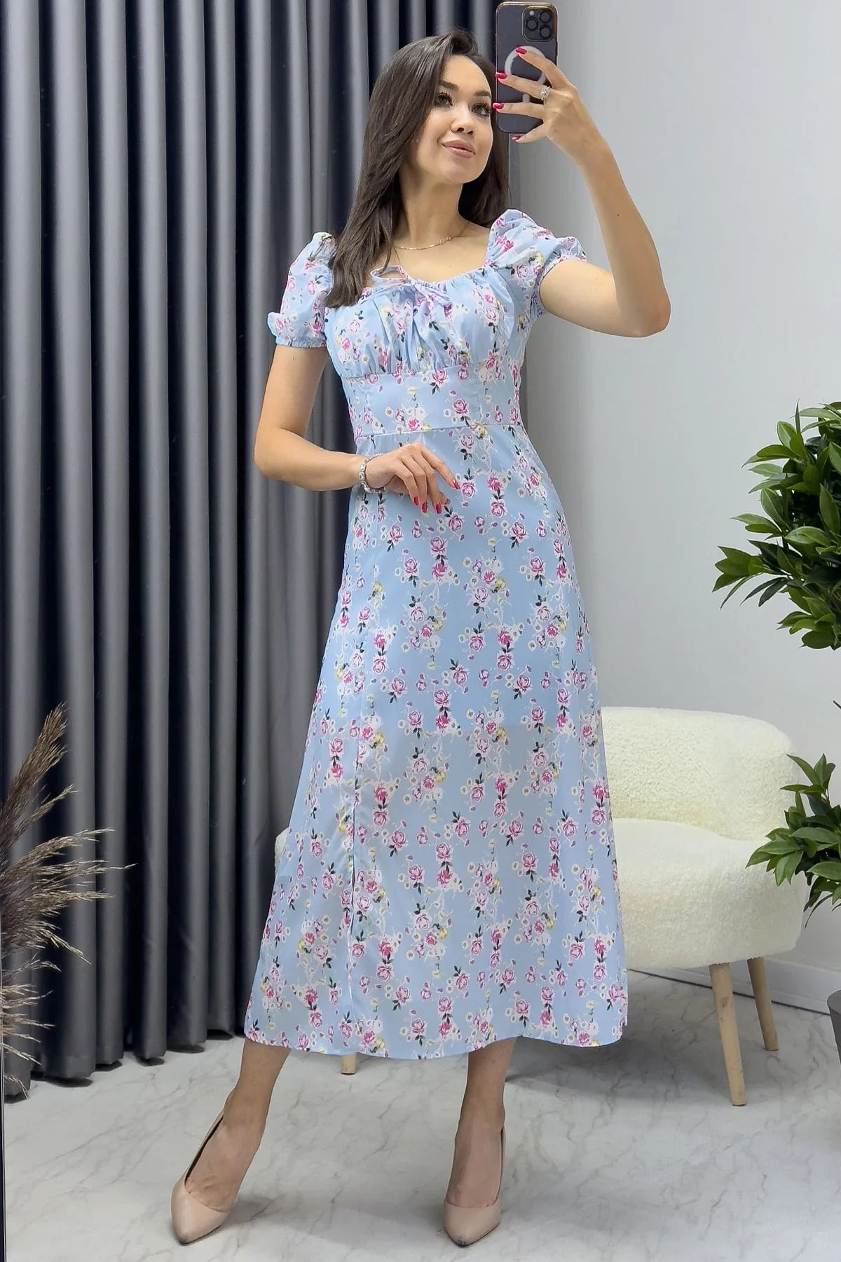 Kadın Mavi Yaka Bağcıklı Çiçekli Kısa Kol Elbise