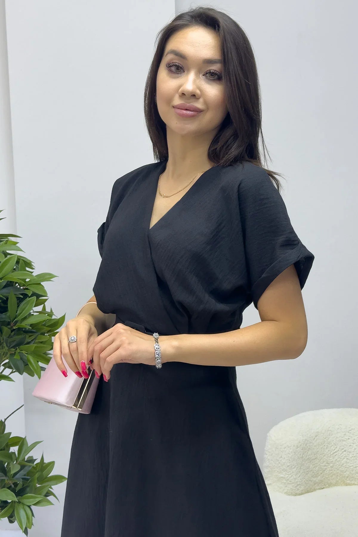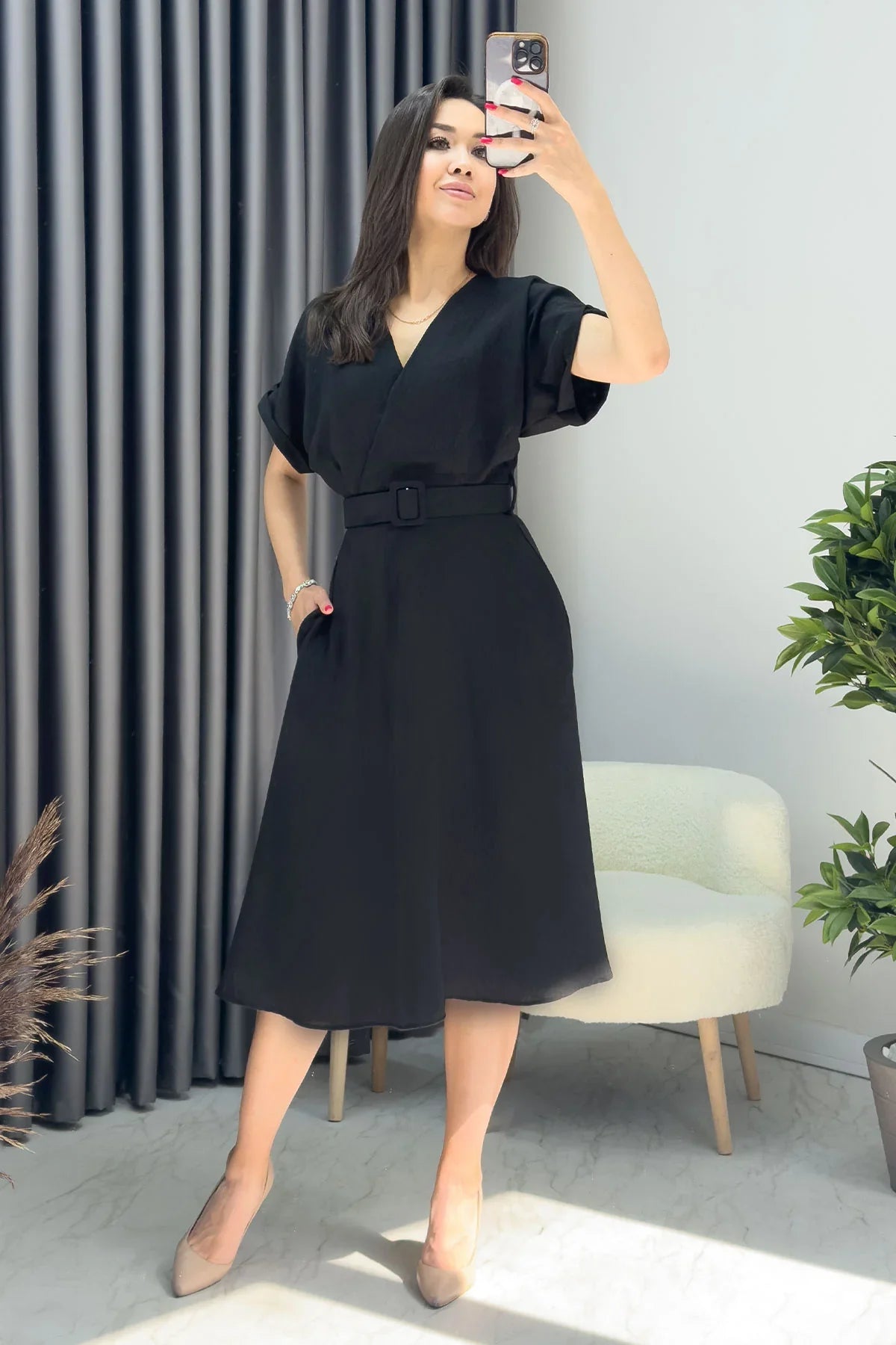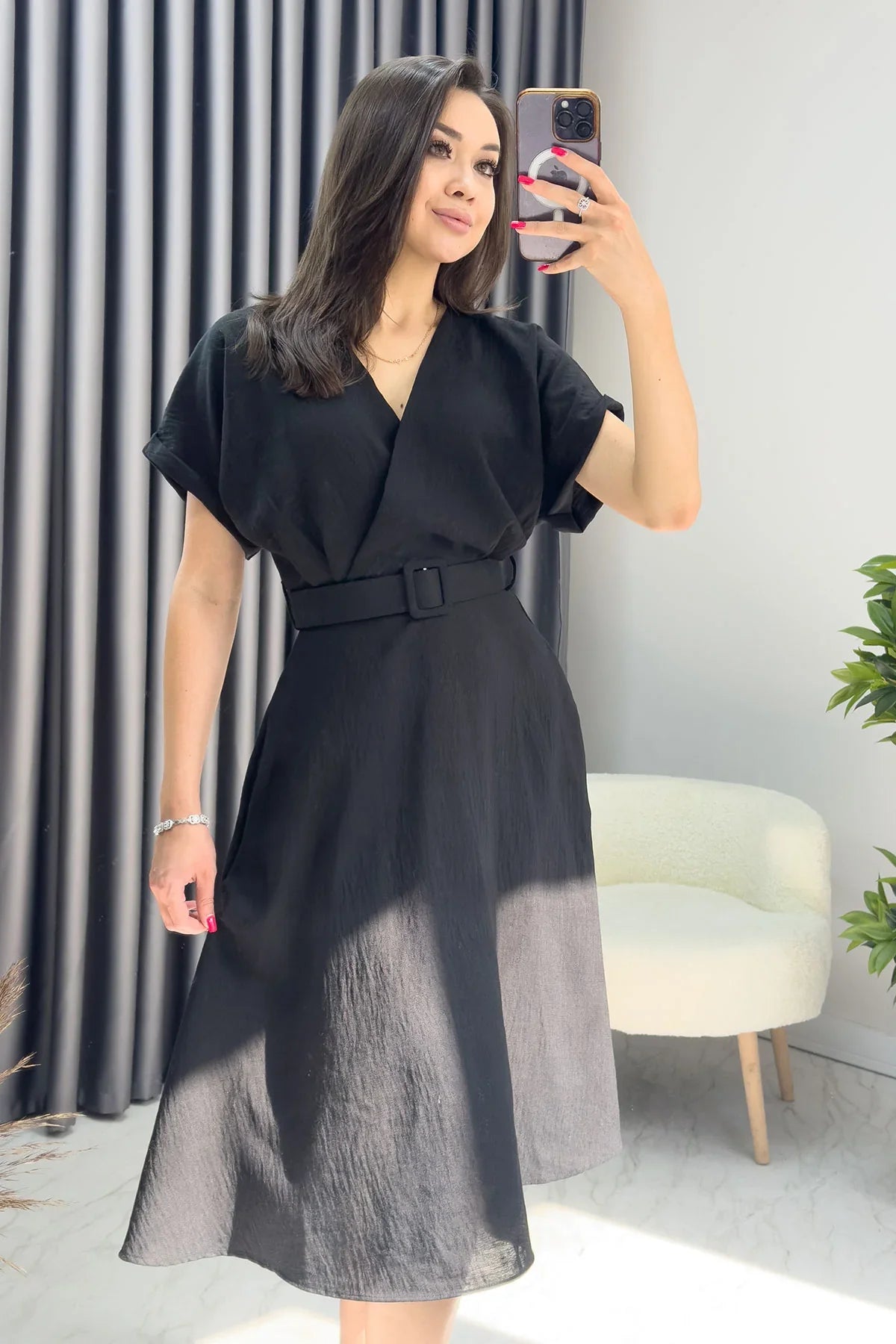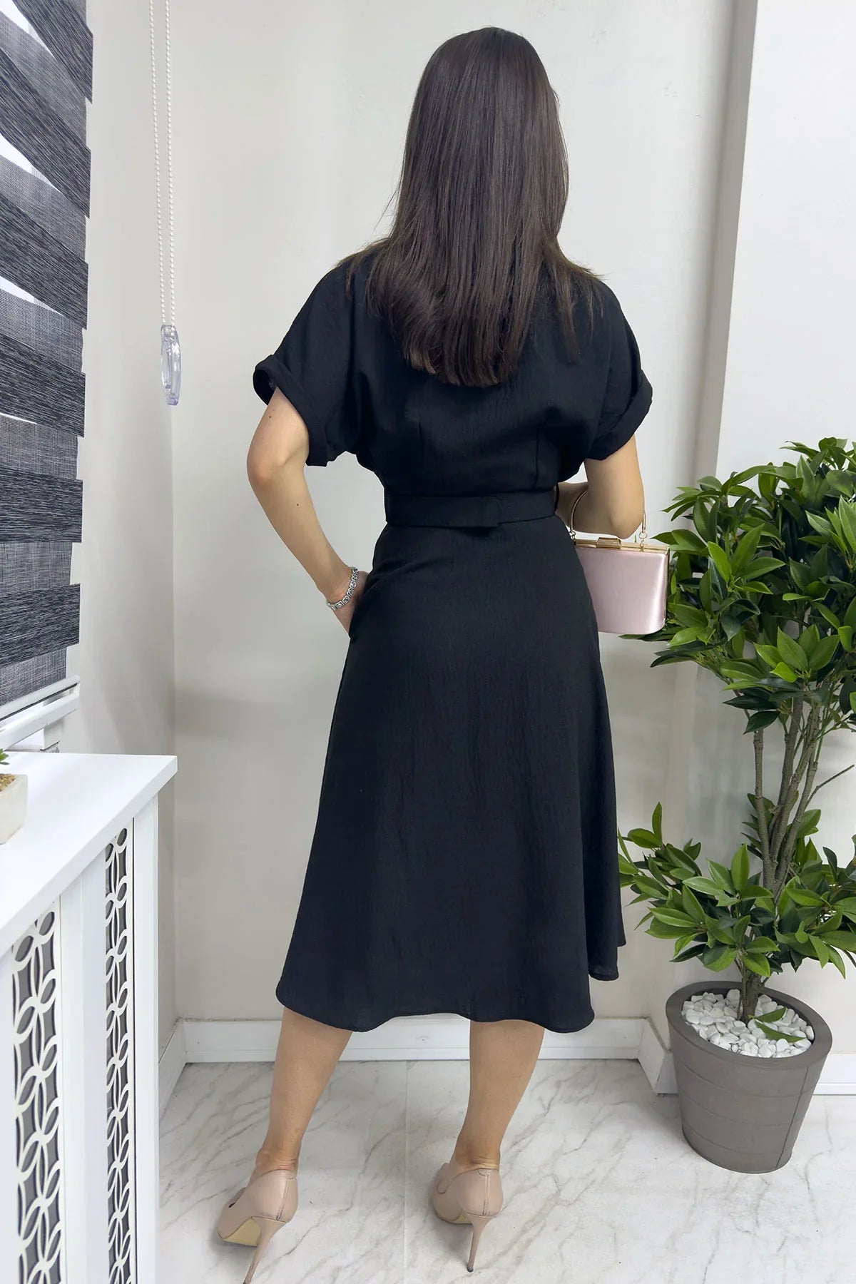 Kadın Siyah Keten Kemerli Midi Cepli Elbise