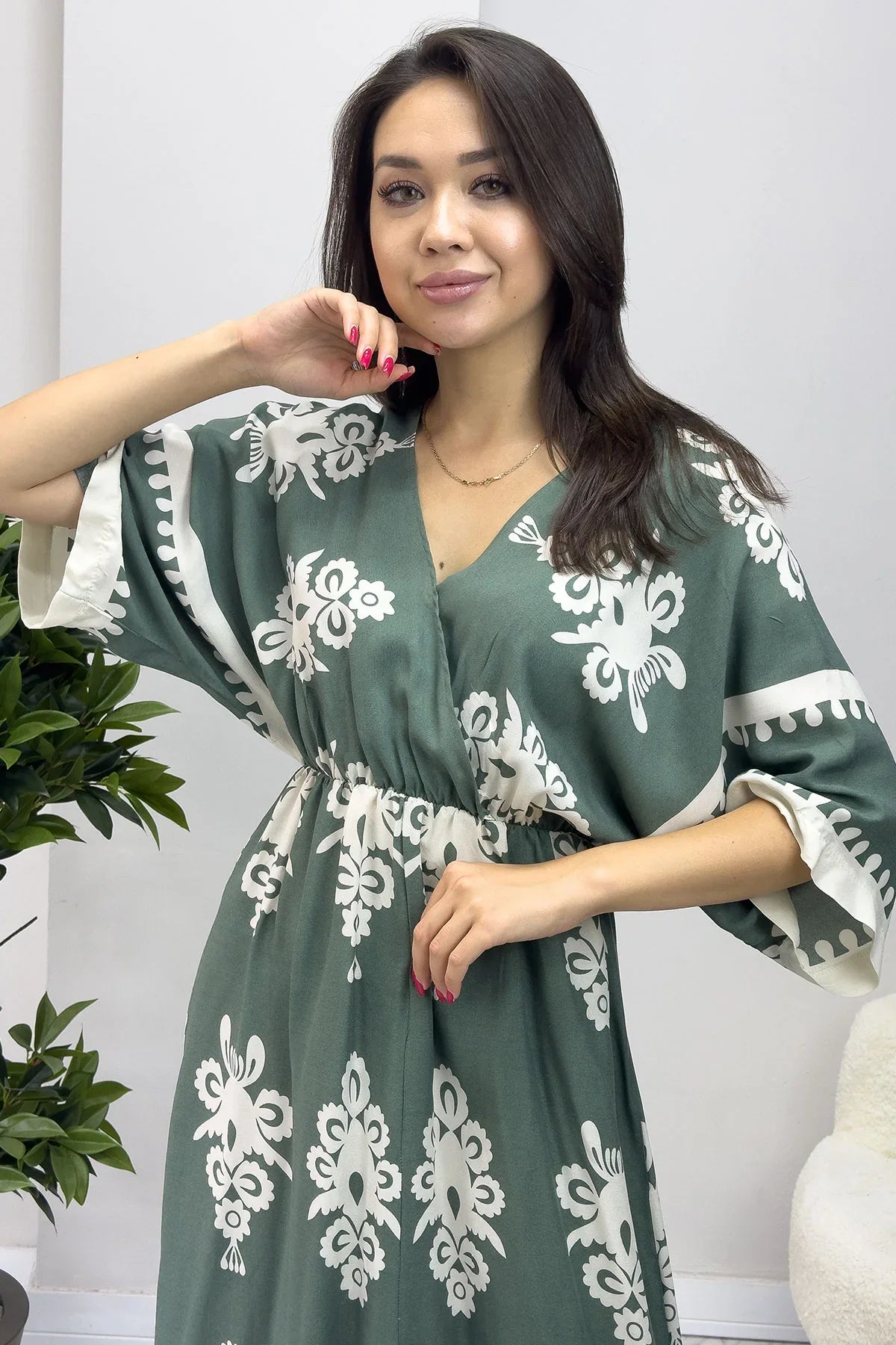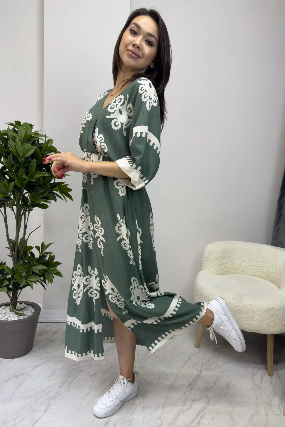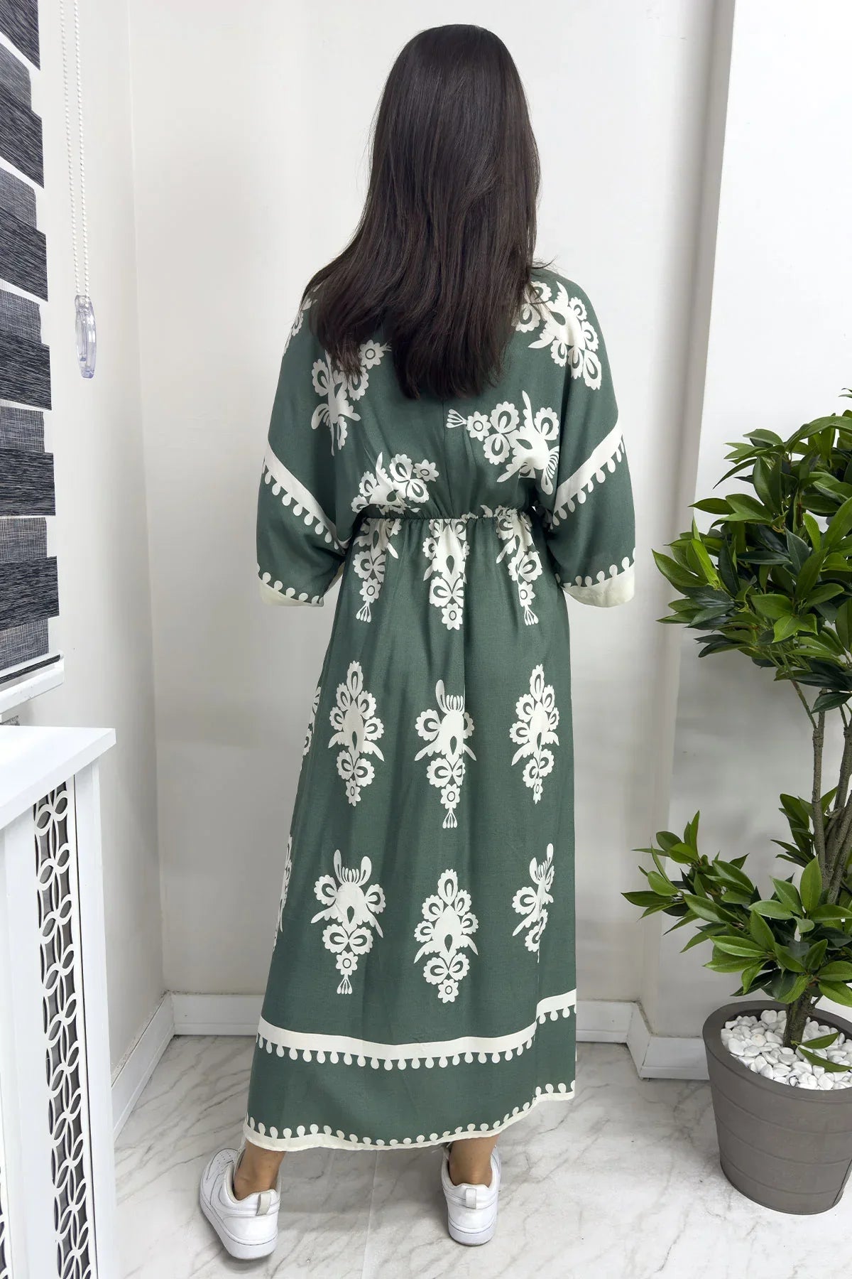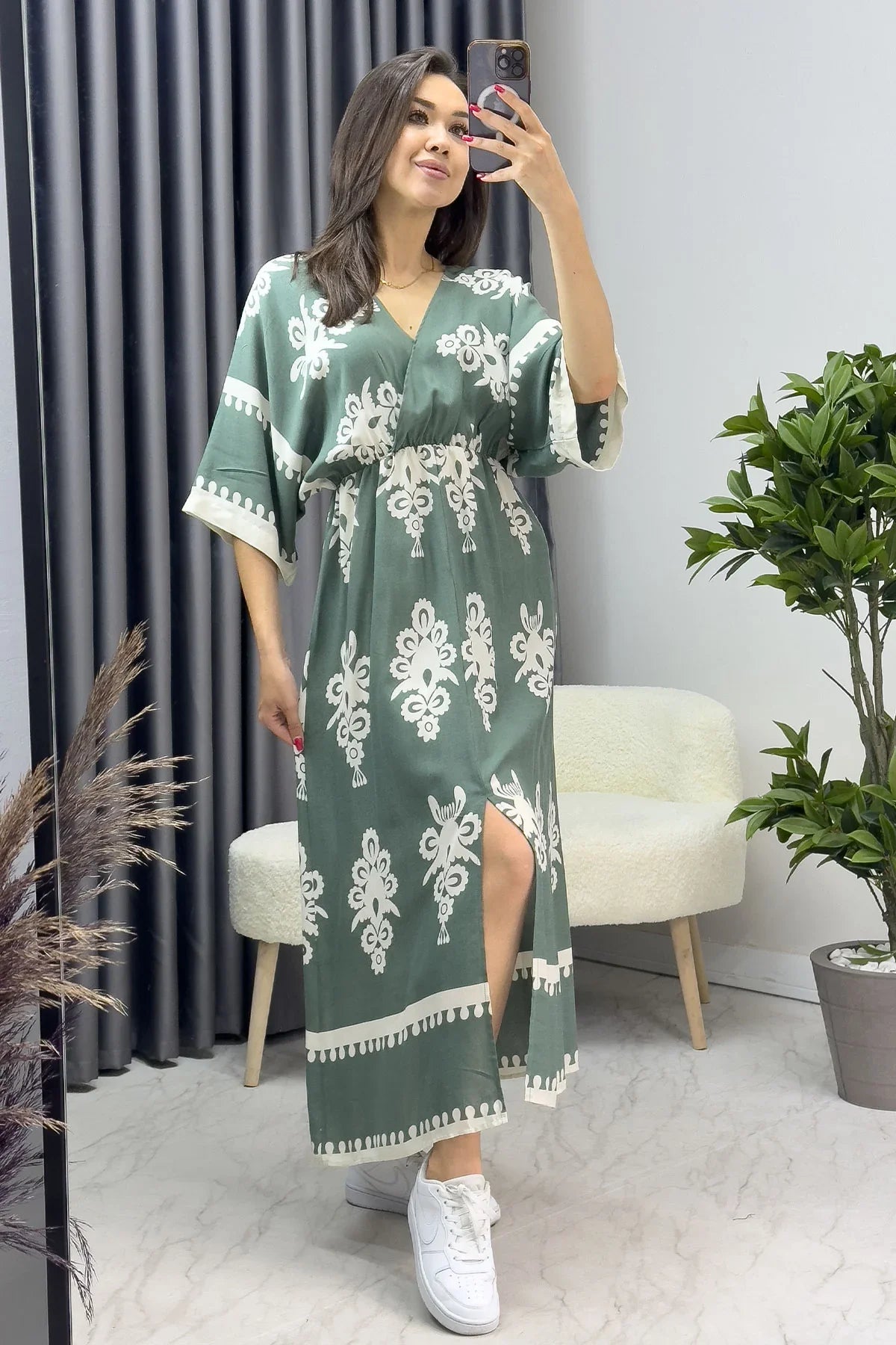 Kadın Yeşil Yırtmaç Detaylı Kruvaze Yaka Uzun Yazlık Elbise