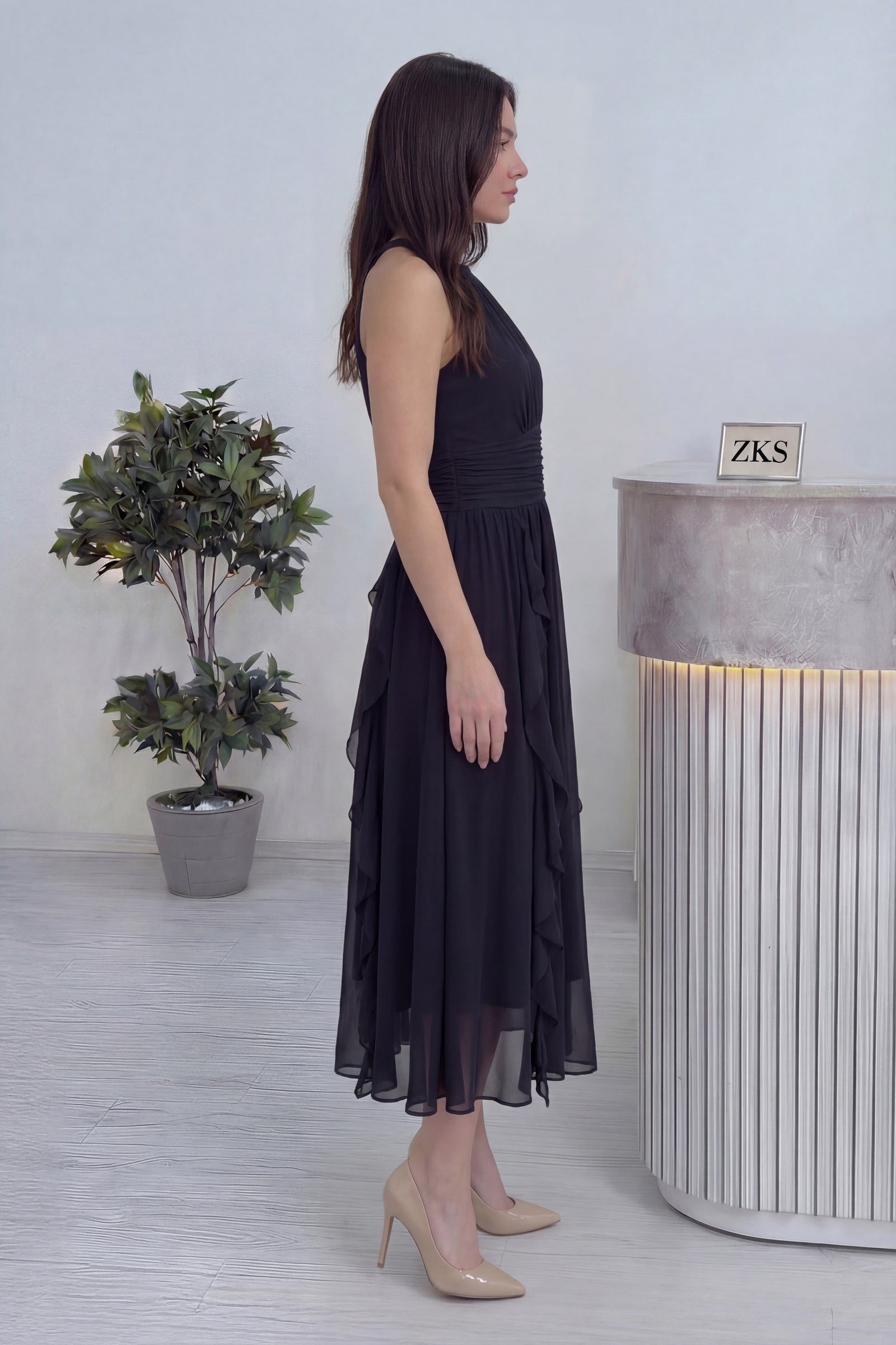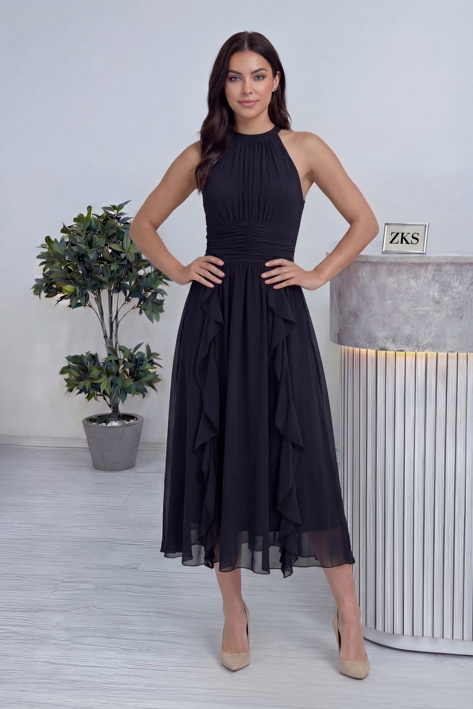 Siyah Halter Yaka Eteği Fırfırlı Midi Boy Şifon Elbise