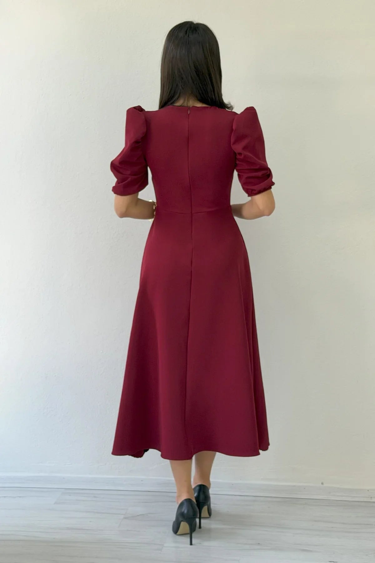 Bordo Balon Kol Midi Boy Volanlı Elbise
