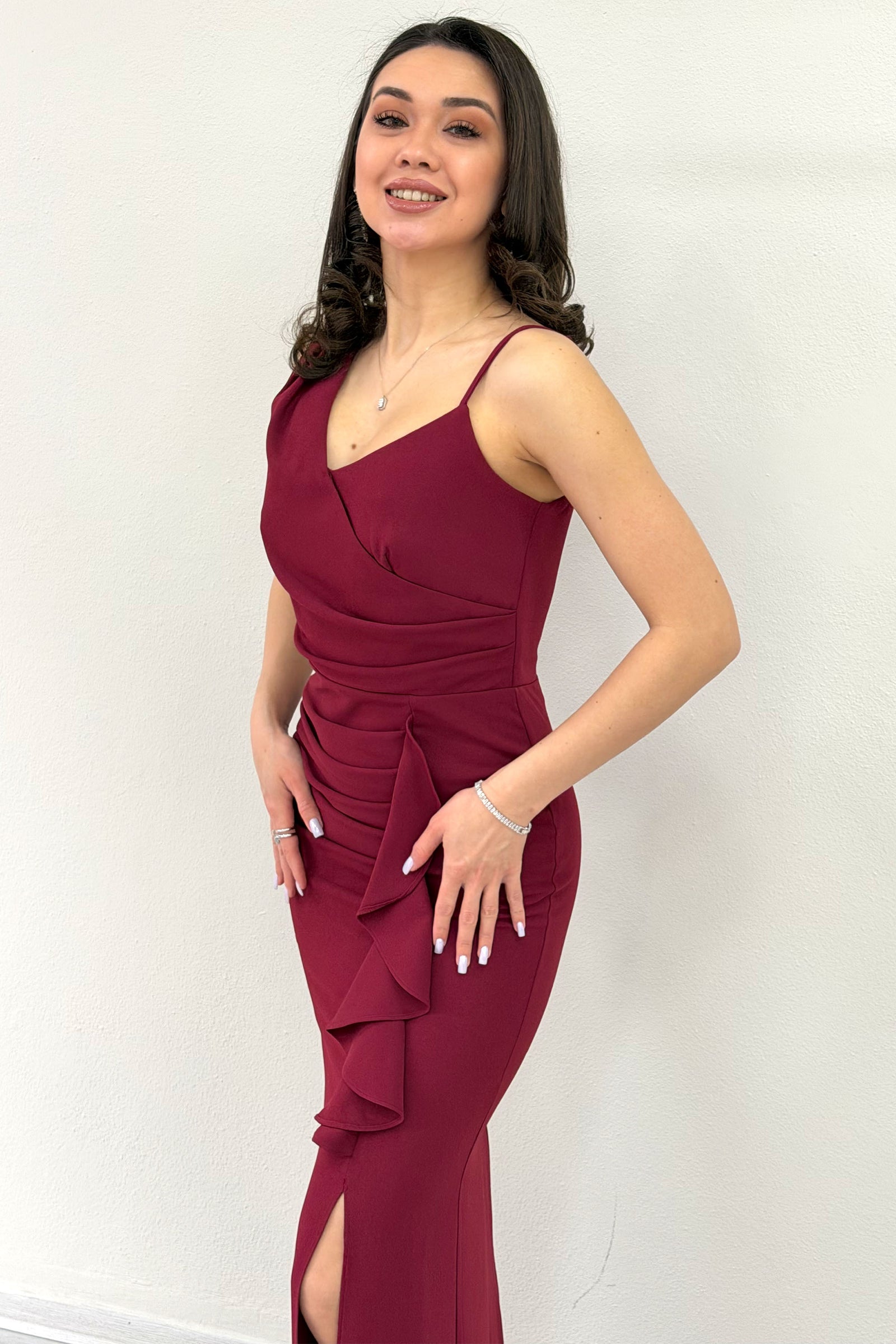 Bordo Ön Fırfırlı Asimetrik Yaka Yırtmaçlı Abiye Elbise
