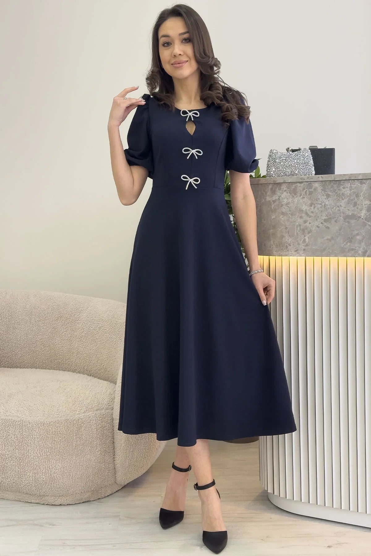 Kadın Lacivert Fiyonk Detay Midi Kısa Kol Elbise