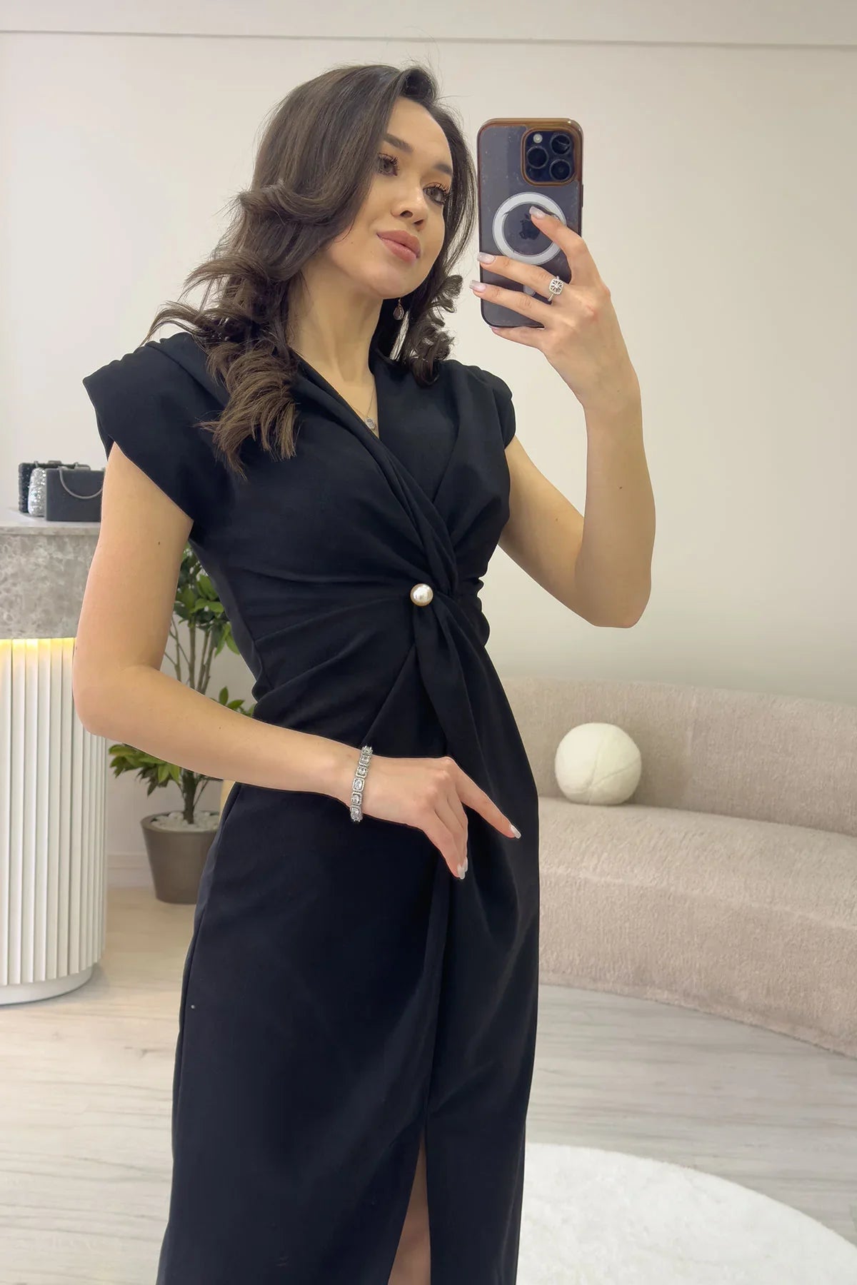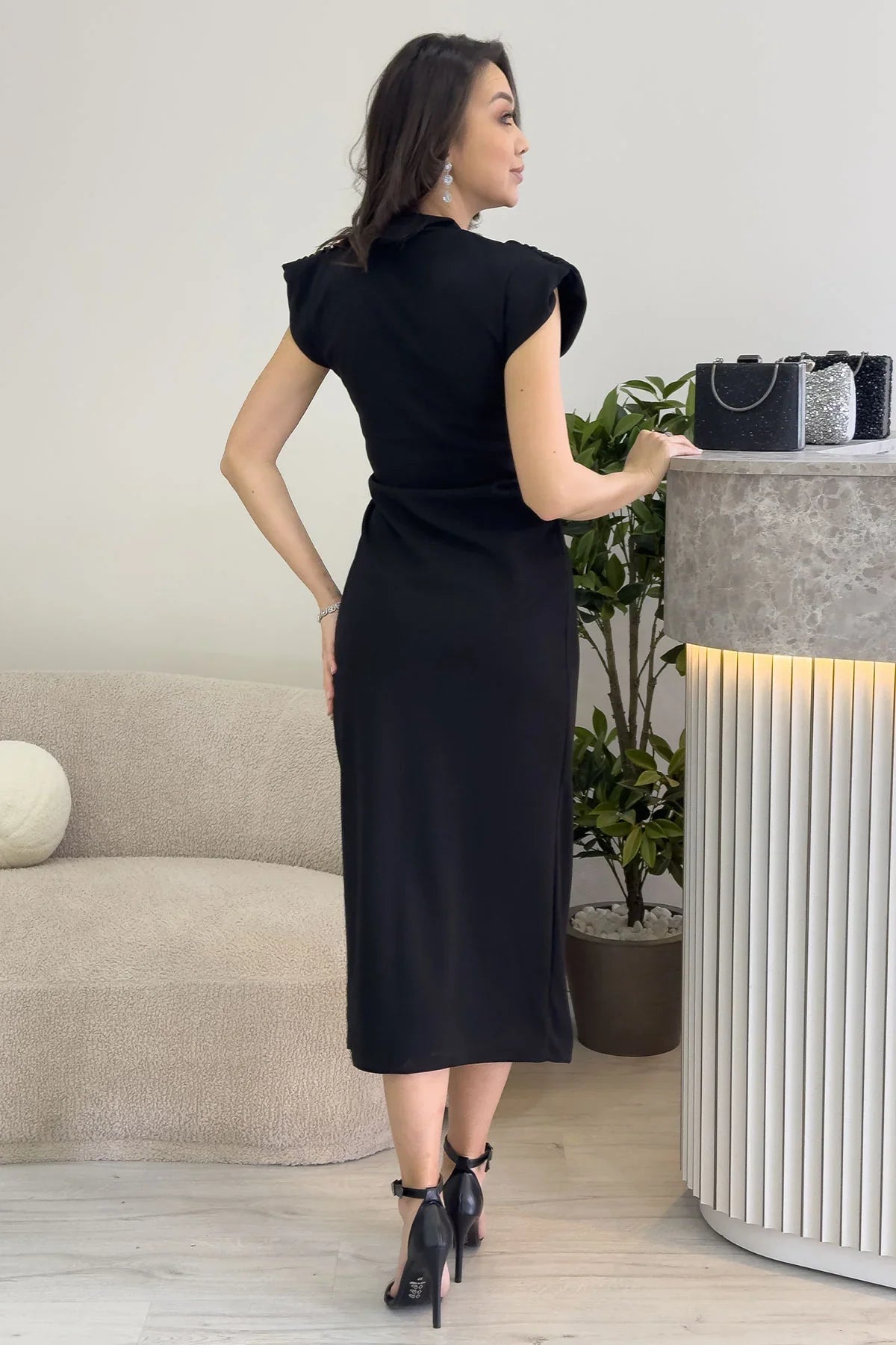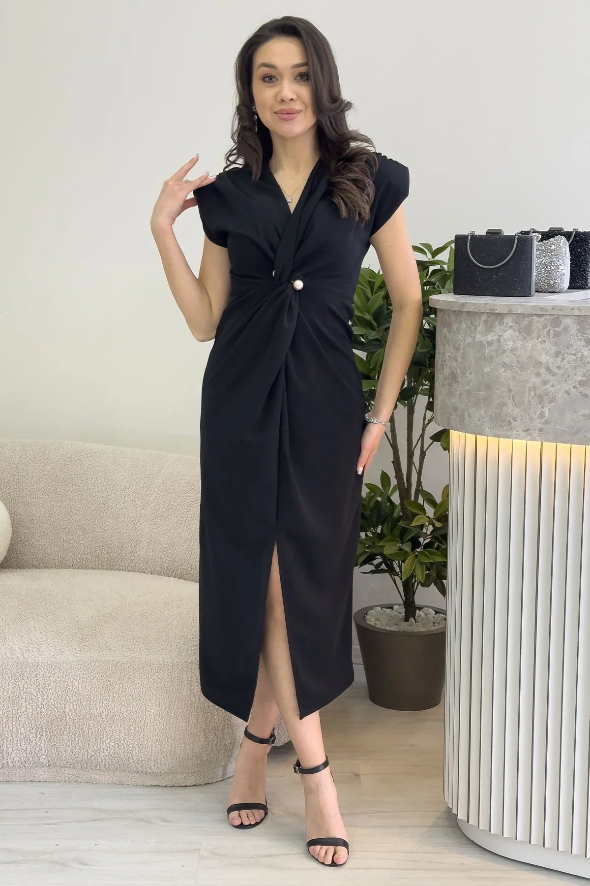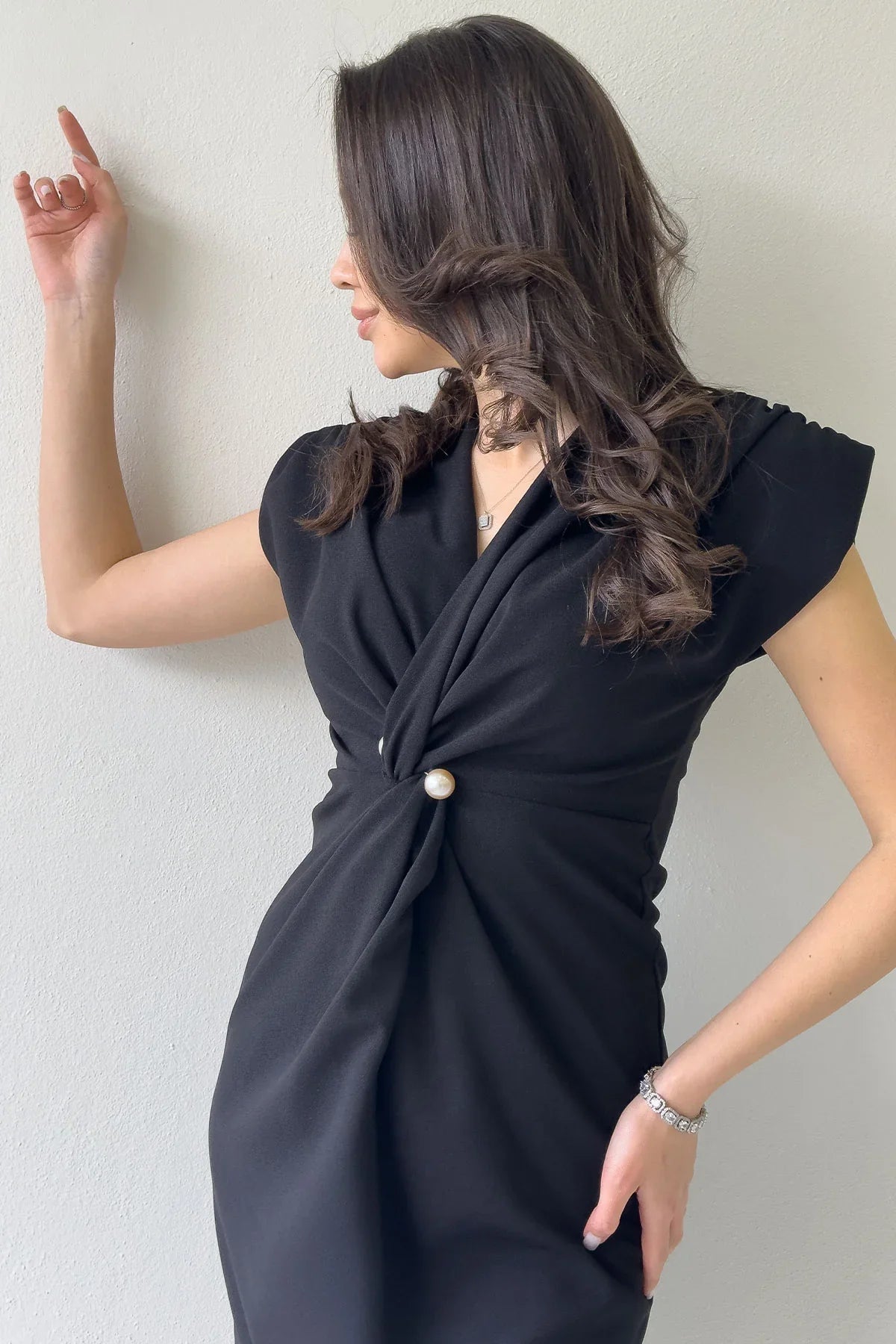Kadın Siyah Kruvaze Yaka İnci Detay Büzgülü Midi Boy Elbise