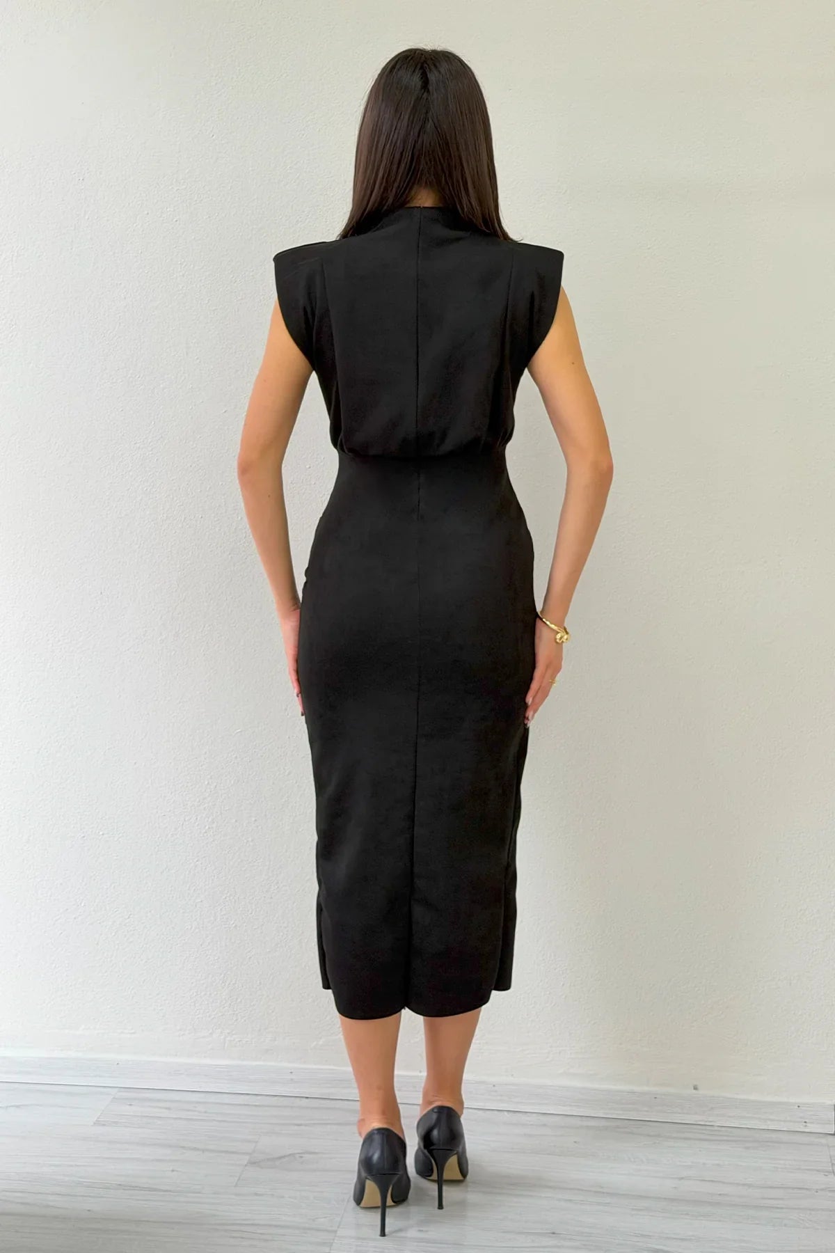 Kadın Siyah Vatkalı Drape Detaylı Süet Elbise