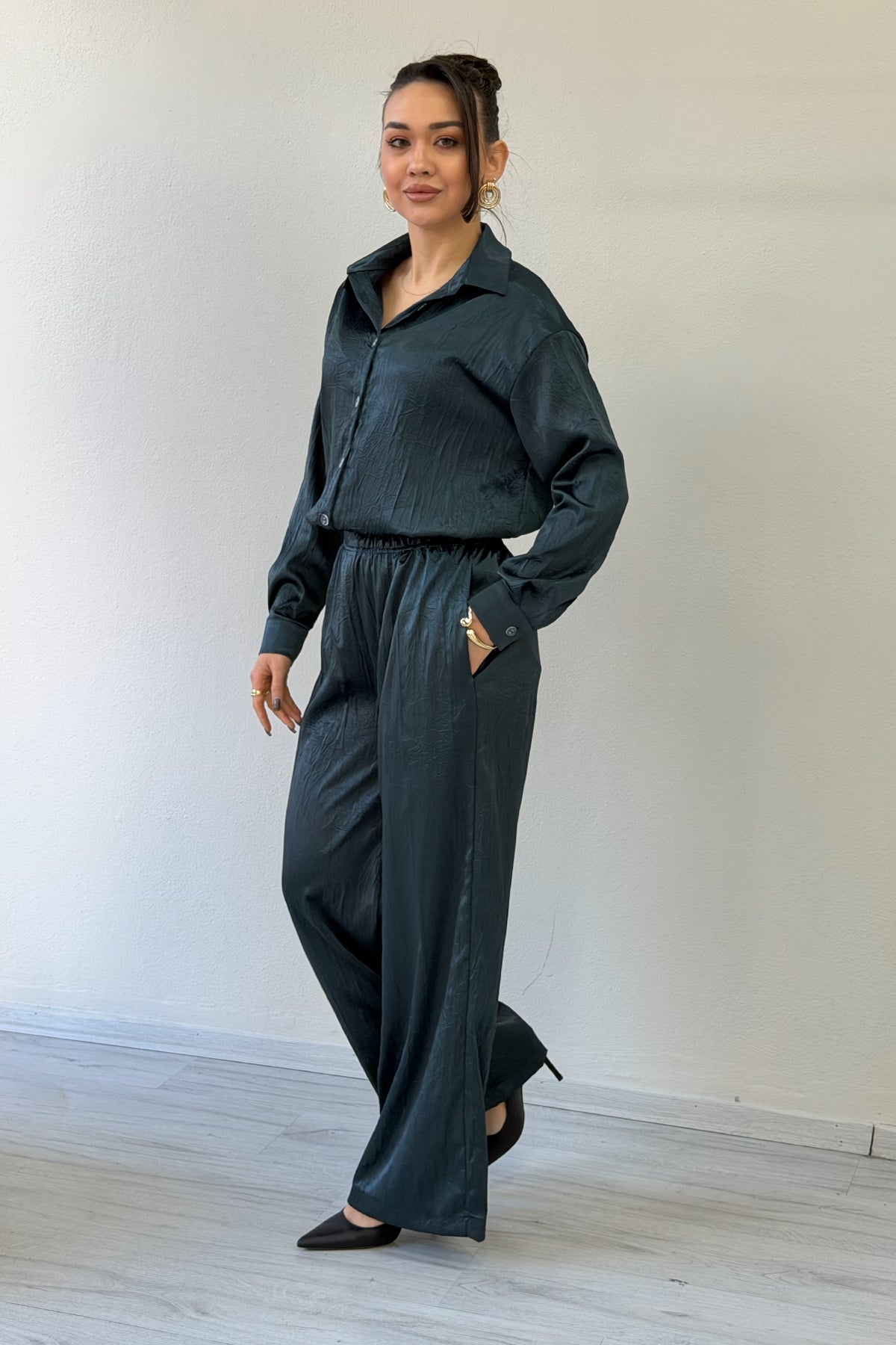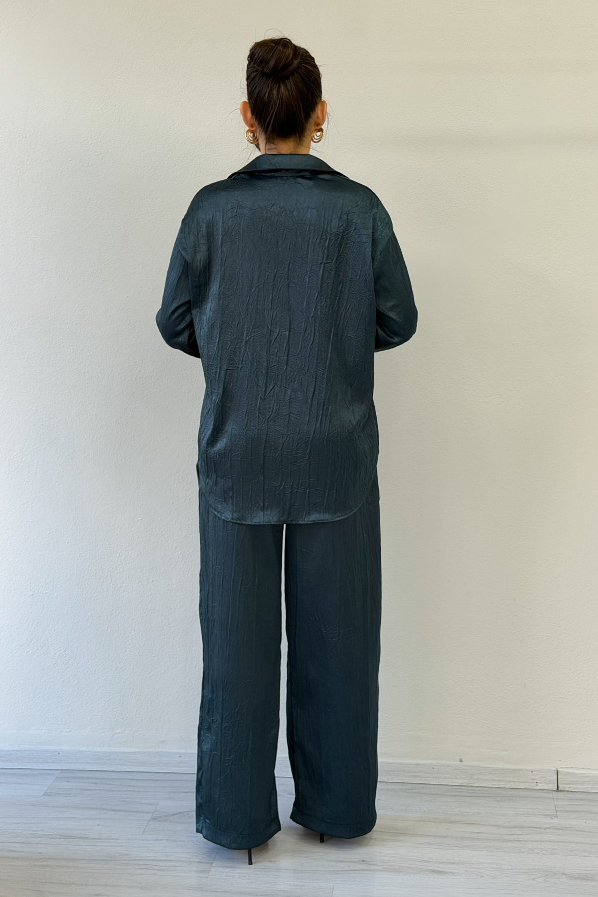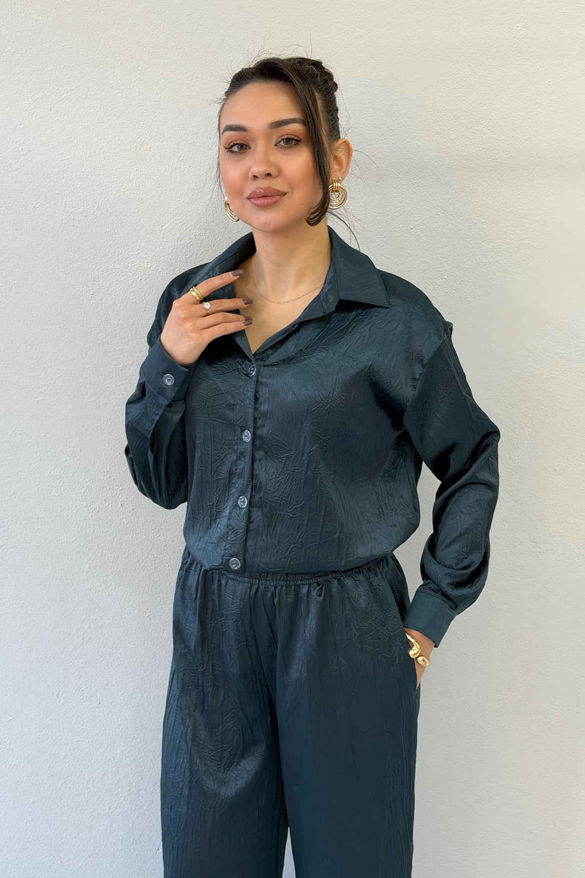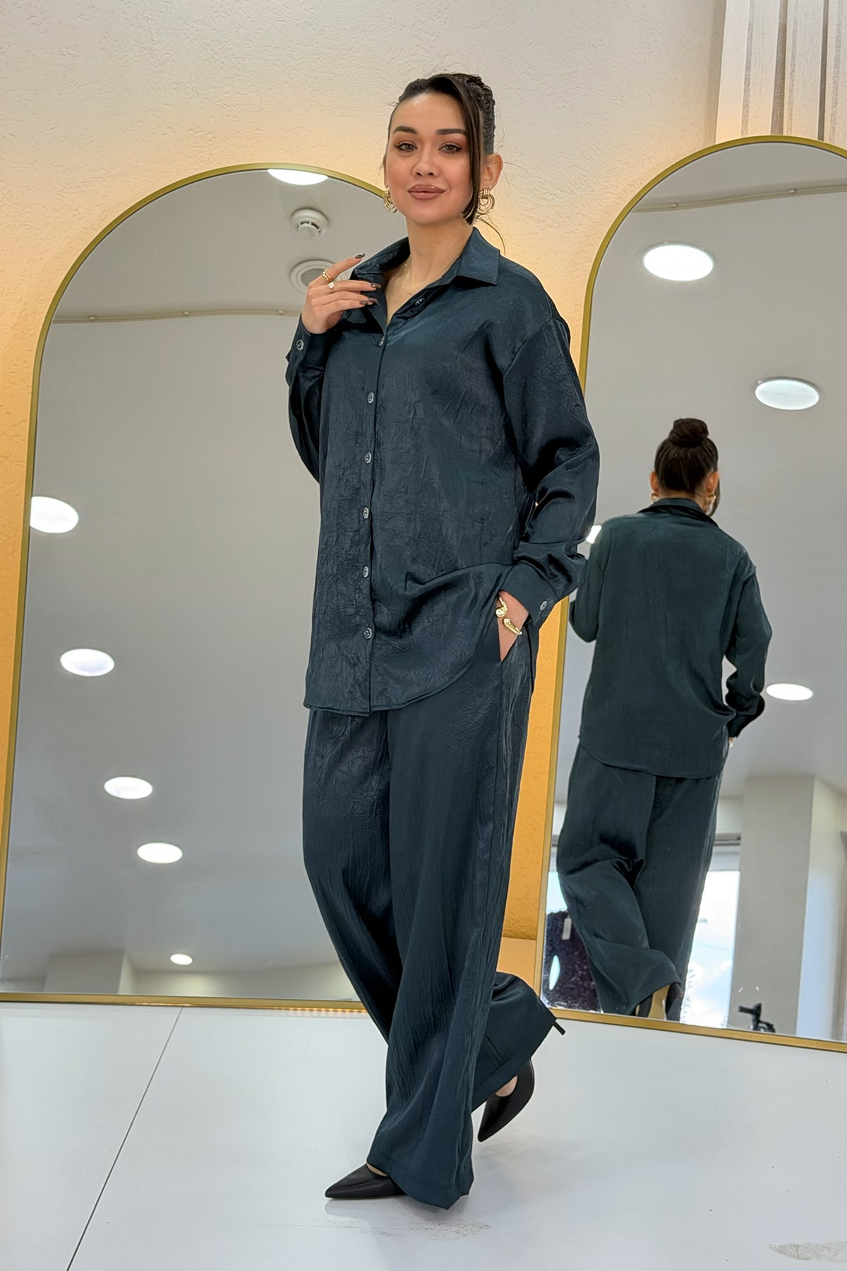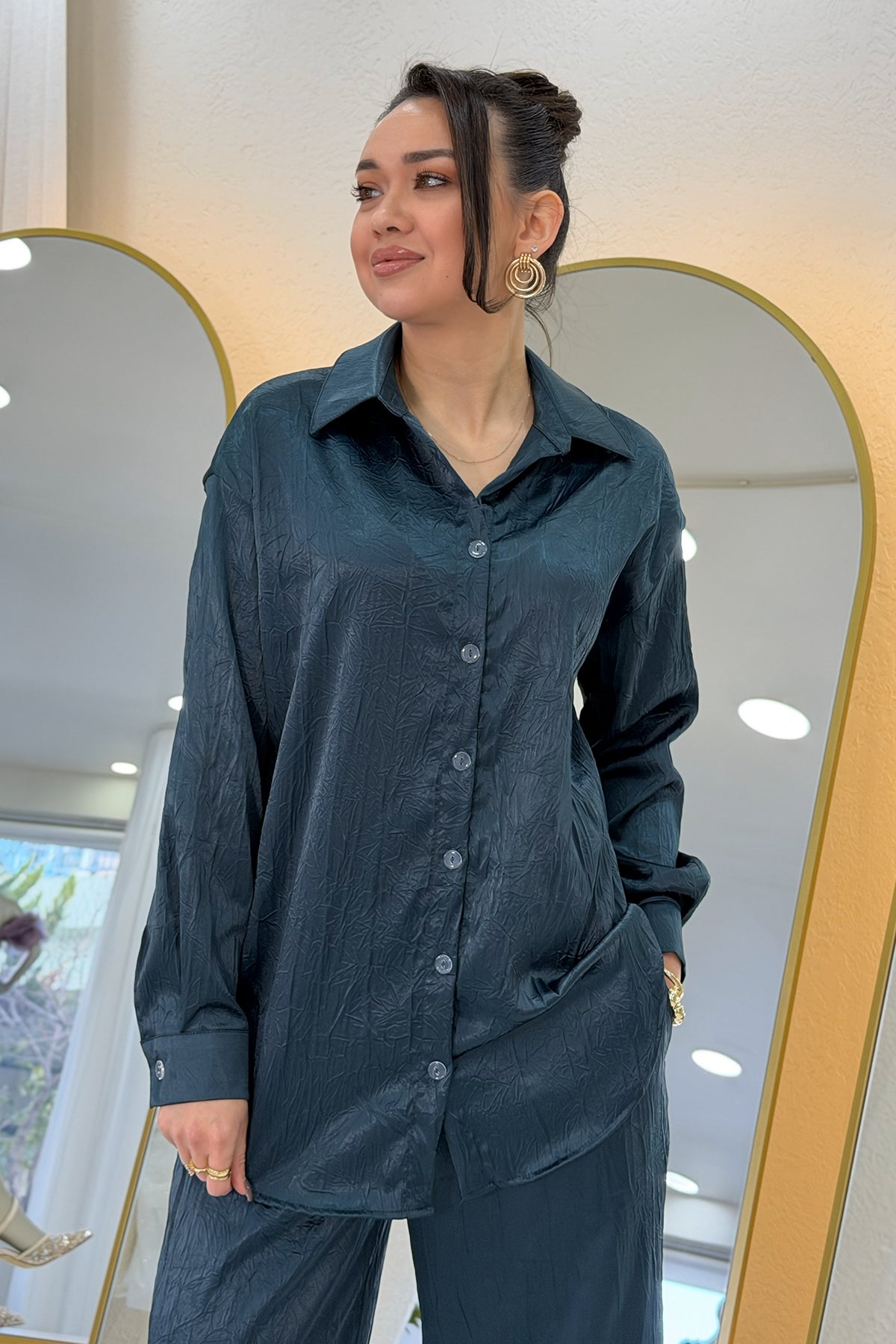 Petrol Mavi Saten Desenli Oversize  Gömlek Pantolon İkili Takım