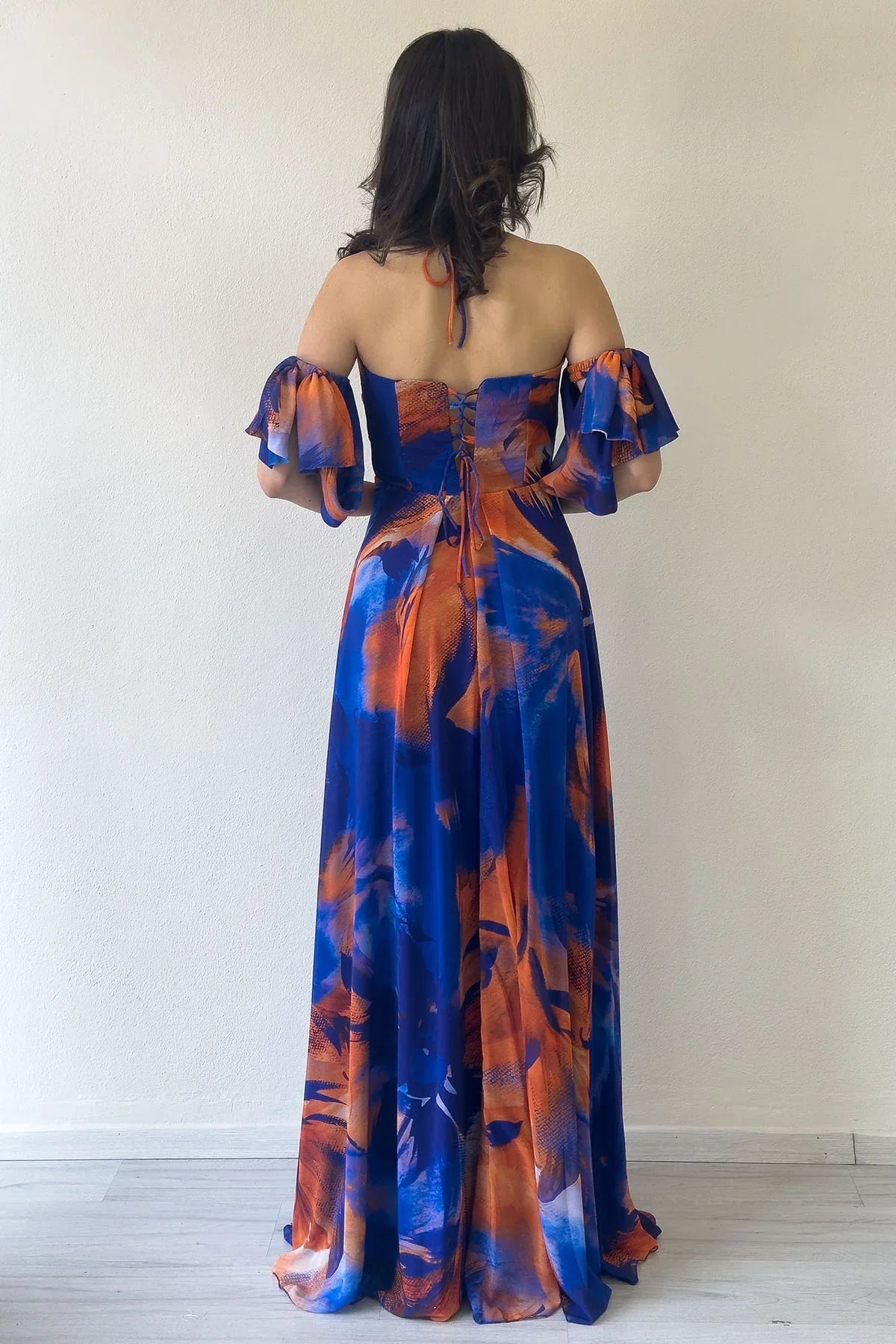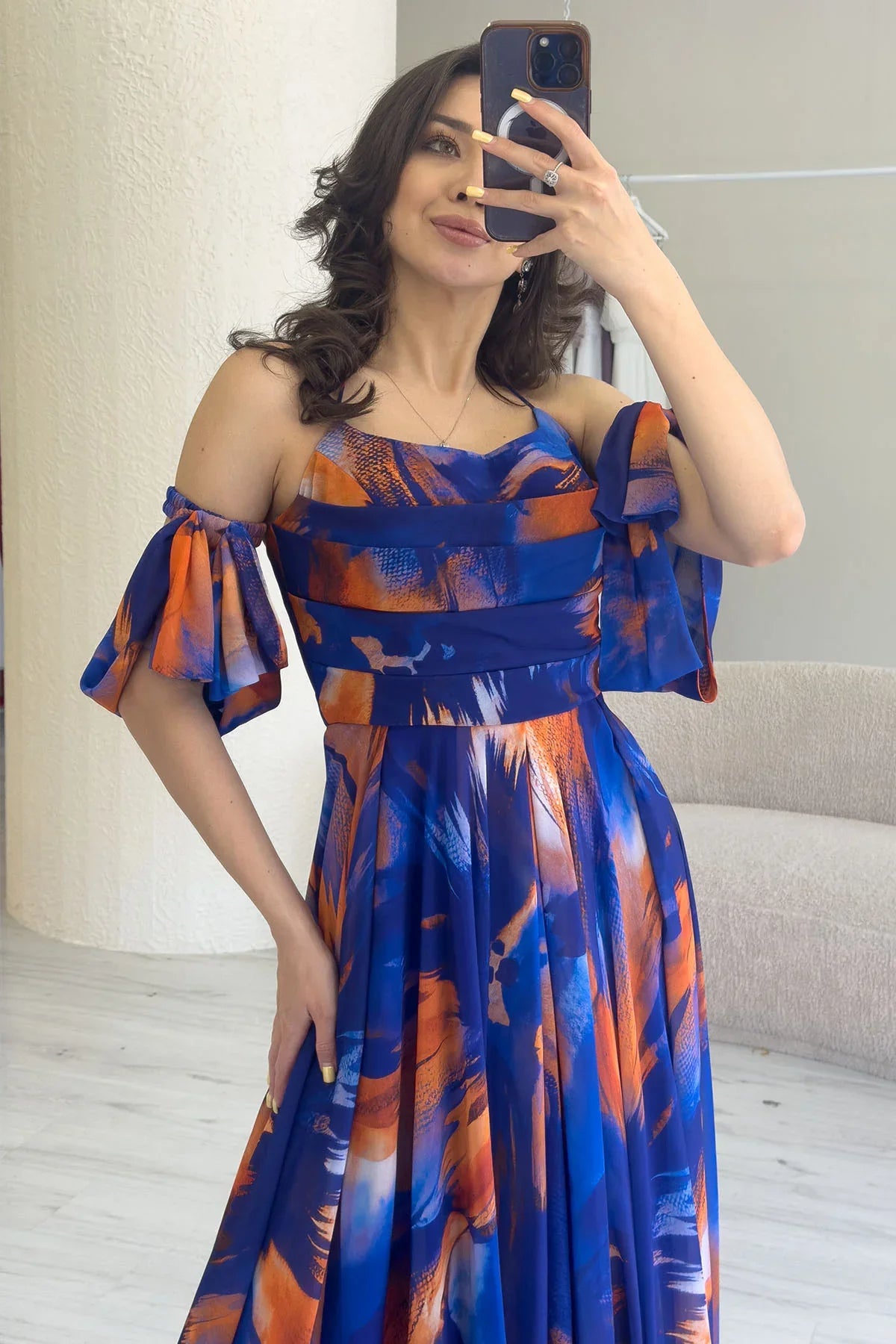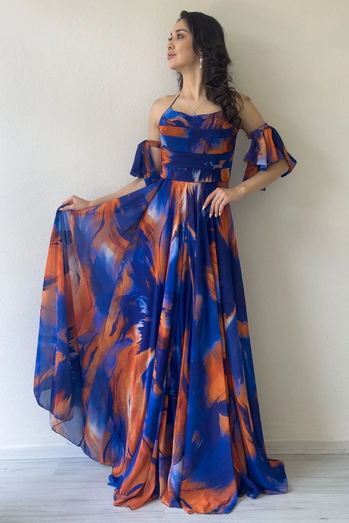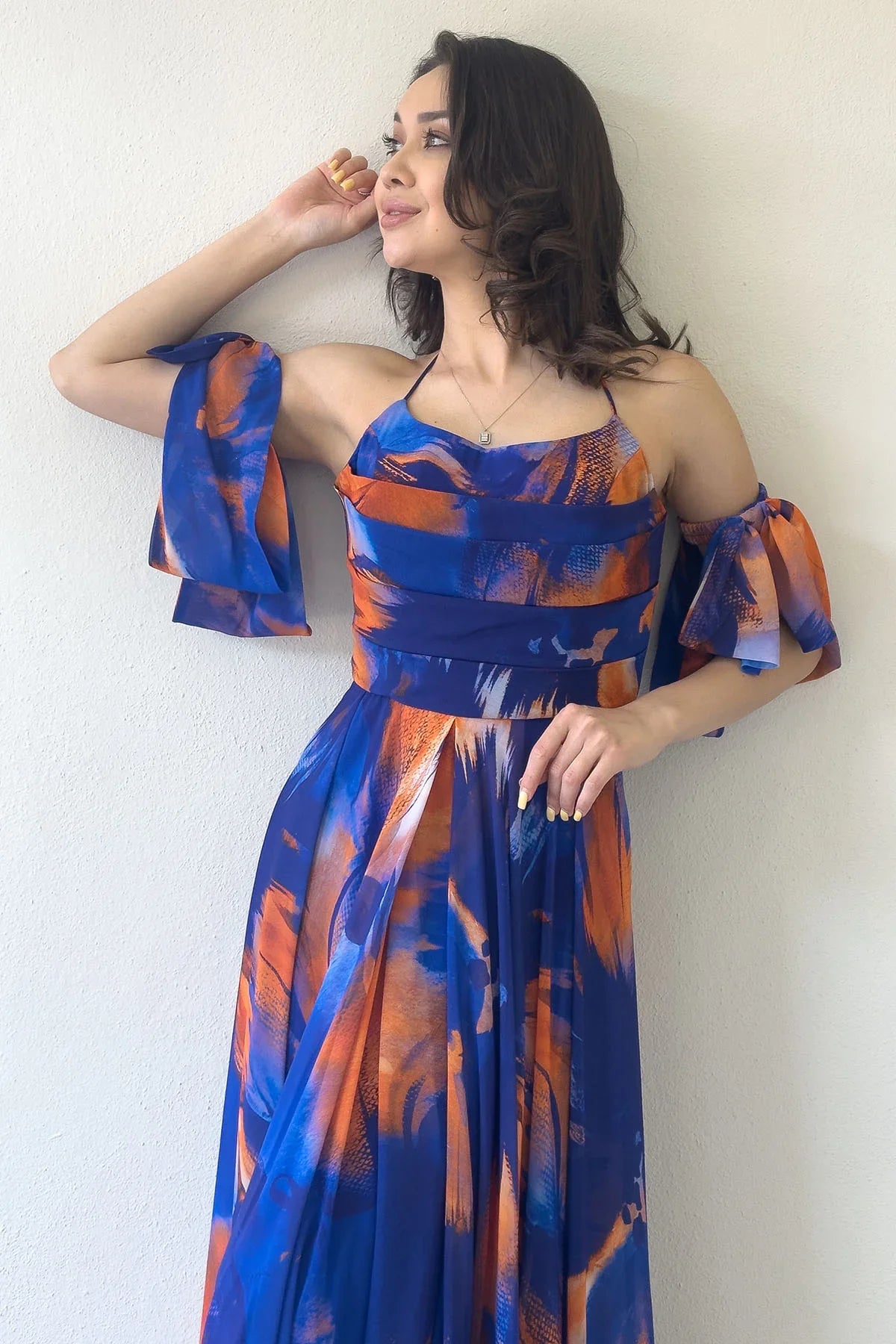 Saks Desenli Askılı Straplez Göğüs Drapeli Çıkarılabilir Kol Detaylı Abiye Elbise
