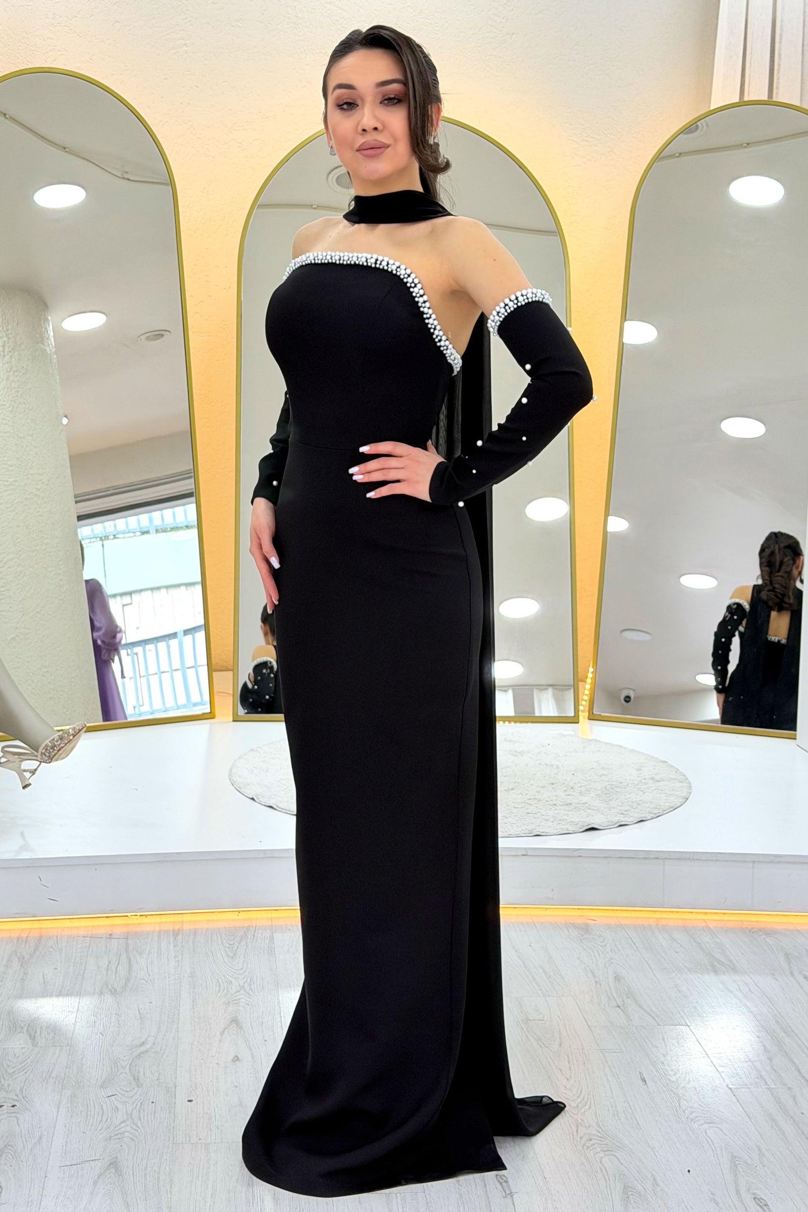 Siyah İncili Straplez Çıkarılabilir Kol Detaylı Uzun Abiye Elbise