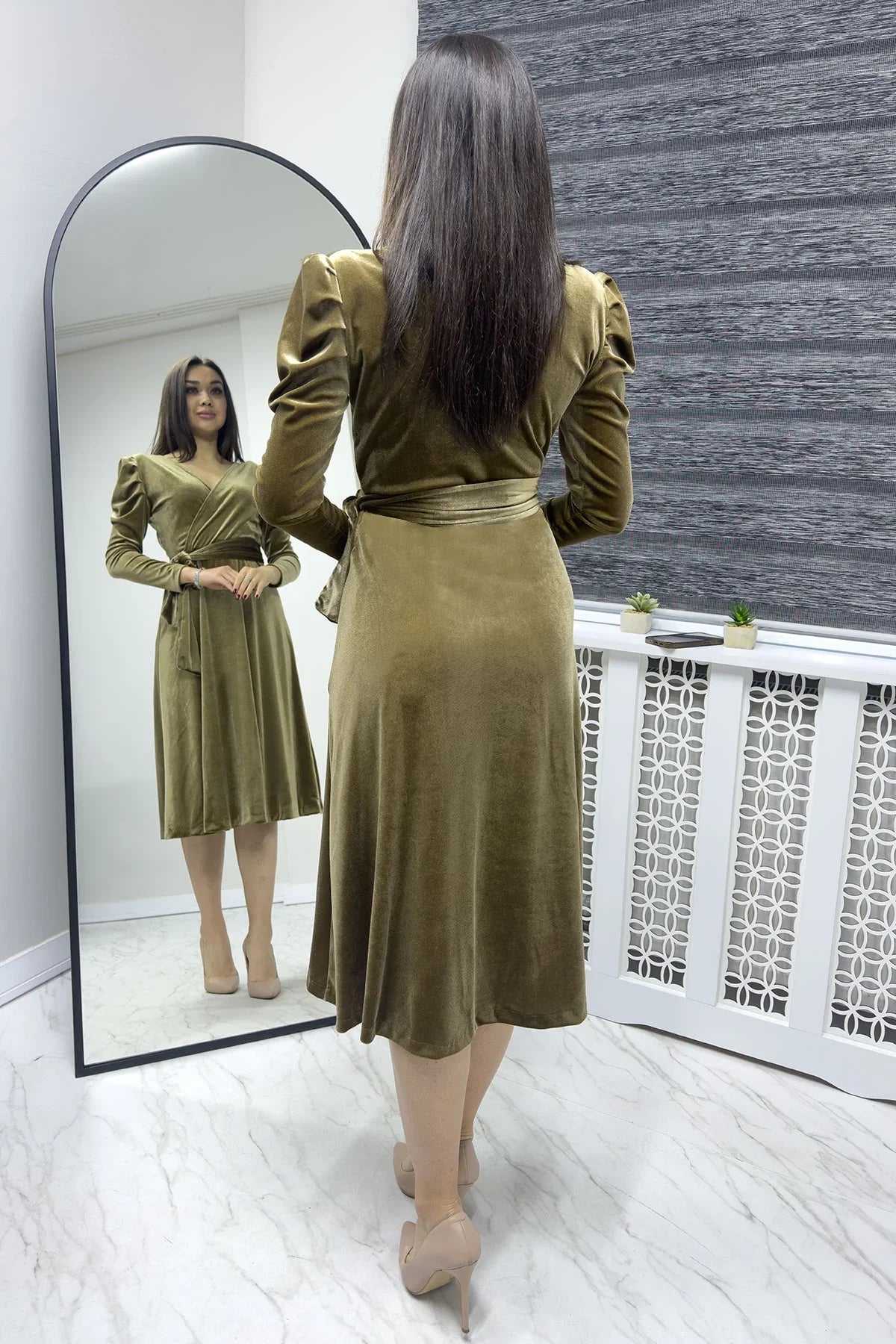 Bal Köpüğü Kadın Karpuz Kol Kruvaze Kadife Kuşaklı Büyük Beden Elbise